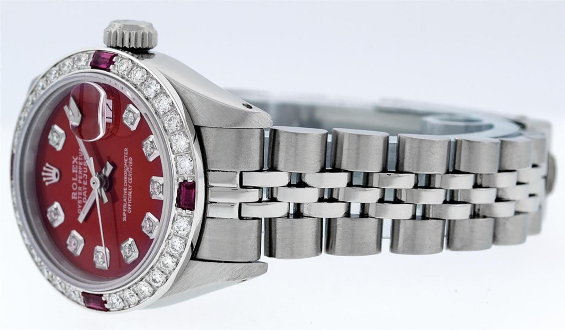One Ladies Stainless Steel Rolex Datejust Polished Bright with Satin Finish, Serviced & Electronically Tested, Stainless Steel Case: 26mm, Stainless Steel Crown, Custom Bezel: New 18K White Gold Ruby Beadset Diamond Bezel, Diamond + Gem Count: 28 Diamonds + 4 Rubies. Total Weight .70 Carat, Clarity: SI-VS, Color: G to H. Custom Crystal: New Scratch Resistant Synthetic Sapphire Cyclops Lens. Custom Hands: New Luminescent Hands. Movement: Automatic Winding Movement. Custom Dial: Refinished Red With Diamond Hour Markers, 10 Diamonds in Dial G To H In Color, Clarity: SI-VS. Date Window: 3 O'Clock Position Date Display, Model: Datejust. Condition: G-6 Extra Fine. Bracelet: Stainless Steel Jubilee. Polish & Satin Finish. 6.0 Inch Length, Adjustable. Standard Clasp, With Rolex Logo. This Watch Has Been Serviced Time Tested And Is In Excellent Condition It Is Free Of All Scratches And Dents.
