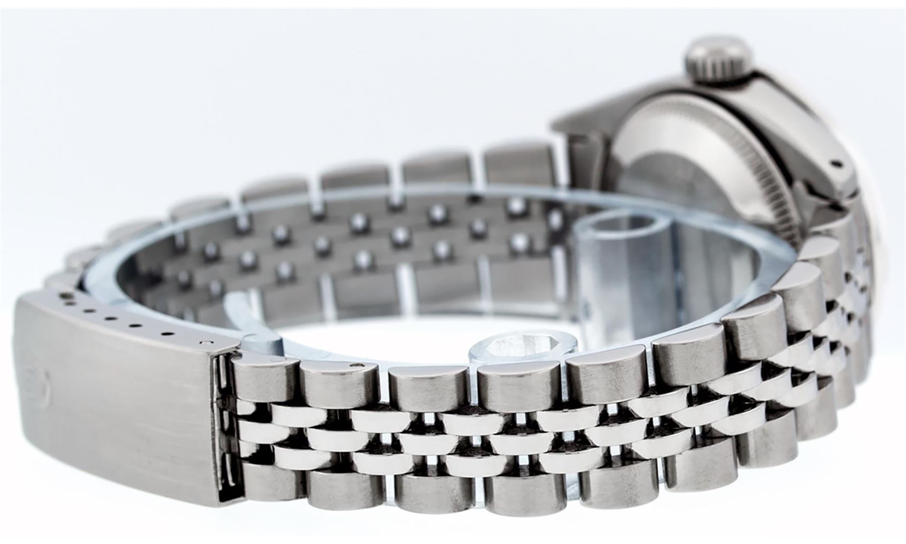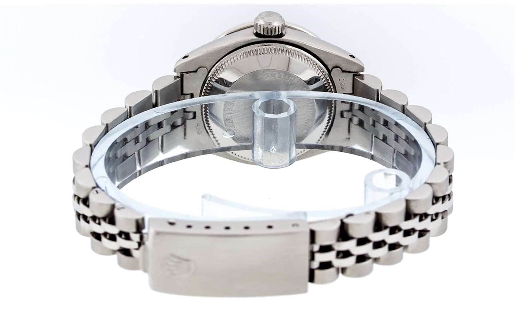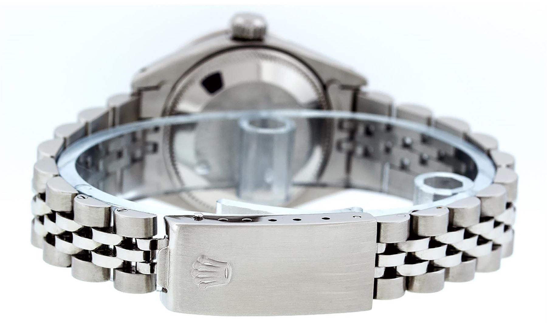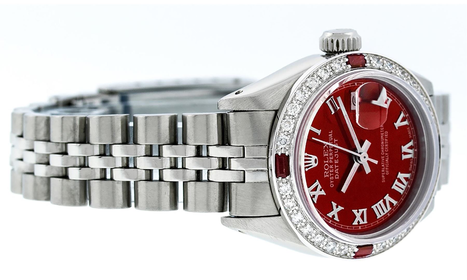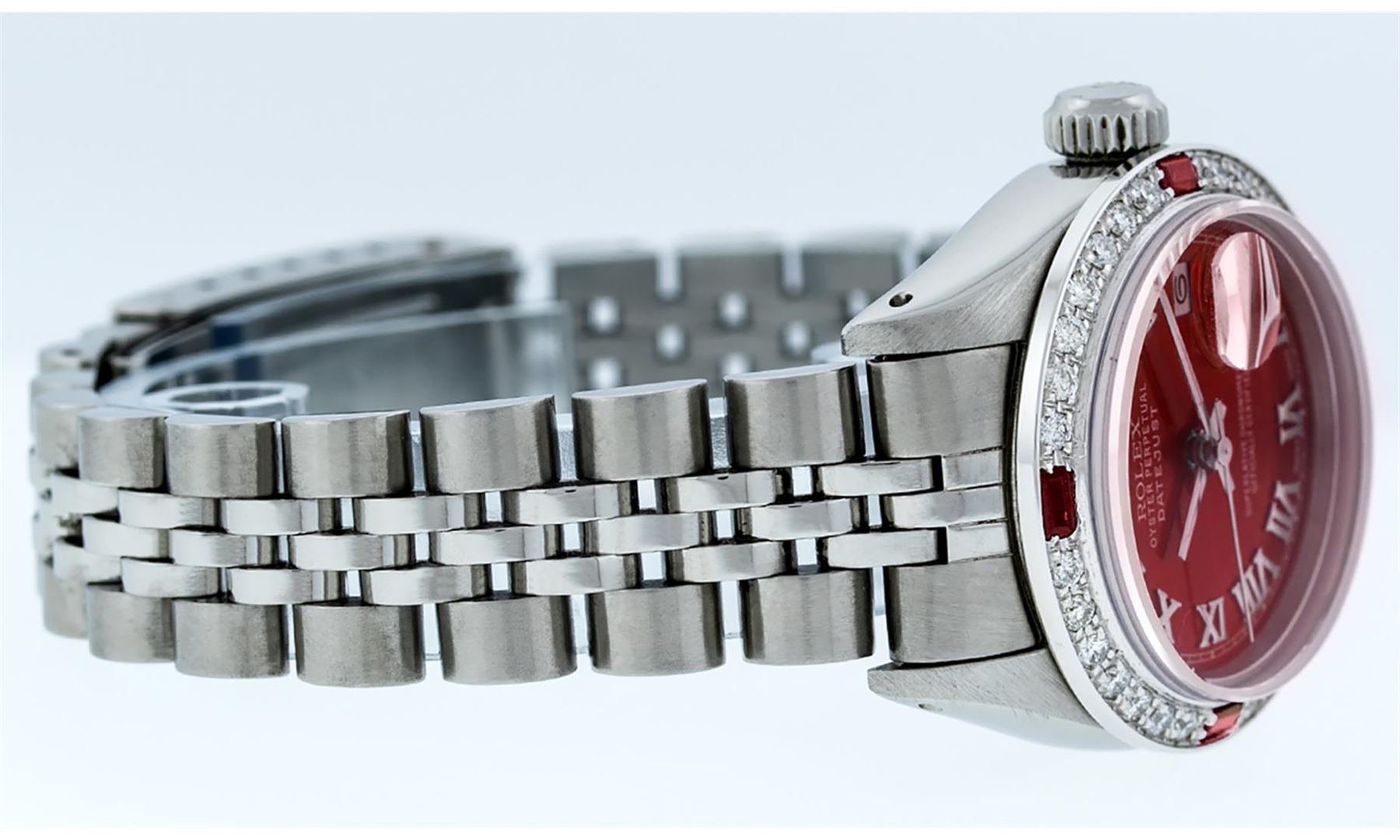 One Ladies Pre Owned Stainless Steel Rolex Datejust Polished Bright with Satin Finish, Serviced & Electronically Tested, Stainless Steel Case: 26mm, Stainless Steel Crown, Custom Bezel: New 18K White Gold Ruby Beadset Diamond Bezel, Diamond + Gem Count: 2