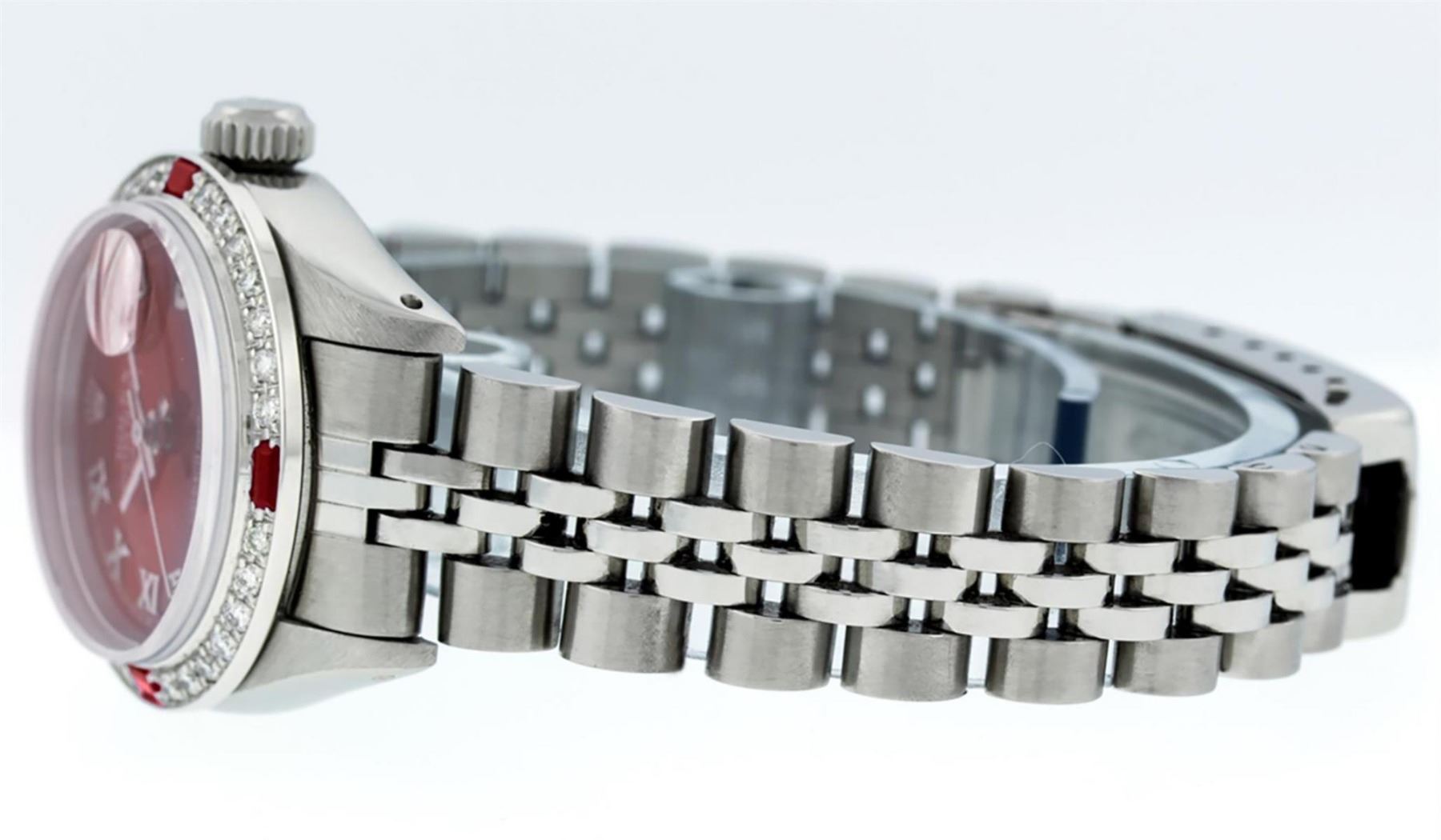 One Ladies Stainless Steel Rolex Datejust Polished Bright with Satin Finish, Serviced & Electronically Tested, Stainless Steel Case: 26mm, Stainless Steel Crown, Custom Bezel: New 18K White Gold Ruby Beadset Diamond Bezel, Diamond + Gem Count: 28 Diamonds + 4 Rubies, Total Weight .70 Carat, Clarity: SI-VS, Color: G to H. Custom Crystal: New Scratch Resistant Synthetic Sapphire Cyclops Lens. Custom Hands: New Luminescent Hands. Movement: Automatic Winding Movement. Custom Dial: Red Roman Dial With Square Track. Date Window: 3 O'Clock Position Date Display, Model: Datejust. Condition: G-6 Extra Fine. Bracelet: Stainless Steel Jubilee Band. Bright Polish & Satin Finish. 6.0 Inch Length, Adjustable. Standard Clasp, With Rolex Logo. This Watch Has Been Serviced Time Tested And Is In Excellent Condition It Is Free Of All Scratches And Dents.