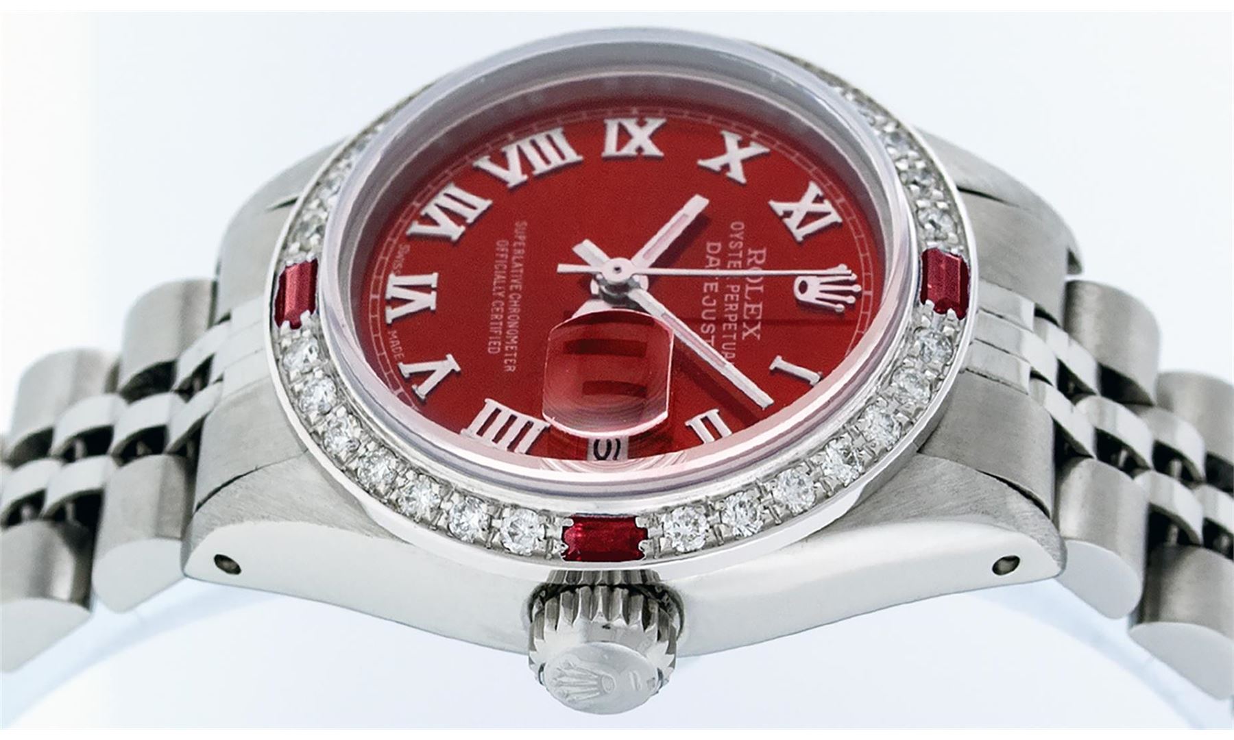 One Ladies Stainless Steel Rolex Datejust Polished Bright with Satin Finish, Serviced & Electronically Tested, Stainless Steel Case: 26mm, Stainless Steel Crown, Custom Bezel: New 18K White Gold Ruby Beadset Diamond Bezel, Diamond + Gem Count: 28 Diamonds + 4 Rubies, Total Weight .70 Carat, Clarity: SI-VS, Color: G to H. Custom Crystal: New Scratch Resistant Synthetic Sapphire Cyclops Lens. Custom Hands: New Luminescent Hands. Movement: Automatic Winding Movement Caliber 2030. Custom Dial: Red Roman Dial With Square Track. Date Window: 3 O'Clock Position Date Display, Model: Datejust. Condition: G-6 Extra Fine. Bracelet: Stainless Steel Jubilee. Bright Polish & Satin Finish. 6.0 Inch Length, Adjustable. Standard Clasp, With Rolex Logo. This Watch Has Been Serviced Time Tested And Is In Excellent Condition It Is Free Of All Scratches And Dents.