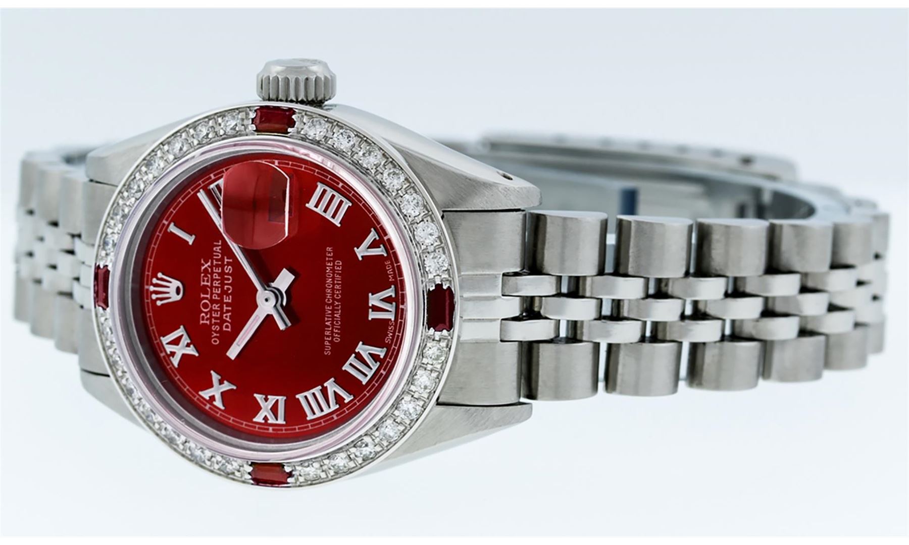 One Ladies Stainless Steel Rolex Datejust Polished Bright with Satin Finish, Serviced & Electronically Tested, Stainless Steel Case: 26mm, Stainless Steel Crown, Custom Bezel: New 18K White Gold Ruby Beadset Diamond Bezel, Diamond + Gem Count: 28 Diamonds + 4 Rubies, Total Weight .70 Carat, Clarity: SI-VS, Color: G to H. Custom Crystal: New Scratch Resistant Synthetic Sapphire Cyclops Lens. Custom Hands: New Luminescent Hands. Movement: Automatic Winding Movement Caliber 2030. Custom Dial: Red Roman Dial With Square Track. Date Window: 3 O'Clock Position Date Display, Model: Datejust. Condition: G-6 Extra Fine. Bracelet: Stainless Steel Jubilee. Bright Polish & Satin Finish. 6.0 Inch Length, Adjustable. Standard Clasp, With Rolex Logo. This Watch Has Been Serviced Time Tested And Is In Excellent Condition It Is Free Of All Scratches And Dents.