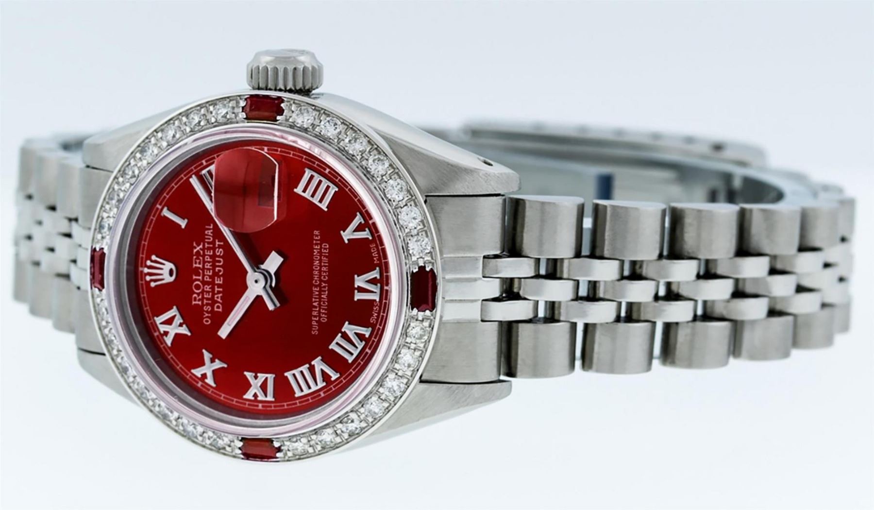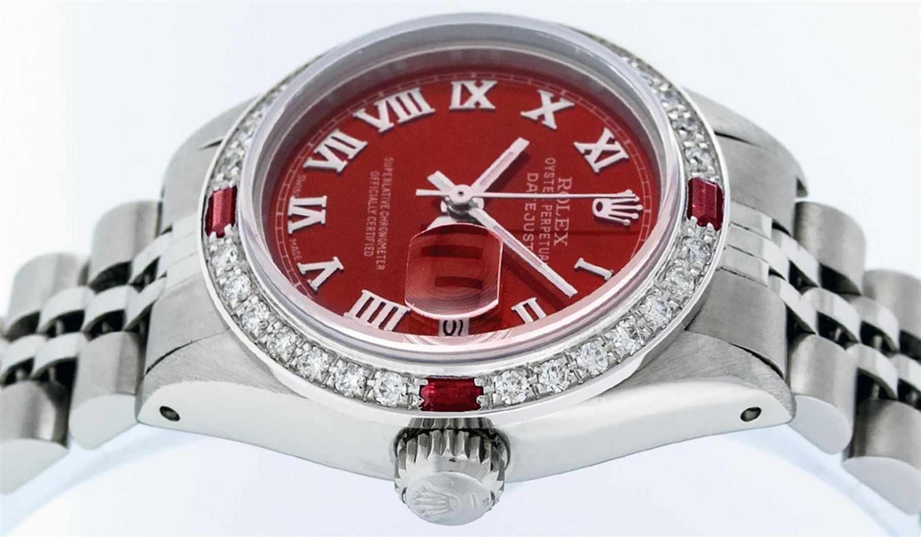 One Ladies Stainless Steel Rolex Datejust Polished Bright with Satin Finish, Serviced & Electronically Tested, Stainless Steel Case: 26mm, Stainless Steel Crown, Custom Bezel: New 18K White Gold Ruby Beadset Diamond Bezel, Diamond + Gem Count: 28 Diamonds + 4 Rubies, Total Weight .70 Carat, Clarity: SI-VS, Color: G to H. Custom Crystal: New Scratch Resistant Synthetic Sapphire Cyclops Lens. Custom Hands: New Luminescent Hands. Movement: Automatic Winding Movement. Custom Dial: Red Roman Dial With Square Track. Date Window: 3 O'Clock Position Date Display, Model: Datejust. Condition: G-6 Extra Fine. Bracelet: Stainless Steel Jubilee. Bright Polish & Satin Finish. 6.0 Inch Length, Adjustable. Standard Clasp, With Rolex Logo. This Watch Has Been Serviced Time Tested And Is In Excellent Condition It Is Free Of All Scratches And Dents.