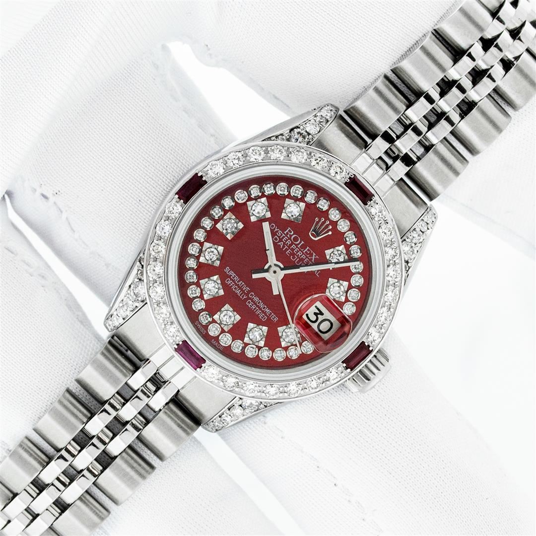 One Ladies Stainless Steel Rolex Datejust Polished Bright with Satin Finish, Serviced & Electronically Tested, Rolex Stainless Steel Case: 26mm, Rolex Stainless Steel Crown. Custom Bezel: New 18K White Gold Beadset & Ruby Diamond Bezel, Custom Diamond Count: 28 Diamonds + 4 Rubies. Total Weight .70 Carat, Clarity: SI-VS, Color: G to H. Custom Crystal: New Sapphire With Magnified Date Window. Custom Hands: New Luminescent Hands. Rolex Movement: Automatic Winding Movement. Custom Dial: Refinished To Red With Added Diamonds, Stone Count: 43 Diamonds On Dial, G To H In Color, Clarity: SI-VS. Date Window: 3 O'clock Position Date Display, Model: Datejust. Condition: G-6 Extra Fine. Rolex Bracelet: Stainless Steel Jubilee Band. Bright Polish & Satin Finish. 6.0 Inch Length, Adjustable. Standard Clasp, With Rolex Logo. This Pre Owned Watch Has Been Serviced Time Tested And Is In Excellent Condition It Is Free Of All Scratches And Dents. This Watch Comes With A Rolex Box.