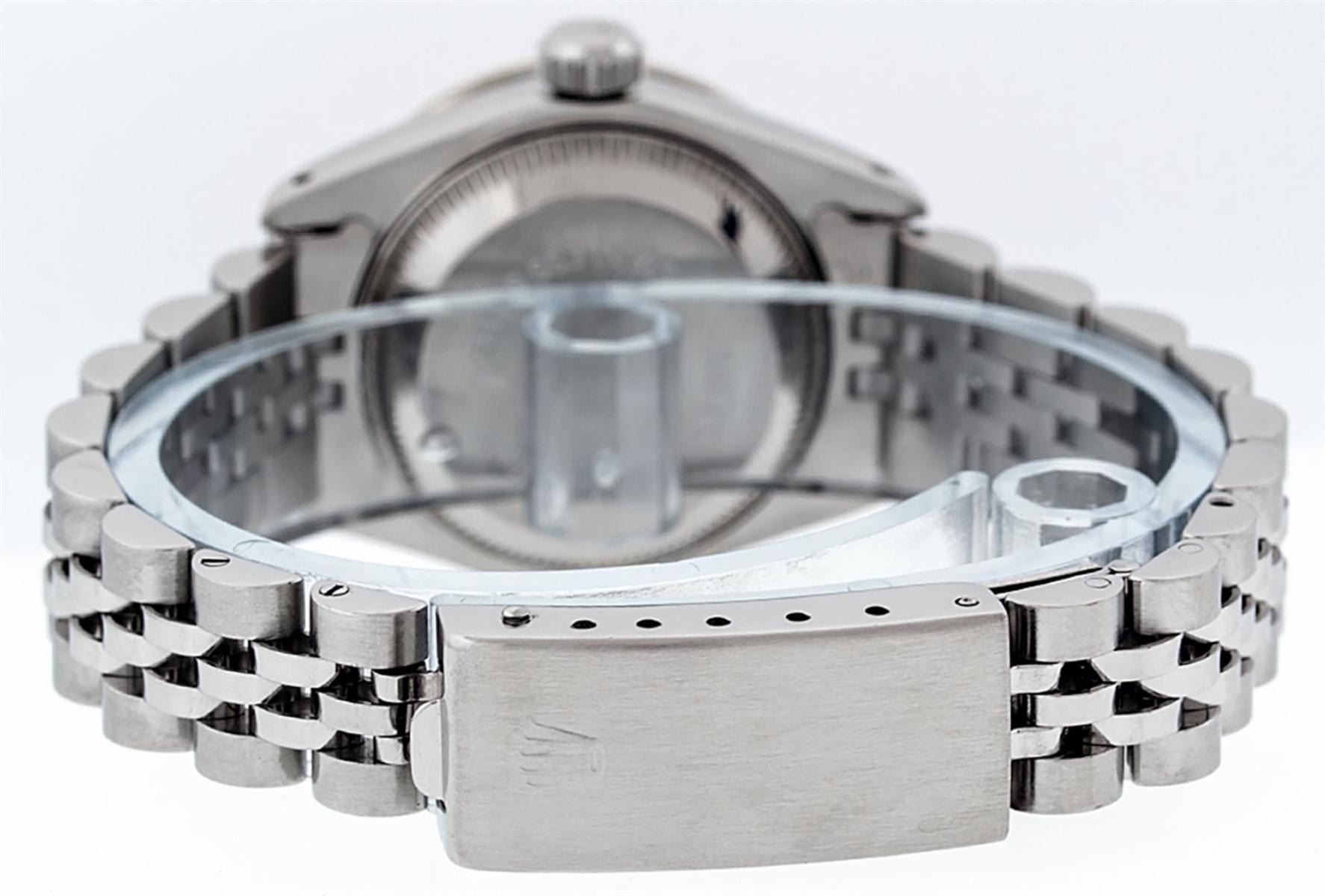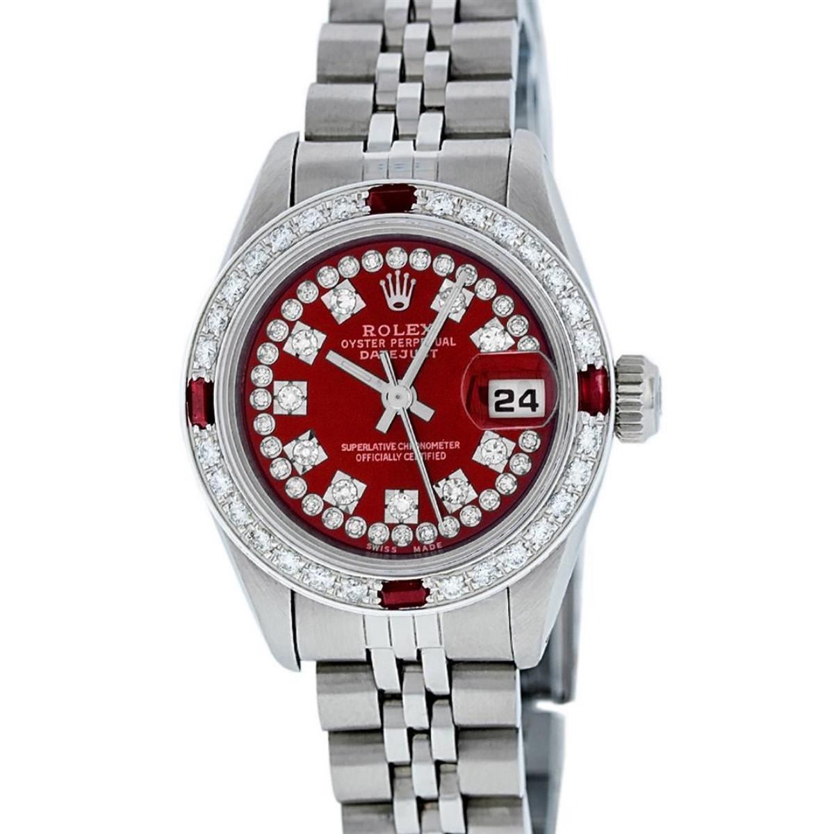 One Ladies Stainless Steel Rolex Datejust Polished Bright with Satin Finish, Serviced & Electronically Tested, Stainless Steel Case: 26mm, Stainless Steel Crown. Custom Bezel: New 18K White Gold Beadset & Ruby Diamond Bezel, Diamond Count: 28 Diamonds + 4 Rubies. Total Weight .70 Carat, Clarity: SI-VS, Color: G to H. Custom Crystal: New Scratch Resistant Synthetic Sapphire Cyclops Lens. Custom Hands: New Luminescent Hands. Movement: Automatic Winding Movement. Custom Dial: Refinished Red String Single Cut Diamond Dial, Stone Count: 43 Diamonds On Dial, G To H In Color, Clarity: SI-VS. Date Window: 3 O'Clock Position Date Display, Model: Datejust. Condition: G-6 Extra Fine. Bracelet: Stainless Steel Jubilee Band. Bright Polish & Satin Finish. 6.0 Inch Length, Adjustable. Standard Clasp, With Rolex Logo. This Watch Has Been Serviced Time Tested And Is In Excellent Condition It Is Free Of All Scratches And Dents.