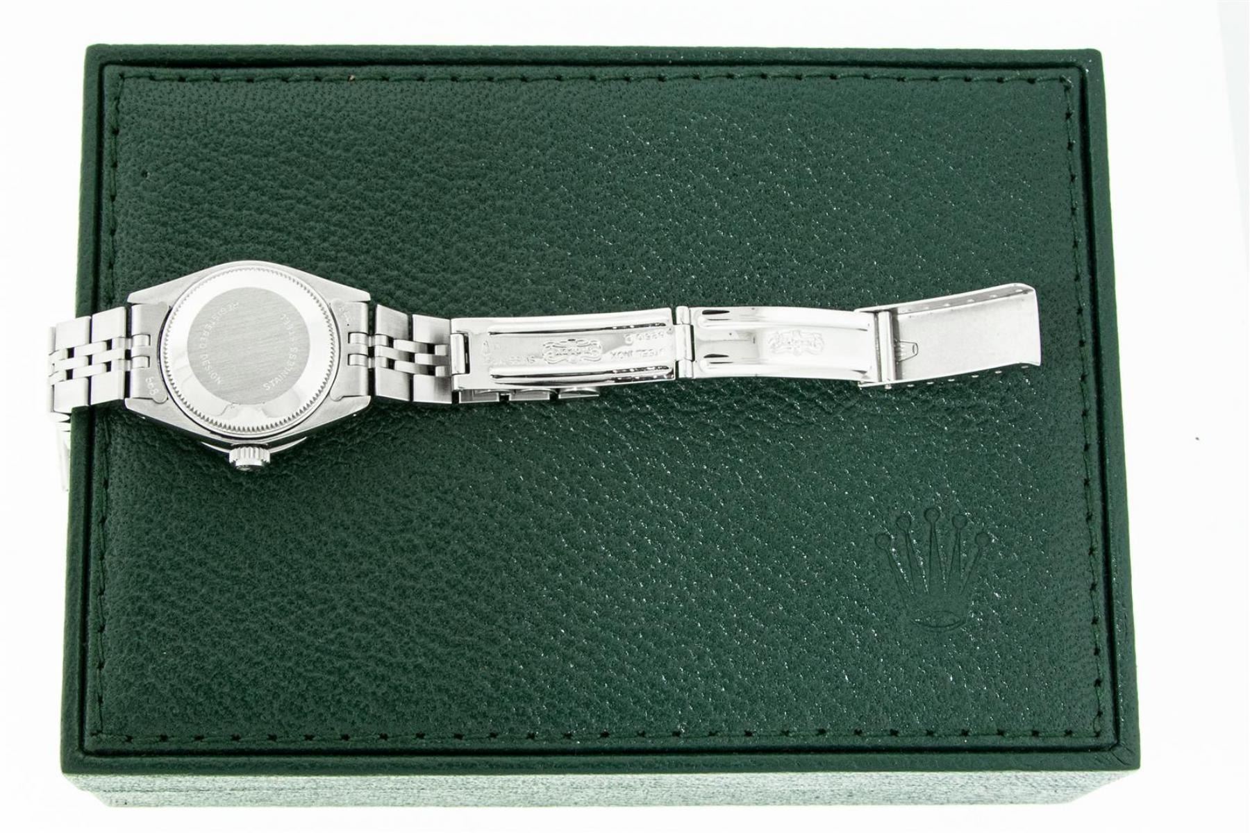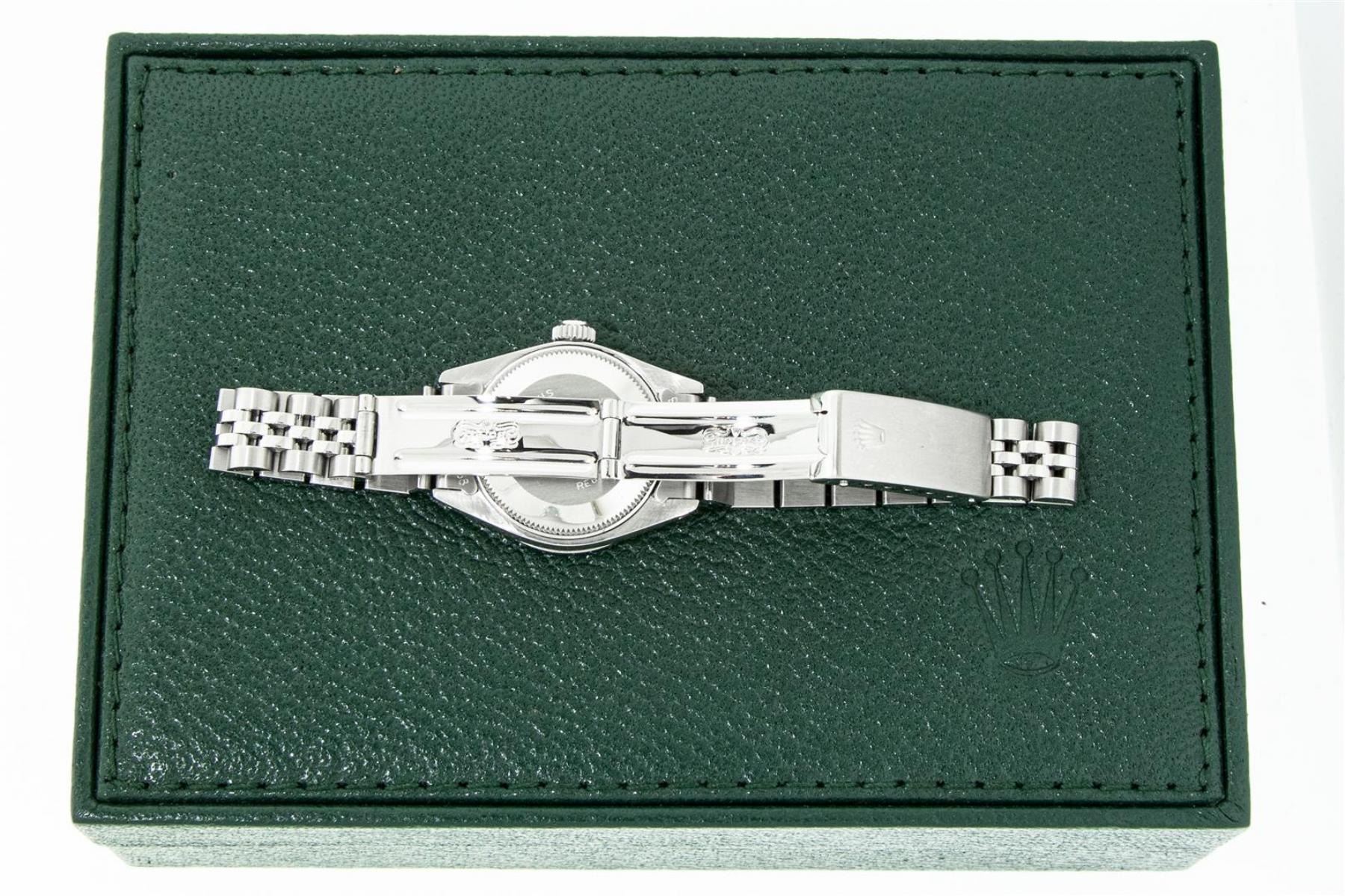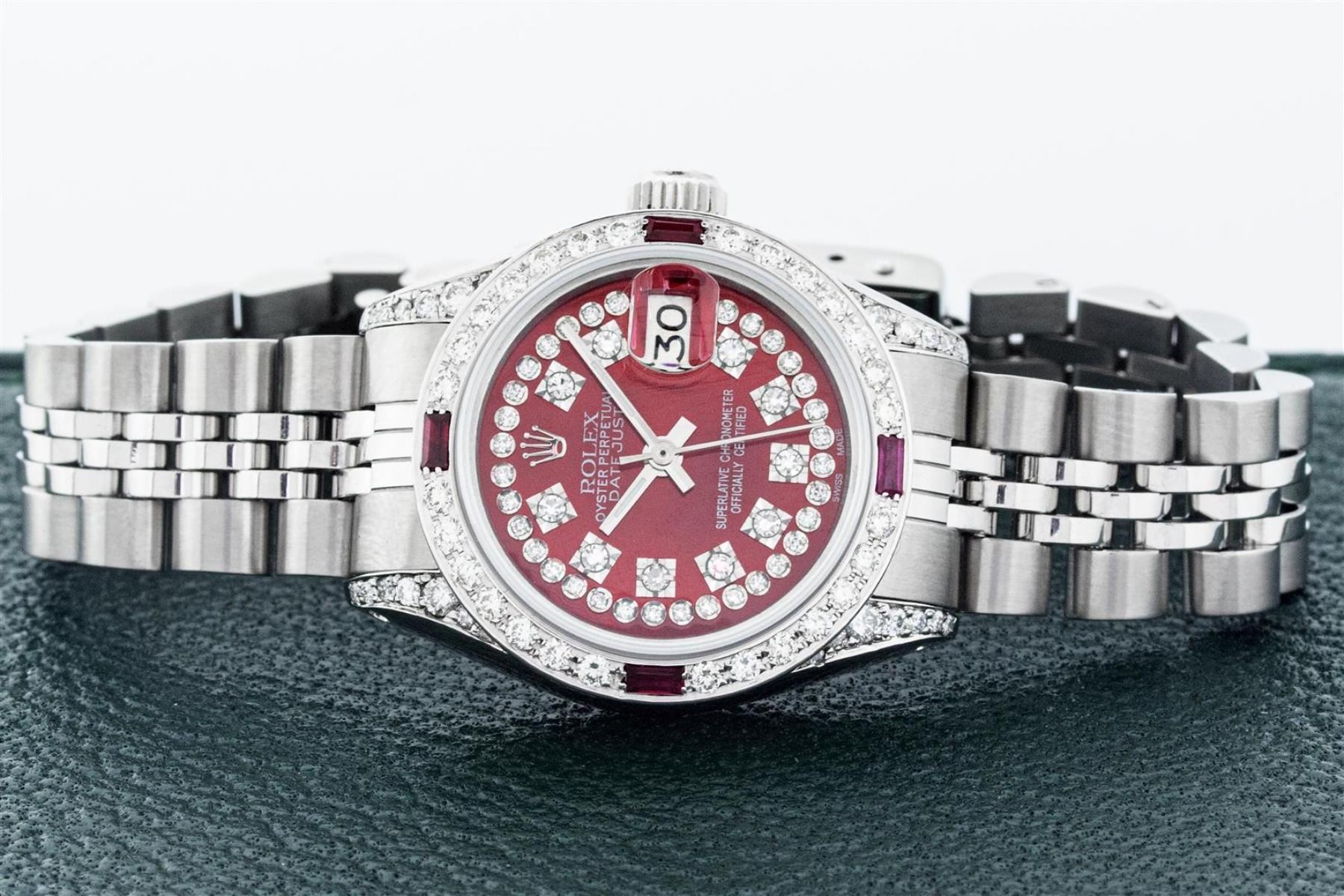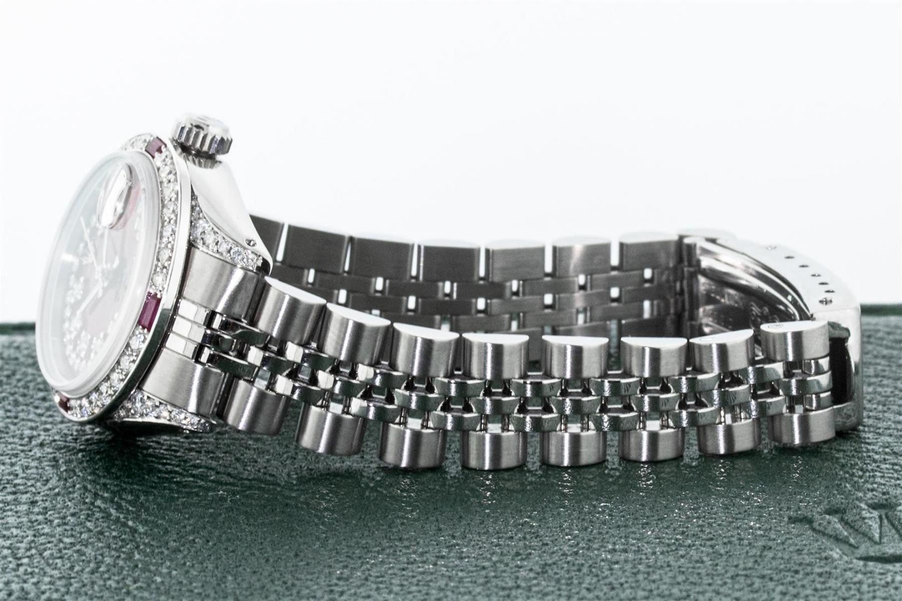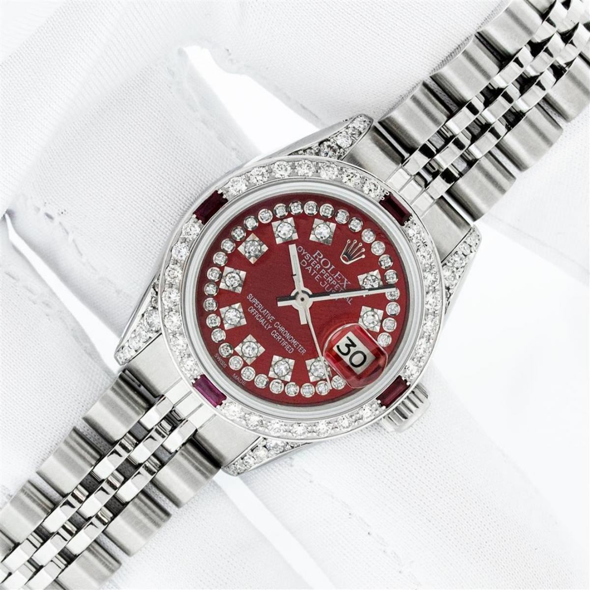 One Ladies Stainless Steel Rolex Datejust Polished Bright with Satin Finish, Serviced & Electronically Tested, Stainless Steel Case: 26mm, Stainless Steel Crown. Custom Bezel: New 18K White Gold Beadset & Ruby Diamond Bezel, Diamond Count: 28 Diamonds + 4 Rubies. Total Weight .70 Carat, Clarity: SI-VS, Color: G to H. Custom Crystal: New Scratch Resistant Synthetic Sapphire Cyclops Lens. Custom Hands: New Luminescent Hands. Movement: Automatic Winding Movement. Custom Dial: Refinished Red String Single Cut Diamond Dial, Stone Count: 43 Diamonds On Dial, G To H In Color, Clarity: SI-VS. Date Window: 3 O'Clock Position Date Display, Model: Datejust. Condition: G-6 Extra Fine. Bracelet: Stainless Steel Jubilee Band. Bright Polish & Satin Finish. 6.0 Inch Length, Adjustable. Standard Clasp, With Rolex Logo. This Watch Has Been Serviced Time Tested And Is In Excellent Condition It Is Free Of All Scratches And Dents. This Watch Comes With A Rolex Box.