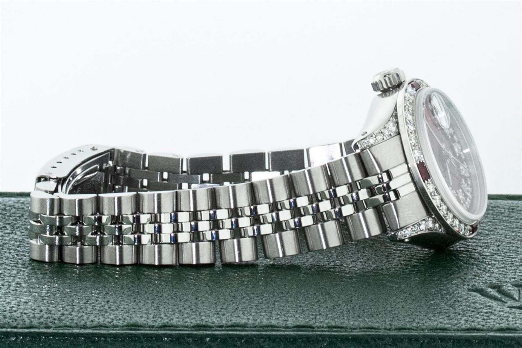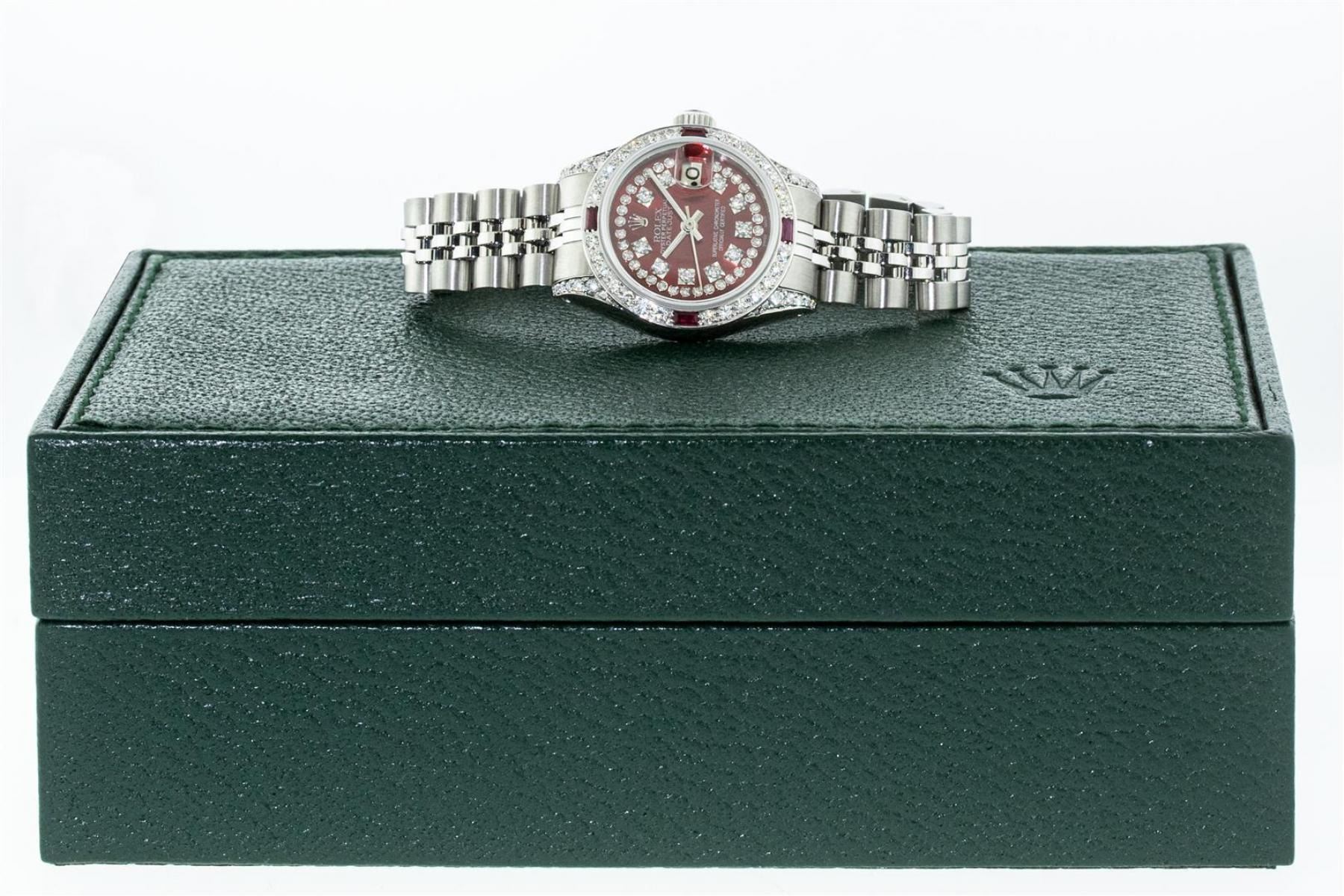 One Ladies Stainless Steel Rolex Datejust Polished Bright with Satin Finish, Serviced & Electronically Tested, Stainless Steel Case: 26mm, Stainless Steel Crown. Custom Bezel: New 18K White Gold Beadset & Ruby Diamond Bezel, Diamond Count: 28 Diamonds + 4 Rubies. Total Weight .70 Carat, Clarity: SI-VS, Color: G to H. Custom Crystal: New Scratch Resistant Synthetic Sapphire Cyclops Lens. Custom Hands: New Luminescent Hands. Movement: Automatic Winding Movement. Custom Dial: Refinished Red String Single Cut Diamond Dial, Stone Count: 43 Diamonds On Dial, G To H In Color, Clarity: SI-VS. Date Window: 3 O'Clock Position Date Display, Model: Datejust. Condition: G-6 Extra Fine. Bracelet: Stainless Steel Jubilee Band. Bright Polish & Satin Finish. 6.0 Inch Length, Adjustable. Standard Clasp, With Rolex Logo. This Watch Has Been Serviced Time Tested And Is In Excellent Condition It Is Free Of All Scratches And Dents. This Watch Comes With A Rolex Box.