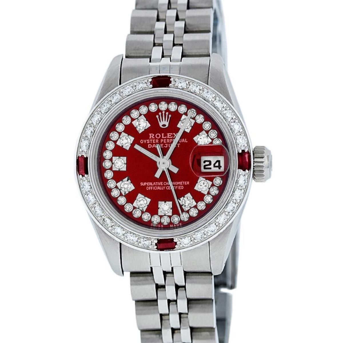 One Ladies Stainless Steel Rolex Datejust Polished Bright with Satin Finish, Serviced & Electronically Tested, Stainless Steel Case: 26mm, Stainless Steel Crown. Custom Bezel: New 18K White Gold Beadset & Ruby Diamond Bezel, Diamond Count: 28 Diamonds + 4 Rubies. Total Weight .70 Carat, Clarity: SI-VS, Color: G to H. Custom Crystal: New Scratch Resistant Synthetic Sapphire Cyclops Lens. Custom Hands: New Luminescent Hands. Movement: Automatic Winding Movement Caliber 2030. Custom Dial: Refinished Red String Single Cut Diamond Dial, Stone Count: 43 Diamonds On Dial, G To H In Color, Clarity: SI-VS. Date Window: 3 O'Clock Position Date Display, Model: Datejust. Condition: G-6 Extra Fine. Bracelet: Stainless Steel Jubilee Band. Bright Polish & Satin Finish. 6.0 Inch Length, Adjustable. Standard Clasp, With Rolex Logo. This Watch Has Been Serviced Time Tested And Is In Excellent Condition It Is Free Of All Scratches And Dents.