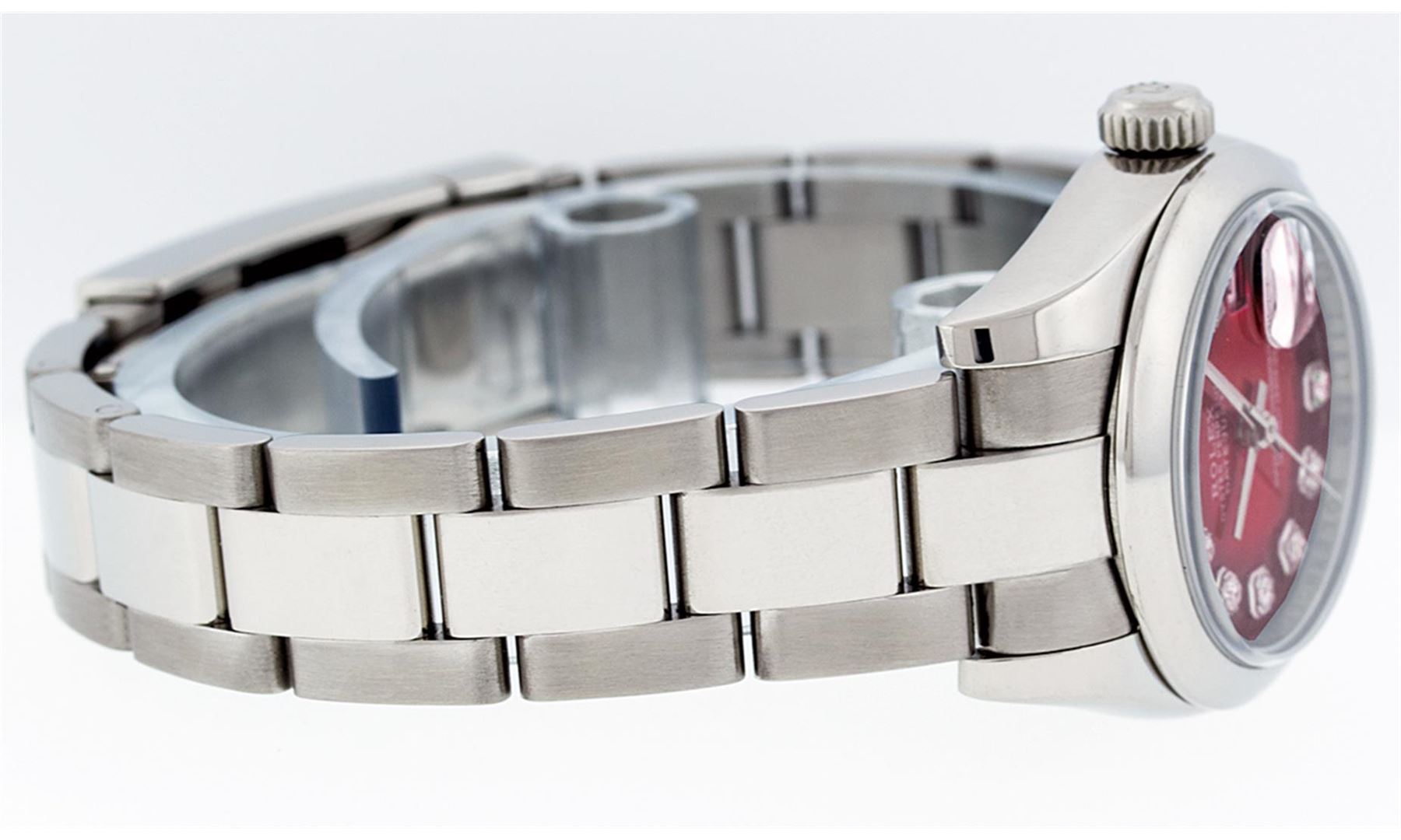 One Ladies Quickset Stainless Steel Rolex Datejust Polished Bright with Satin Finish, Serviced & Electronically Tested, Stainless Steel Case: 26mm, Stainless Steel Crown, Bezel: Stainless Steel Smooth Bezel. Custom Crystal: New Scratch Resistant Sapphire Cyclops Lens. Custom Hands: New Luminescent Hands. Movement: Automatic Winding Movement Caliber 2235. Custom Dial: Red Vignette Single Cut VS Diamond Dial, Diamond Count: 10 Single Cut Diamonds In Dial, Color: G to H, Clarity: VS. Date Window: 3 O'Clock Position Date Display, Model: 179160 Quickset Datejust. Condition: G-6 Extra Fine. Bracelet: Stainless Steel Oyster Band. Bright Polish & Satin Finish. 6.0 Inch Length, Adjustable. Standard Clasp, With Rolex Logo. This Watch Has Been Serviced Time Tested And Is In Excellent Condition It Is Free Of All Scratches And Dents. This Watch Comes With A Rolex Box.