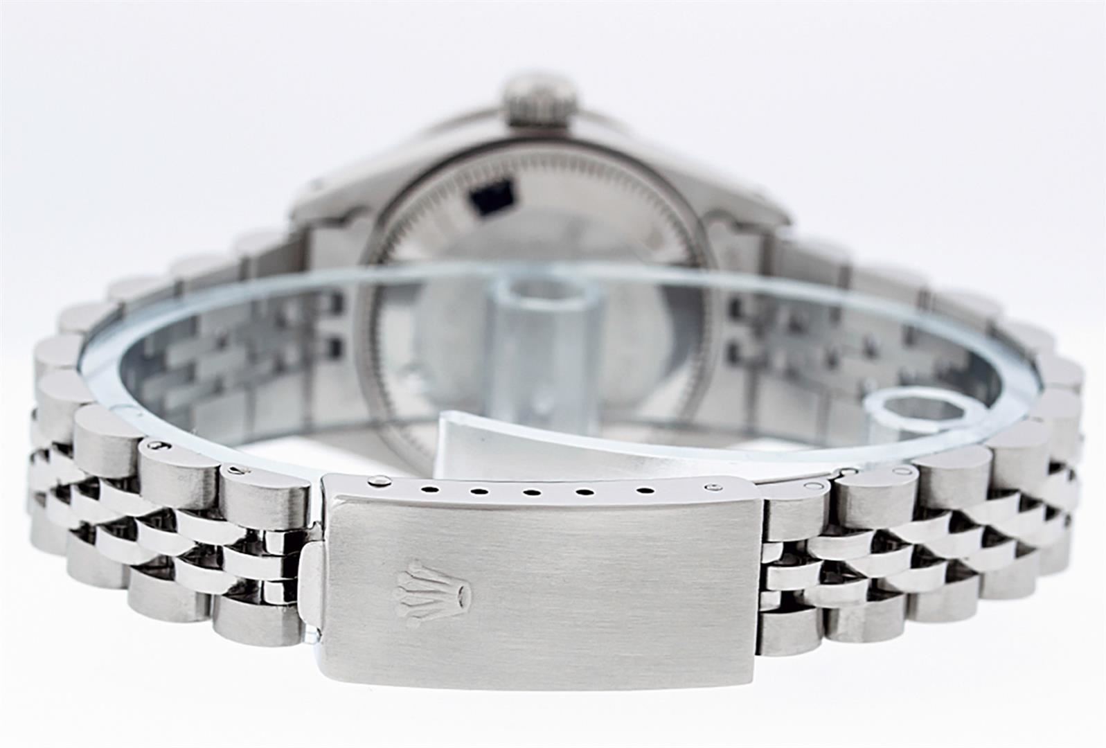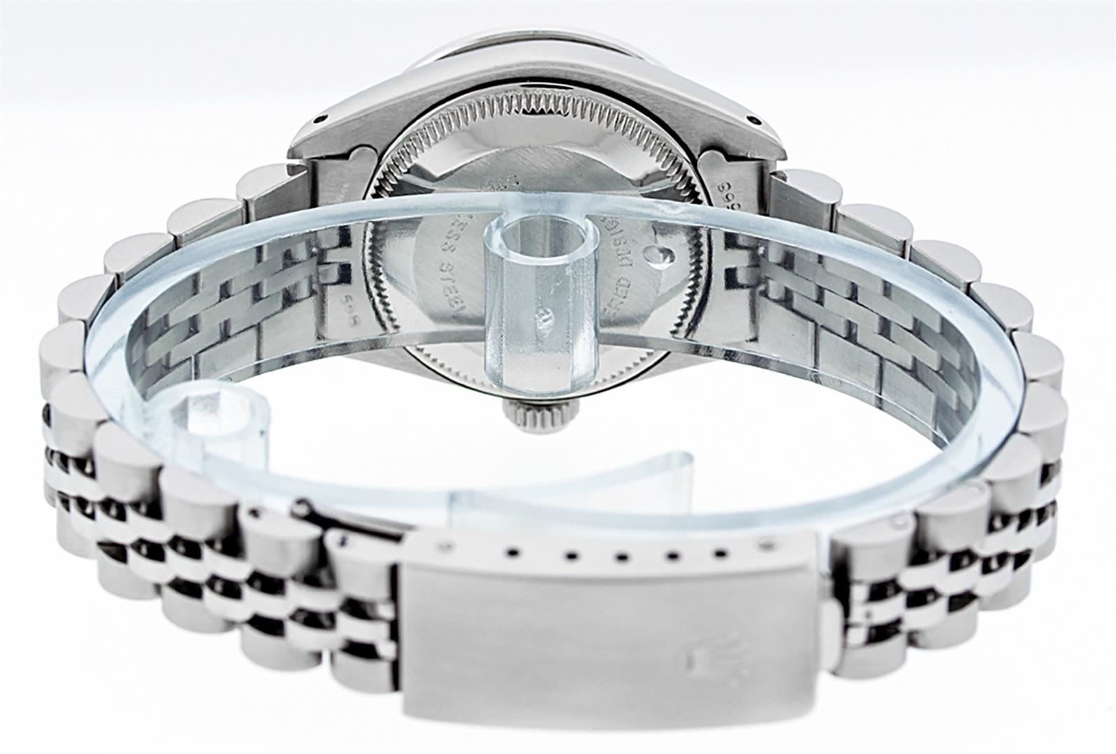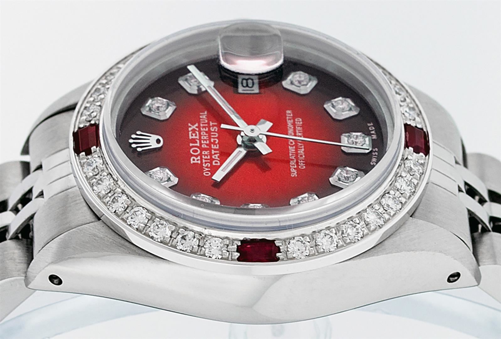 One Ladies Stainless Steel Rolex Datejust Polished Bright with Satin Finish, Serviced & Electronically Tested, Stainless Steel Case: 26mm, Stainless Steel Crown, Custom Bezel: New 18K White Gold Ruby Beadset Diamond Bezel, Diamond + Gem Count: 28 Diamonds + 4 Rubies. Total Weight .70 Carat, Clarity: SI-VS, Color: G to H. Custom Crystal: New Synthetic Sapphire Cyclops Lens. Custom Hands: New Luminescent Hands. Movement: Automatic Winding Movement Caliber 2030. Custom Dial: Refinished Red Vignette With Diamond Hour Markers, 10 Diamond in Dial G To H In Color, Clarity: SI-VS. Date Window: 3 O'clock Position Date Display, Model: Datejust. Condition: G-6 Extra Fine. Bracelet: Stainless Steel Jubilee. Bright Polish & Satin Finish. 6.0 Inch Length, Adjustable. Standard Clasp, With Rolex Logo. This Watch Has Been Serviced Time Tested And Is In Excellent Condition It Is Free Of All Scratches And Dents.