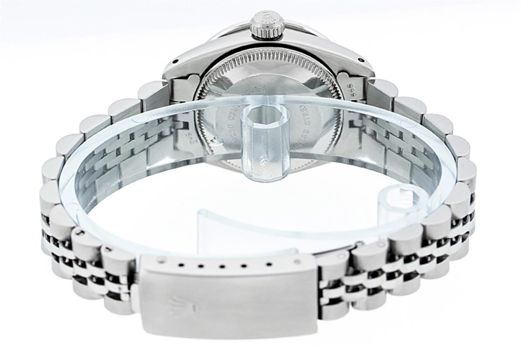 One Ladies Stainless Steel Rolex Datejust Polished Bright with Satin Finish, Serviced & Electronically Tested, Stainless Steel Case: 26mm, Stainless Steel Crown, Custom Bezel: New 18K White Gold Ruby Beadset Diamond Bezel, Diamond + Gem Count: 28 Diamonds + 4 Rubies. Total Weight .70 Carat, Clarity: SI-VS, Color: G to H. Custom Crystal: New Synthetic Sapphire Cyclops Lens. Custom Hands: New Luminescent Hands. Movement: Automatic Winding Movement. Custom Dial: Refinished Red Vignette With Diamond Hour Markers, 10 Diamond in Dial G To H In Color, Clarity: SI-VS. Date Window: 3 O'Clock Position Date Display, Model: Datejust. Condition: G-6 Extra Fine. Bracelet: Stainless Steel Jubilee. Bright Polish & Satin Finish. 6.0 Inch Length, Adjustable. Standard Clasp, With Rolex Logo. This Watch Has Been Serviced Time Tested And Is In Excellent Condition It Is Free Of All Scratches And Dents.