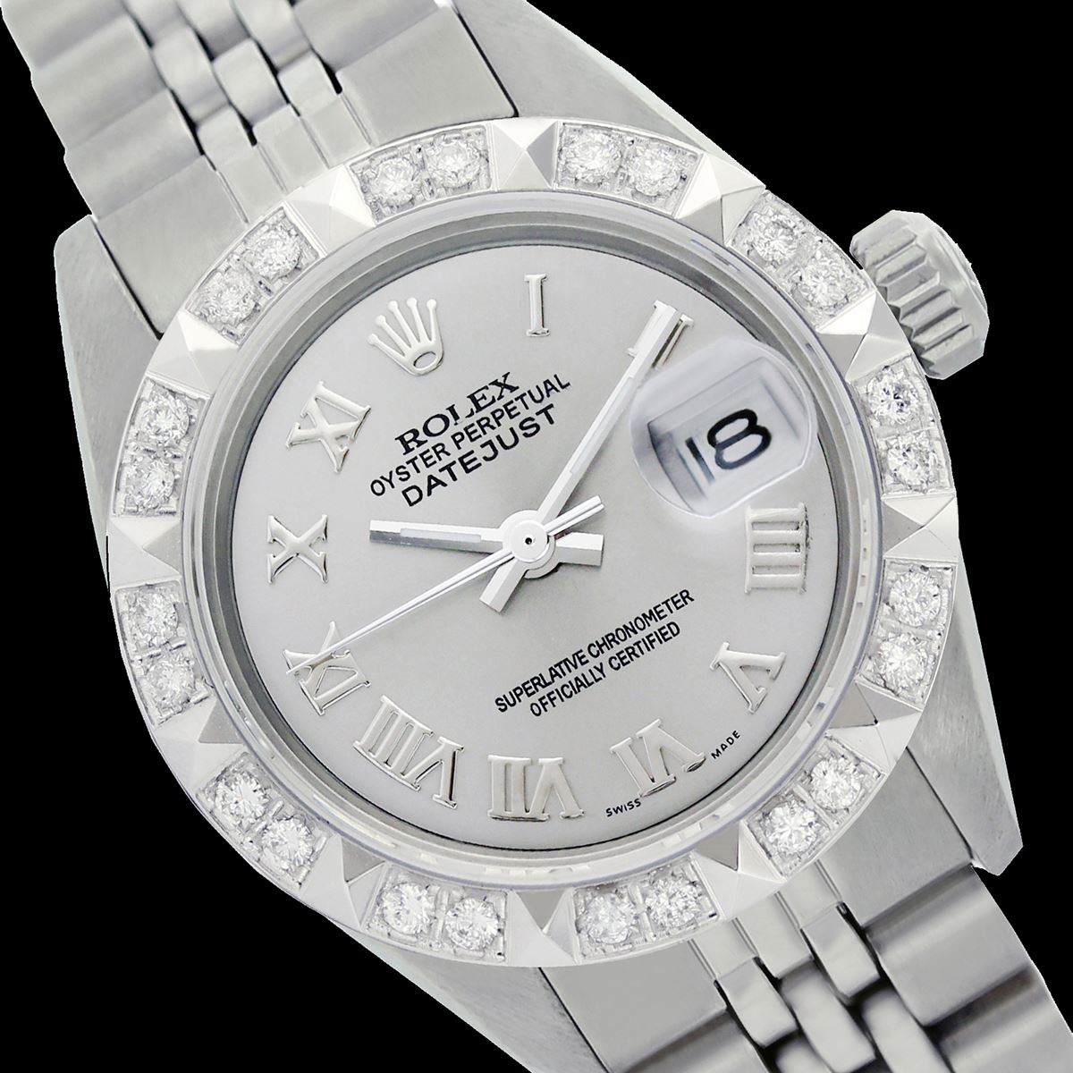 WATCH DETAILS: ITEM: WatchBRAND: RolexTYPE: Stainless SteelFEATURE: MODEL: DateJustMADE: Swiss MadeGENDER: LadiesCONDITION: Pre-OwnedFUNCTION: DateDIAL COLOR: Slate GreyHOUR MARKERS: RomanBEZEL TYPE: Pyrimid Custom Made Diamond Bezel BEZEL STONE: Diamond G-VVS1 BEZEL MATERIAL: 18K GoldBRACELET TYPE: Jubilee BRACELET MATERIAL: Stainless SteelCLASP TYPE: Folding ClaspCLASP MATERIAL: Stainless SteelCASE STONE: CASE SIZE: 26mmCRYSTAL: Scratch Resistance Sapphire CrystalMOVEMENT: Automatic (Self Winding)CALIBER: 2030CROWN TYPE: Screw Down CrownWATER RESISTANCE: Waterproof to 10 ATM/100 meters/330 feetMODEL #: 6917SKU #: ALSJNS81We Buy/Sell/Trade Valuable watches, Please call us