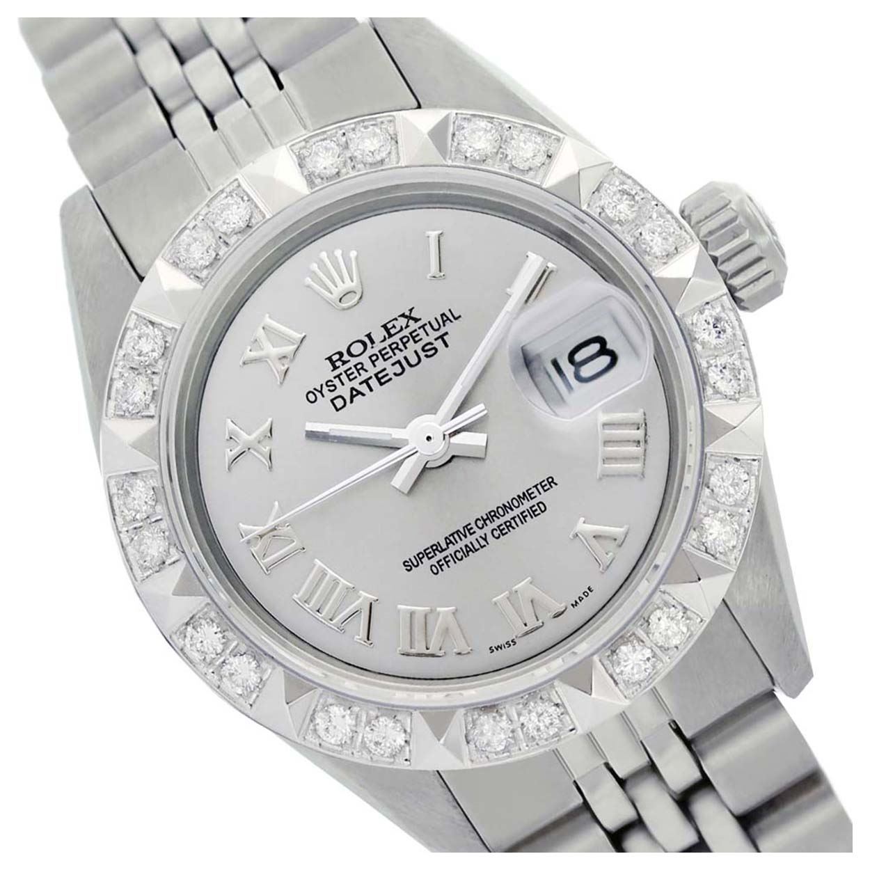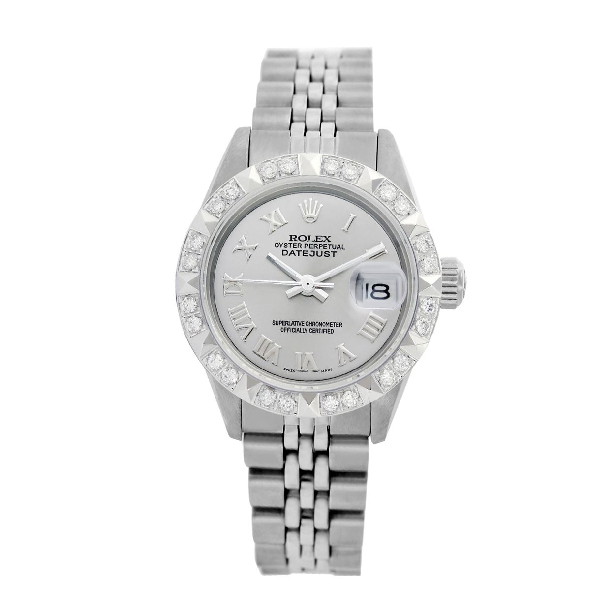 REF-422T6K ---- Rolex Ladies Stainless Steel, Roman Dial with Pyrimid Diam Bezel, Sapphire Crystal This watch is in Excellent Condition.