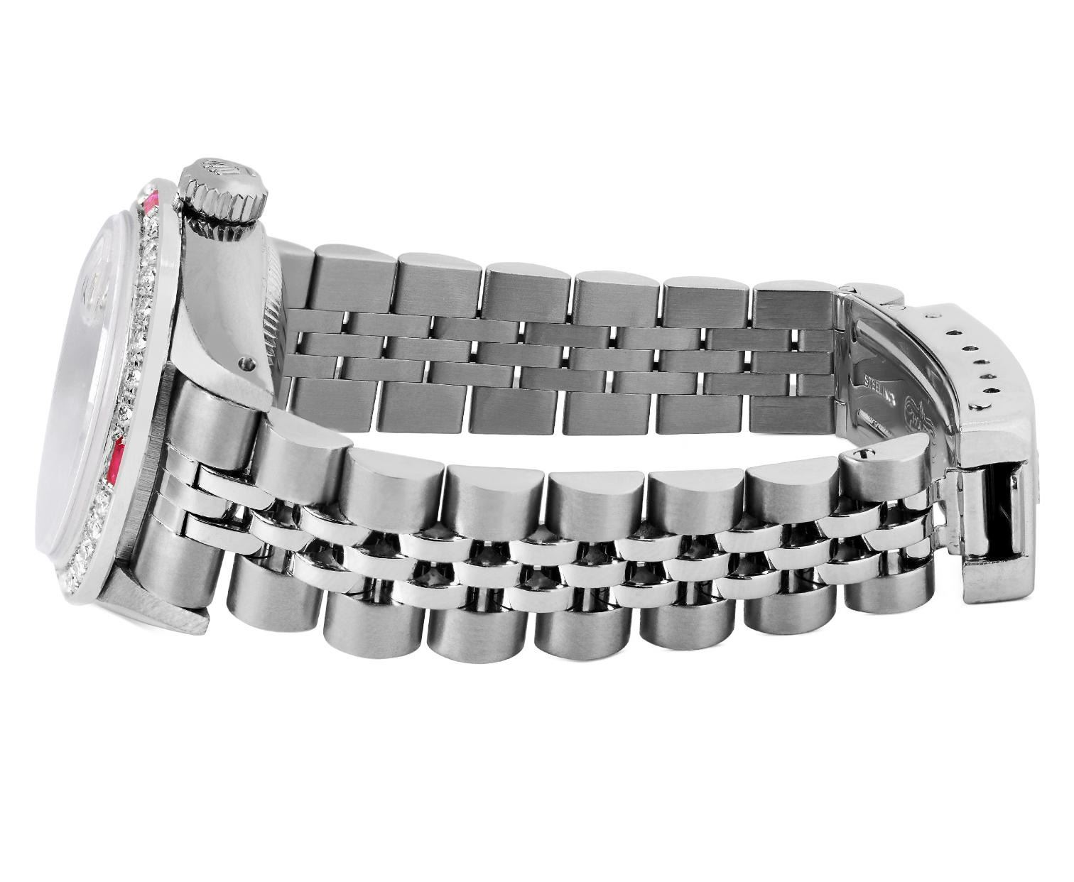 This Lady Rolex Date watch features a silver dial with index hour markers and a custom sapphire crystal, with a magnified date window. The timepiece has custom 18K white gold diamond and ruby bezel, set with genuine round diamonds and rubies (Please note that this diamond bezel is an aftermarket modification and was not manufactured by Rolex). The Rolex 26mm case is crafted from stainless steel and includes a Rolex screw-down crown. The bracelet is a Rolex stainless steel Jubilee band, designed to fit wrists up to 6 inches in circumference. The Watch Is Powered by the Rolex automatic self-winding Caliber 2035 movement. This watch has been polished and serviced and is in excellent condition. It will also be time tested before shipment.