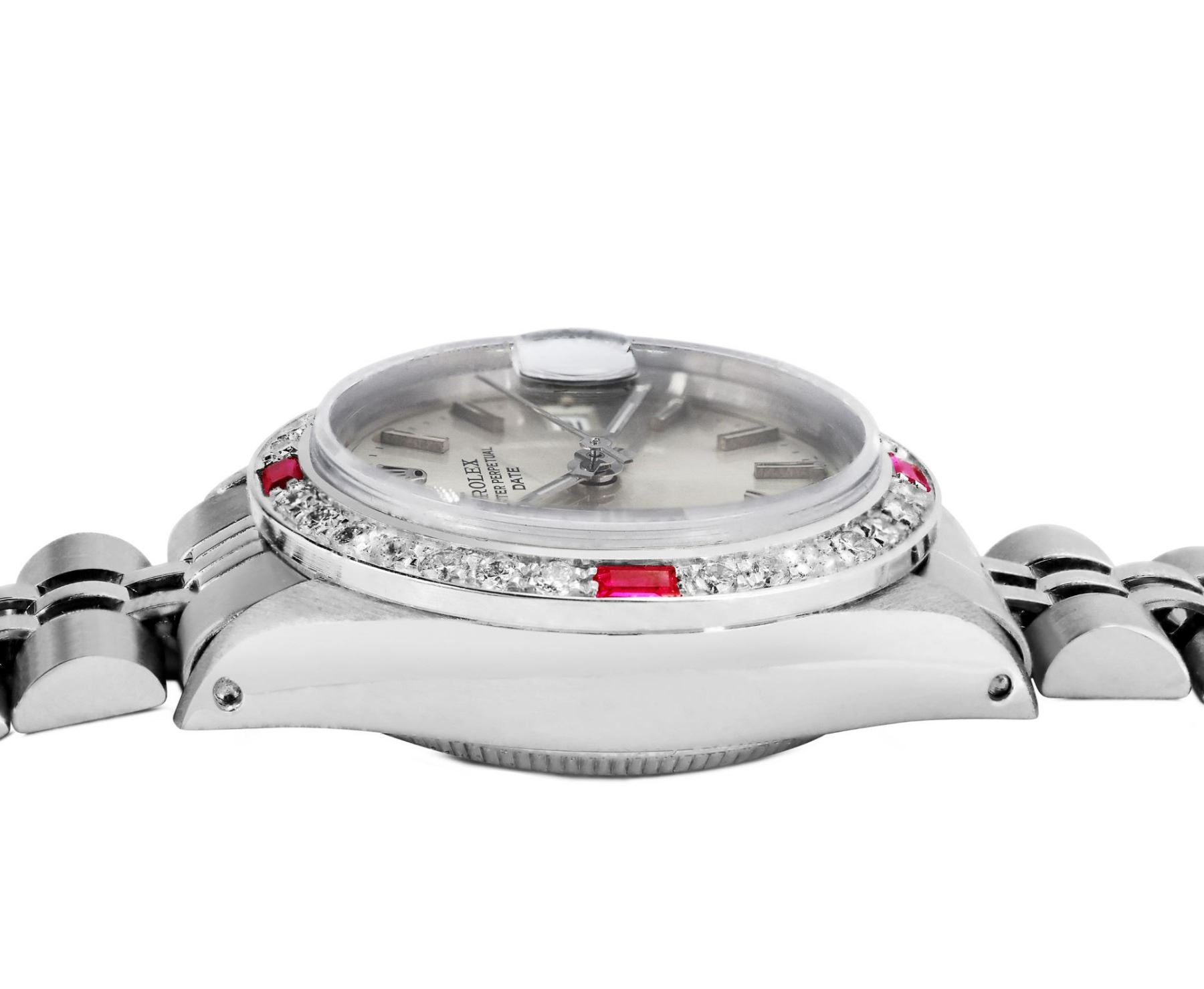 This Lady Rolex Date watch features a silver dial with index hour markers and a custom sapphire crystal, with a magnified date window. The timepiece has custom 18K white gold diamond and ruby bezel, set with genuine round diamonds and rubies (Please note that this diamond bezel is an aftermarket modification and was not manufactured by Rolex). The Rolex 26mm case is crafted from stainless steel and includes a Rolex screw-down crown. The bracelet is a Rolex stainless steel Jubilee band, designed to fit wrists up to 6 inches in circumference. The Watch Is Powered by the Rolex automatic self-winding Caliber 2035 movement. This watch has been polished and serviced and is in excellent condition. It will also be time tested before shipment.