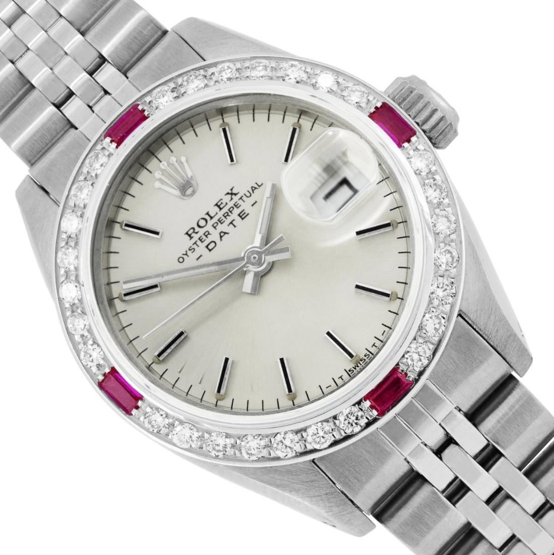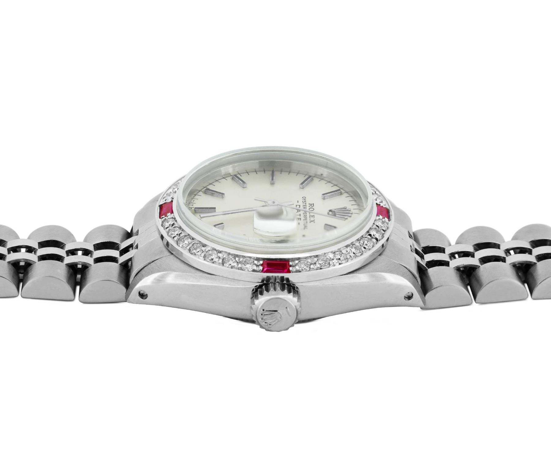 This Lady Rolex Date watch features a silver dial with index hour markers and a custom sapphire crystal, with a magnified date window. The timepiece has custom 18K white gold diamond and ruby bezel, set with genuine round diamonds and rubies (Please note that this diamond bezel is an aftermarket modification and was not manufactured by Rolex). The Rolex 26mm case is crafted from stainless steel and includes a Rolex screw-down crown. The bracelet is a Rolex stainless steel Jubilee band, designed to fit wrists up to 6 inches in circumference. The Watch Is Powered by the Rolex automatic self-winding Caliber 2035 movement. This watch has been polished and serviced and is in excellent condition. It will also be time tested before shipment.