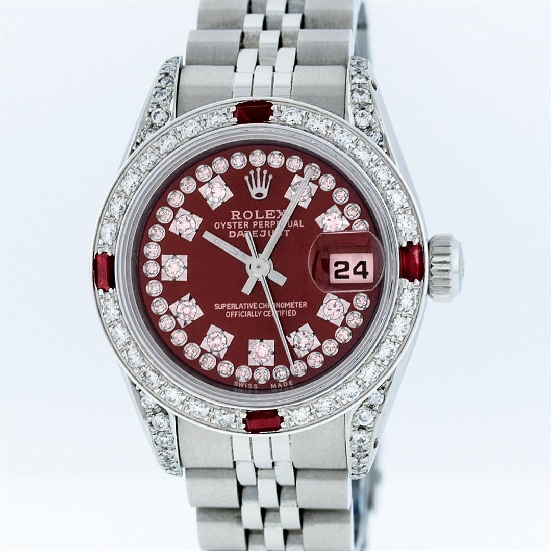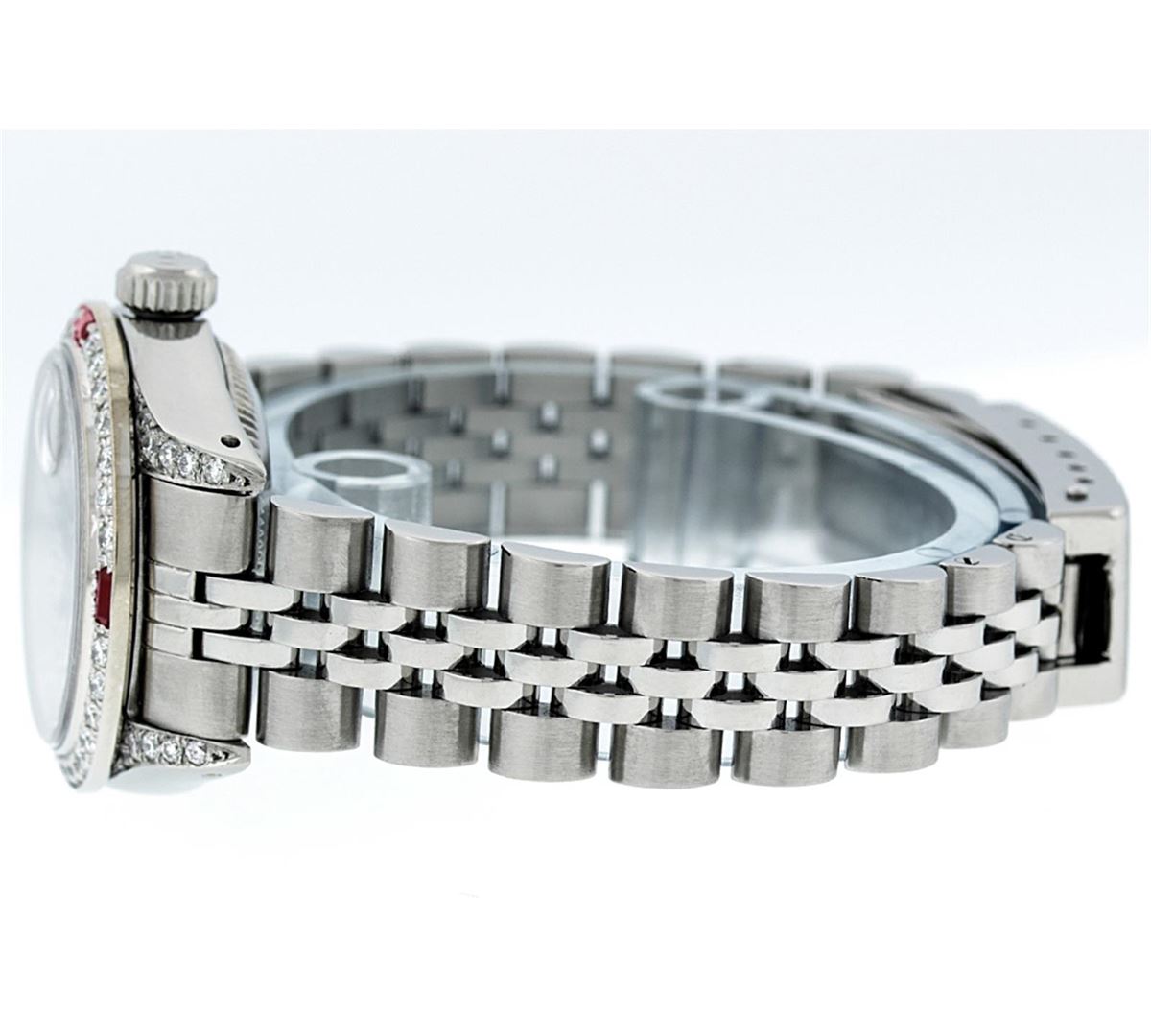 One Ladies Rolex Datejust Polished Bright with Satin Finish, Serviced & Electronically Tested, Stainless Steel Case:26mm, Stainless Steel Crown, Diamond Lugs: 16 Diamonds On Lugs, Clarity: SI-VS, Color: G to H. Custom Bezel: 18K White Gold Ruby Beadset Bezel, Diamond Count: 28 Diamonds + 4 Rubies, Total Weight 1.00 Carat, Clarity: SI-VS, Color: G to H. Custom Crystal: Synthetic Sapphire Cyclops Lens. Movement: Automatic Winding Movement Caliber 2030. Custom Dial: Refinished Burgundy With String Diamond Dial, 43 Diamonds in Dial G To H In Color, Clarity: VVS. Date Window: 3 O'Clock Position Date Display, Model: Datejust Condition: G-6 Extra Fine. Bracelet: Stainless Steel Jubilee. Bright Polish & Satin Finish. 6.0 Inch Length, Adjustable. Standard Clasp, With Rolex Logo.