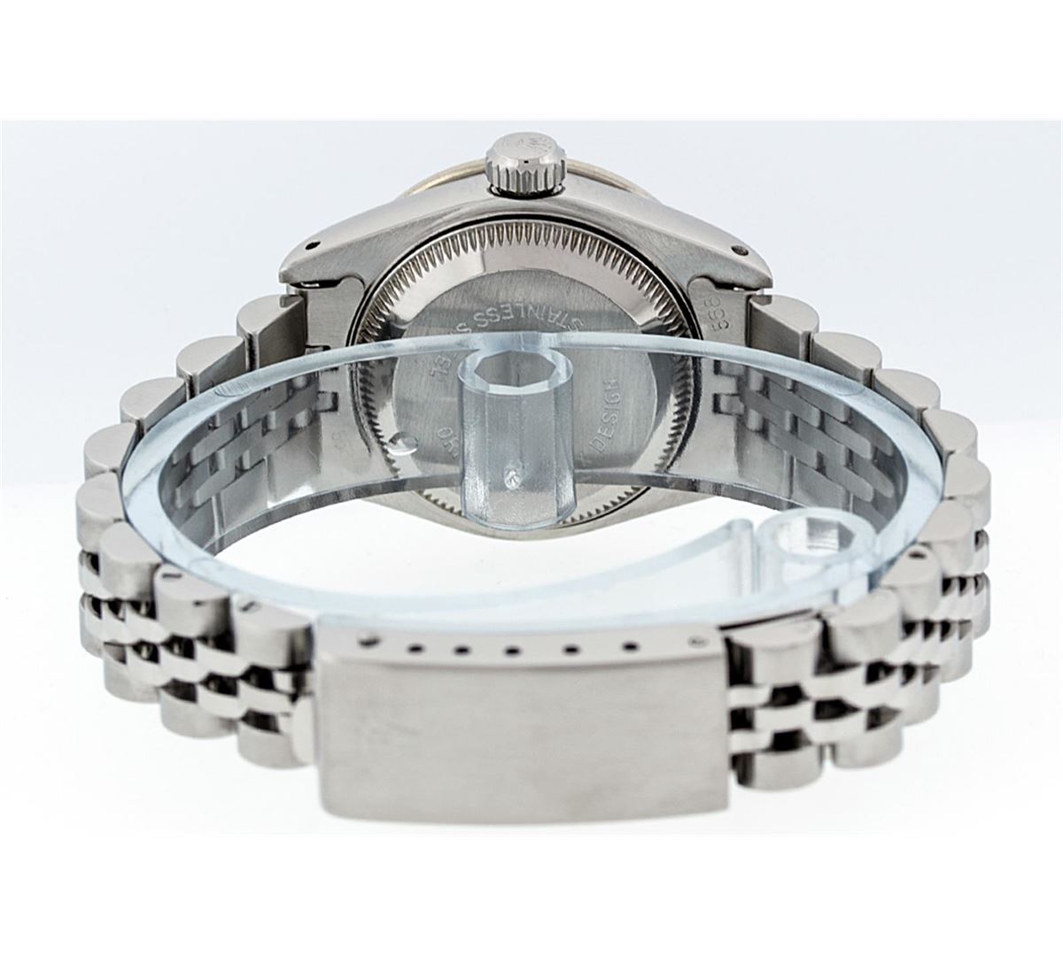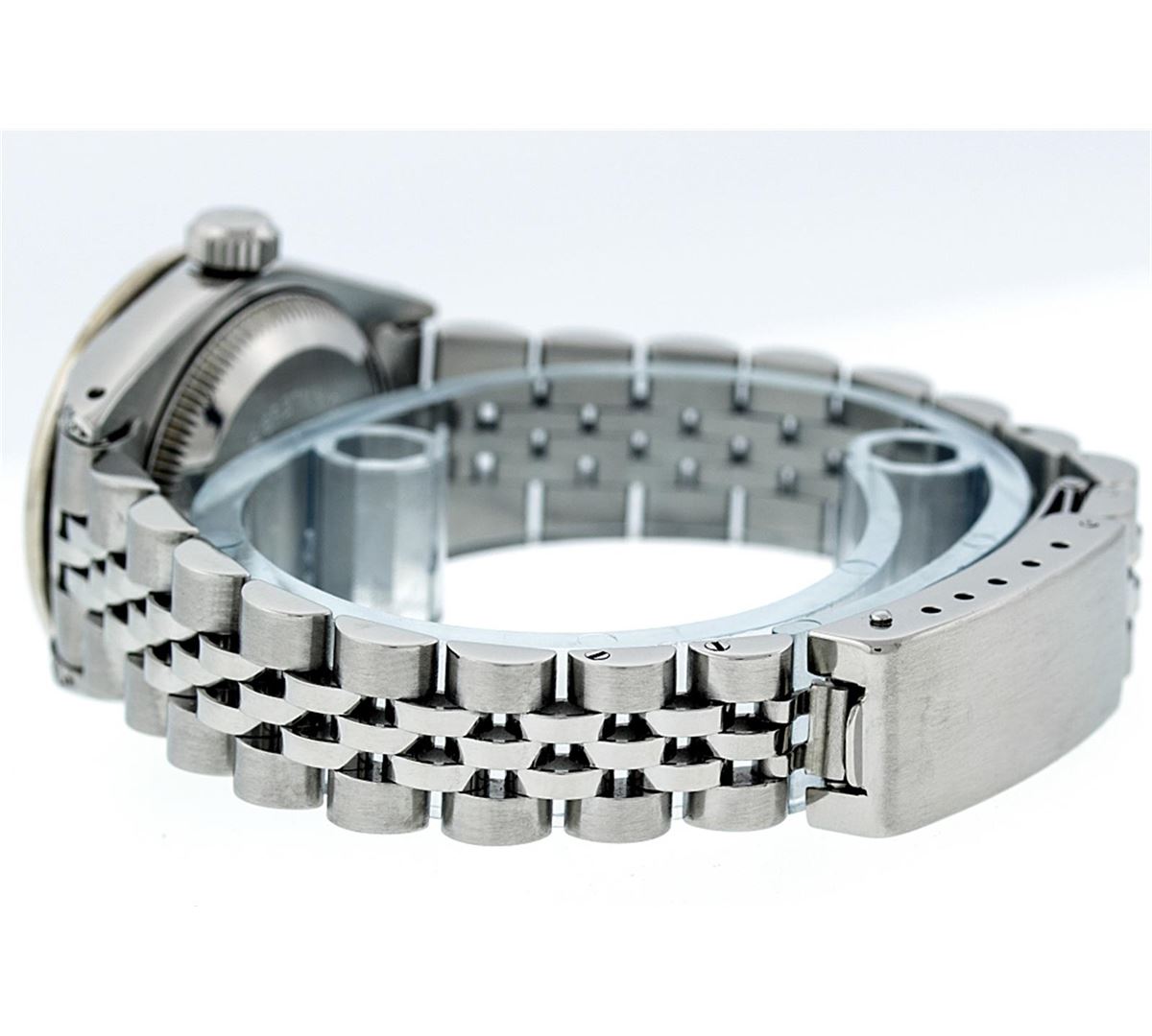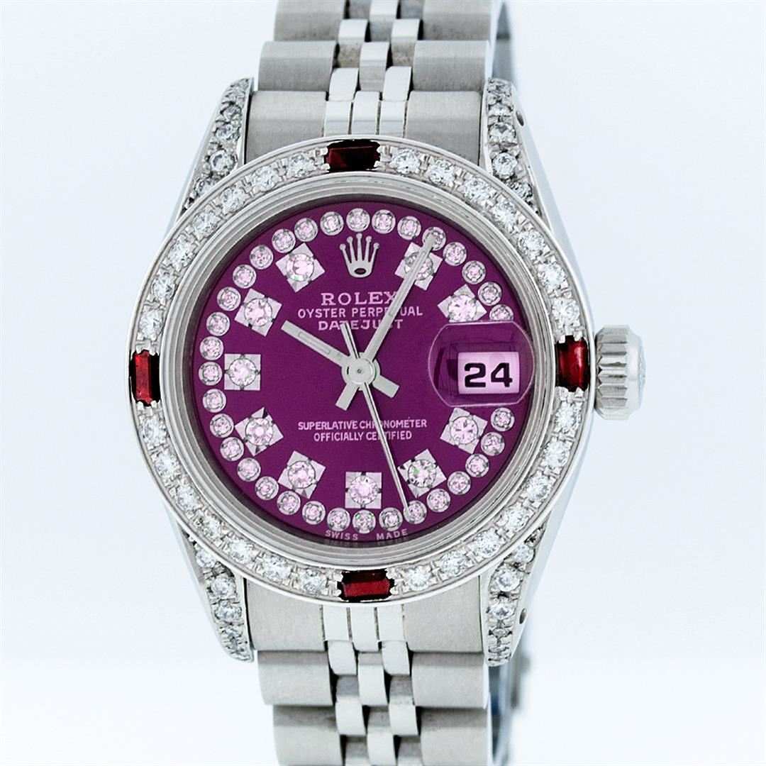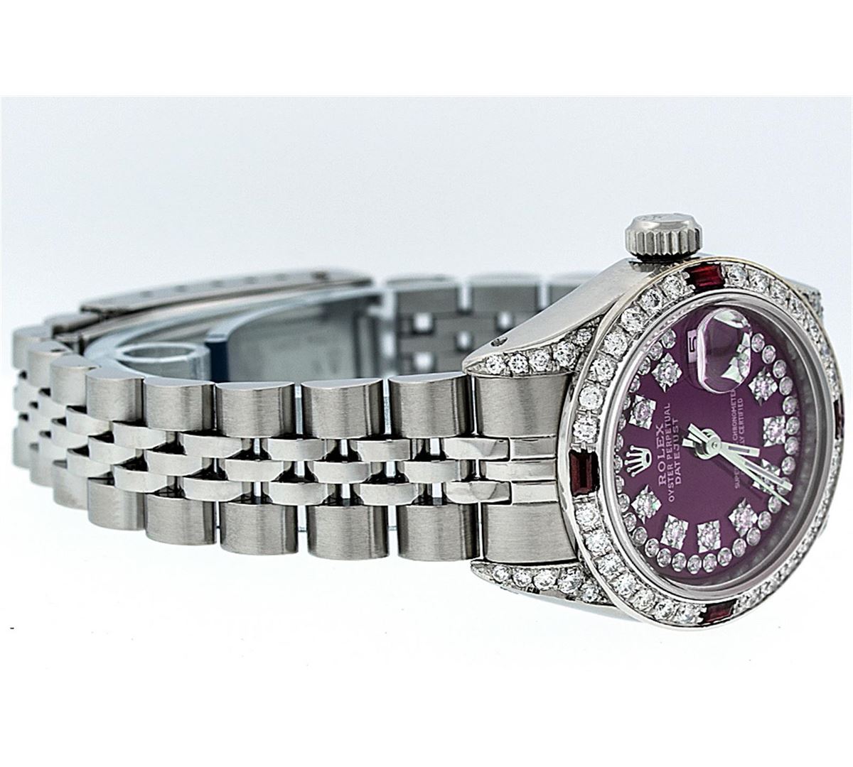 One Ladies Rolex Datejust Polished Bright with Satin Finish, Serviced & Electronically Tested, Stainless Steel Case:26mm, Stainless Steel Crown, Diamond Lugs: 16 Diamonds On Lugs, Clarity: SI-VS, Color: G to H. Custom Bezel: 18K White Gold Ruby Beadset Bezel, Diamond Count: 28 Diamonds + 4 Rubies, Total Weight 1.00 Carat, Clarity: SI-VS, Color: G to H. Custom Crystal: Synthetic Sapphire Cyclops Lens. Movement: Automatic Winding Movement Caliber 2030. Custom Dial: Refinished Purple With String Diamond Dial, 43 Diamonds in Dial G To H In Color, Clarity: VVS. Date Window: 3 O'Clock Position Date Display, Model: Datejust Condition: G-6 Extra Fine. Bracelet: Stainless Steel Jubilee. Bright Polish & Satin Finish. 6.0 Inch Length, Adjustable. Standard Clasp, With Rolex Logo.