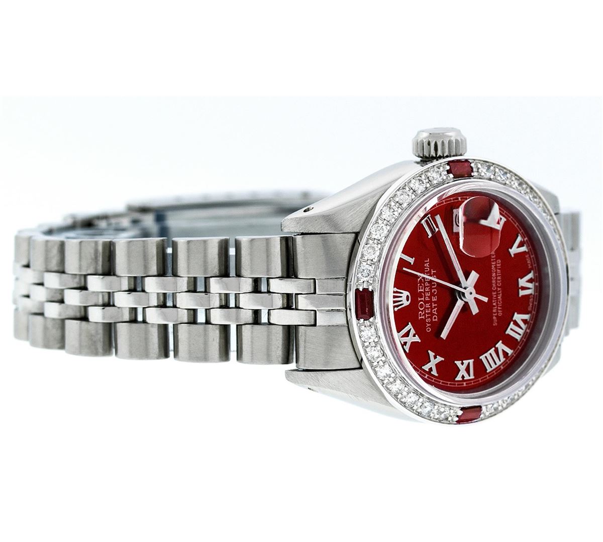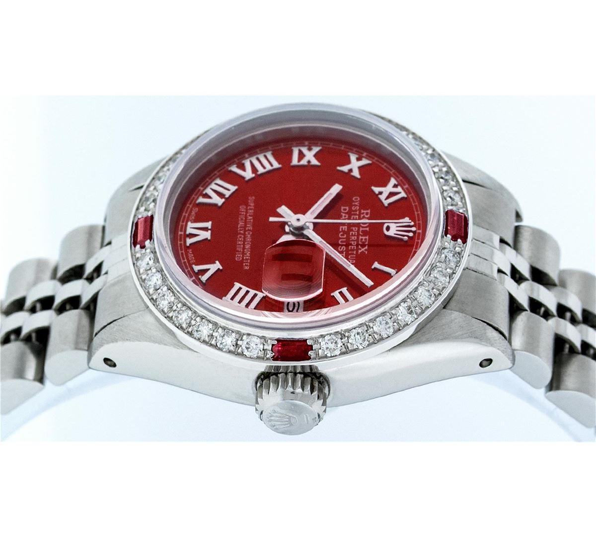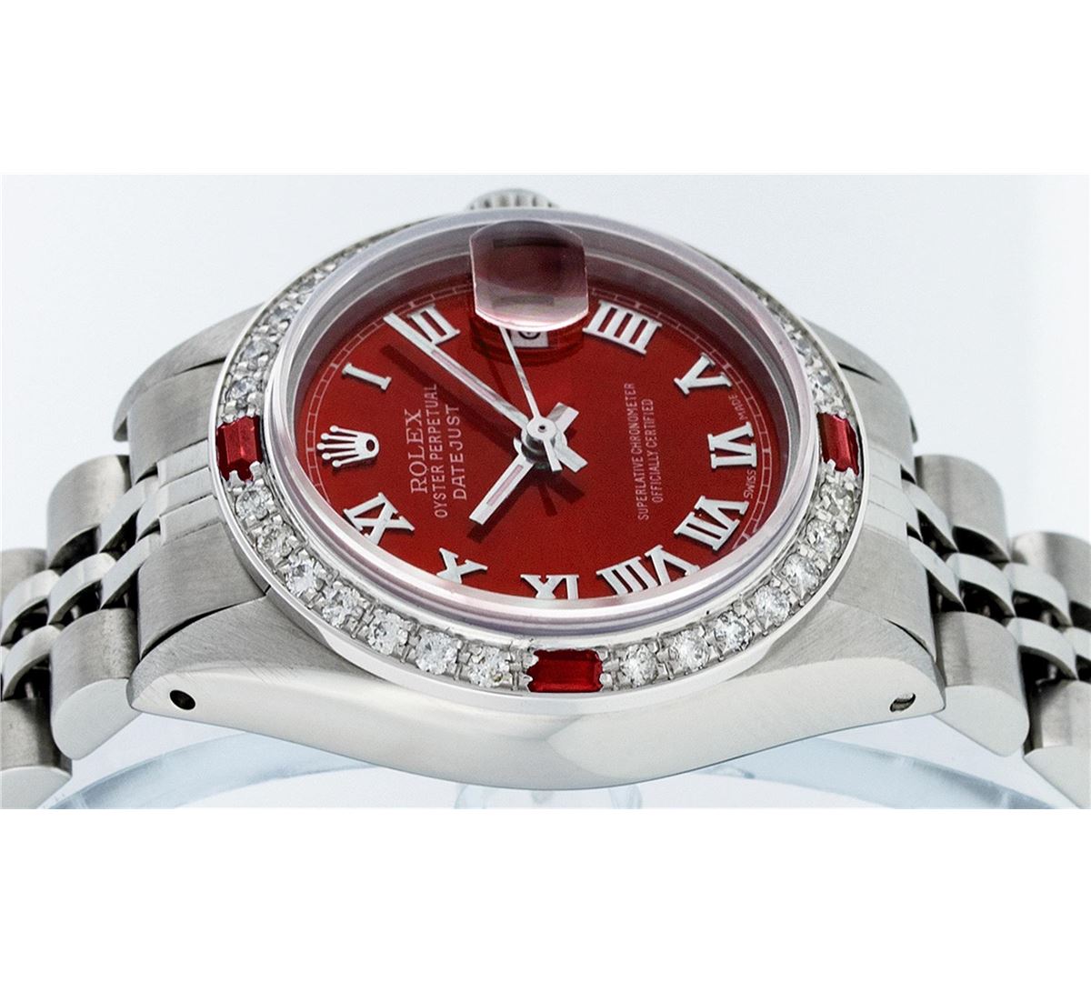One Ladies Rolex Datejust Polished Bright with Satin Finish, Serviced & Electronically Tested, Stainless Steel Case:26mm, Stainless Steel Crown, Custom Bezel: 18K White Gold Ruby Beadset Diamond Bezel, Diamond + Gem Count: 28 Diamonds + 4 Rubies Total Weight .70 Carat, Clarity: SI-VS, Color: G to H. Custom Crystal: Synthetic Sapphire Cyclops Lens. Movement: Automatic Winding Movement Caliber 2030. Custom Dial: Refinished Red Roman Dial With Square Track. Date Window: 3 O'Clock Position Date Display, Model: Datejust. Condition: G-6 Extra Fine. Bracelet: Stainless Steel Jubilee. Bright Polish & Satin Finish. 6.0 Inch Length, Adjustable. Standard Clasp, With Rolex Logo.