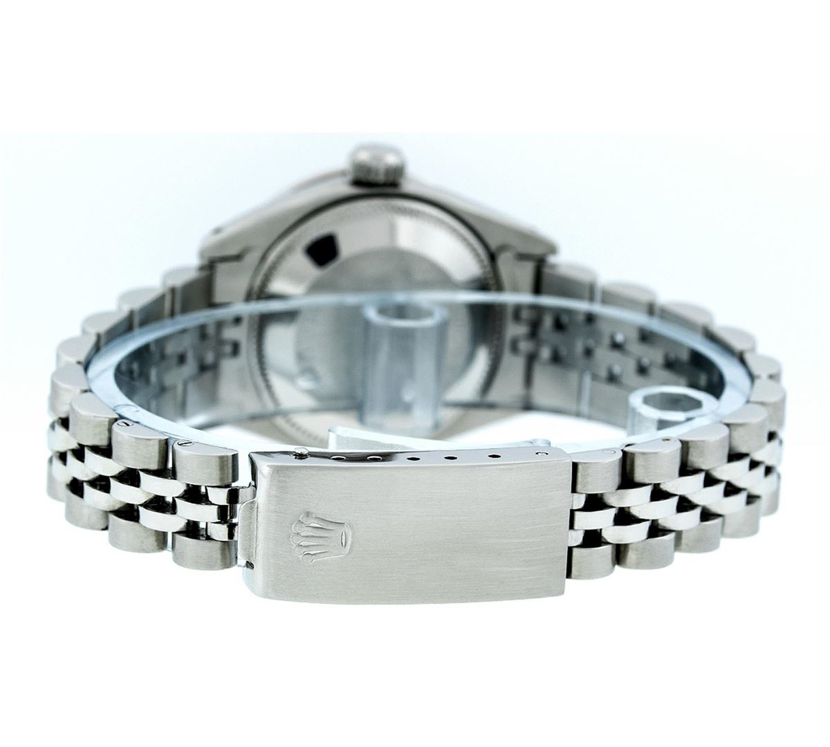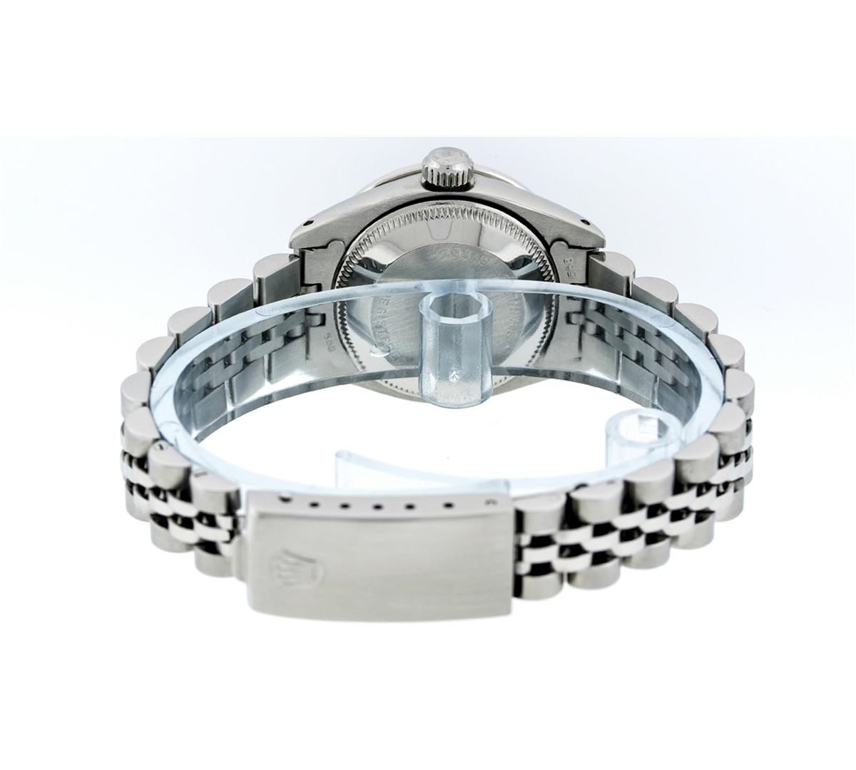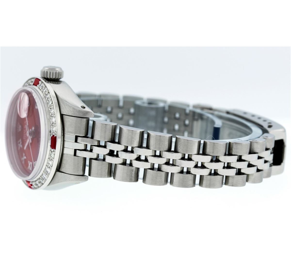 One Ladies Rolex Datejust Polished Bright with Satin Finish, Serviced & Electronically Tested, Stainless Steel Case:26mm, Stainless Steel Crown, Custom Bezel: 18K White Gold Ruby Beadset Diamond Bezel, Diamond + Gem Count: 28 Diamonds + 4 Rubies Total Weight .70 Carat, Clarity: SI-VS, Color: G to H. Custom Crystal: Synthetic Sapphire Cyclops Lens. Movement: Automatic Winding Movement Caliber 2030. Custom Dial: Refinished Red Roman Dial With Square Track. Date Window: 3 O'Clock Position Date Display, Model: Datejust. Condition: G-6 Extra Fine. Bracelet: Stainless Steel Jubilee. Bright Polish & Satin Finish. 6.0 Inch Length, Adjustable. Standard Clasp, With Rolex Logo.