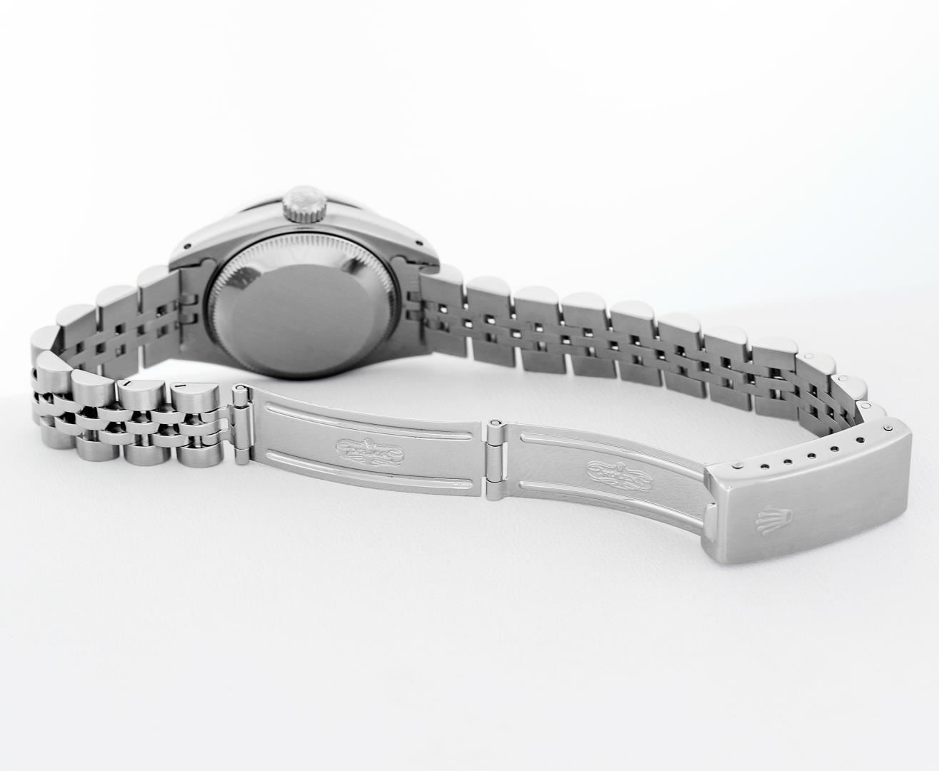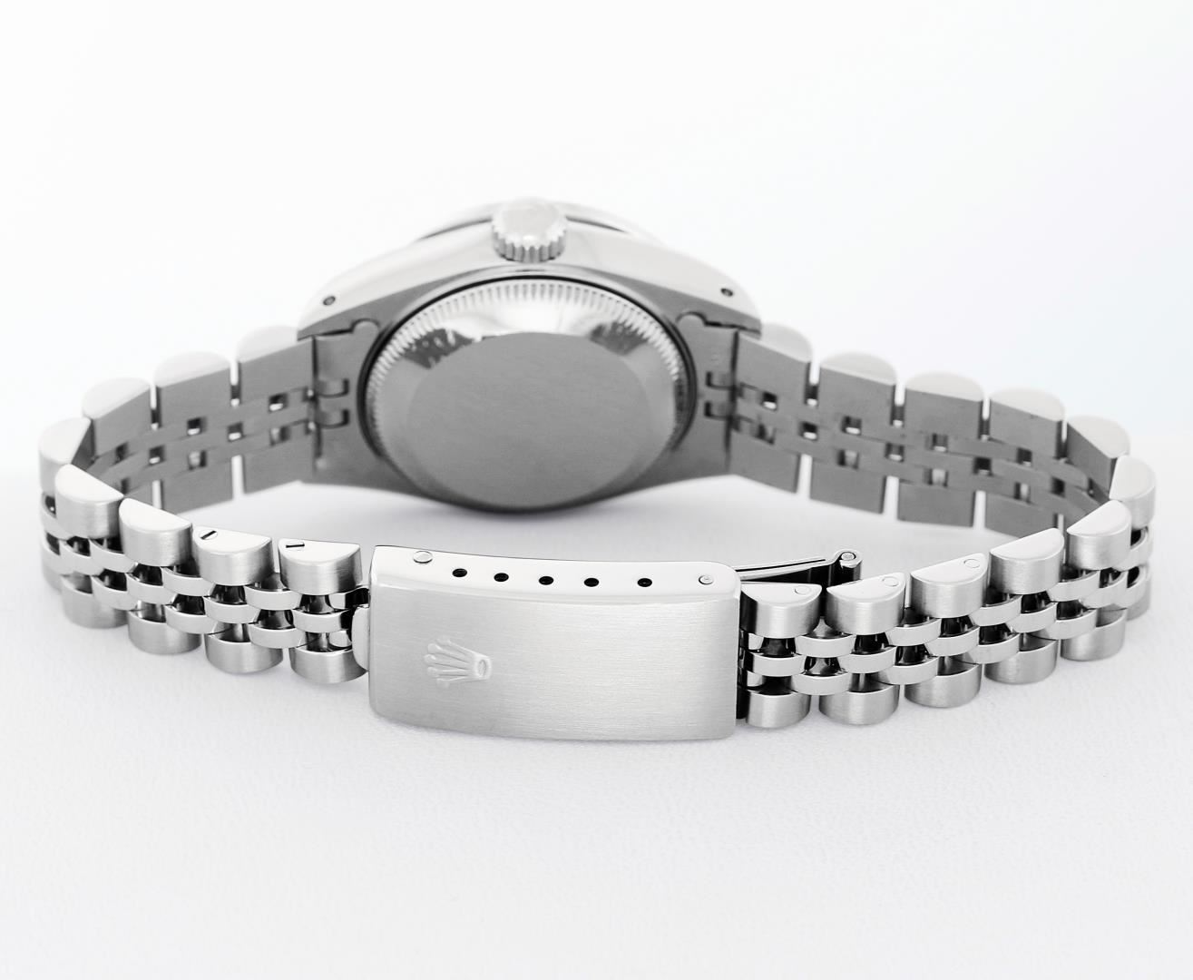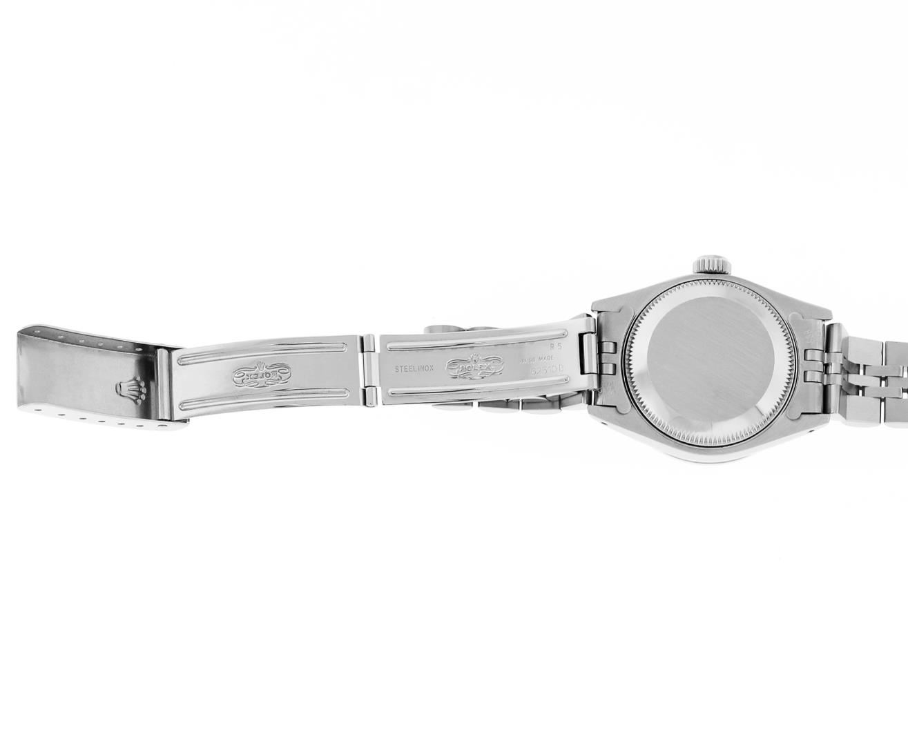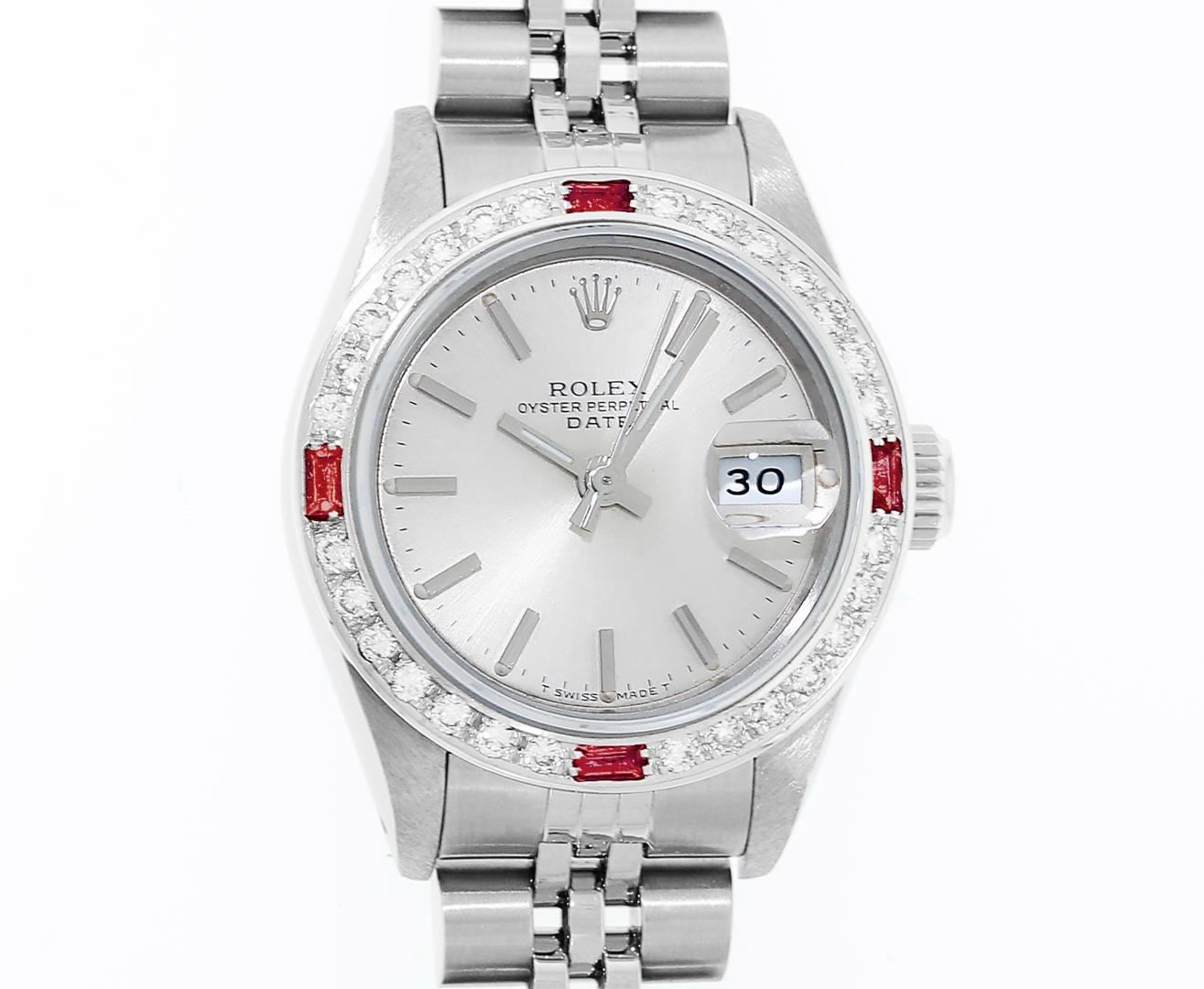 One Ladies Pre Owned Quickset Stainless Steel Rolex Datejust Polished Bright with Satin Finish, Serviced & Electronically Tested, Rolex Stainless Steel Case: 26mm, Rolex Stainless Steel Crown, Custom Bezel: 18K White Gold Beadset Ruby Bezel, Stone Count: 28 Diamonds + 4 Rubies, Diamond Color: G To H, Clarity: SI-VS. Custom Crystal: New Sapphire With Magnified Date Window. Custom Hands: New Luminescent Hands. Rolex Movement: Quickset Automatic Winding Movement 2130. Rolex Dial: Silver Index Dial With Luminescent Dots & Dash Track. Date Window: 3 O'Clock Position Date Display, Model: Sapphire Quickset Datejust. Condition: G-6 Extra Fine. Rolex Bracelet: Stainless Steel Jubilee Band. Bright Polish & Satin Finish. 6.0 Inch Length, Adjustable. Standard Clasp, With Rolex Logo. This Watch Has Been Serviced Time Tested And Is In Excellent Condition It Is Free Of All Scratches And Dents.