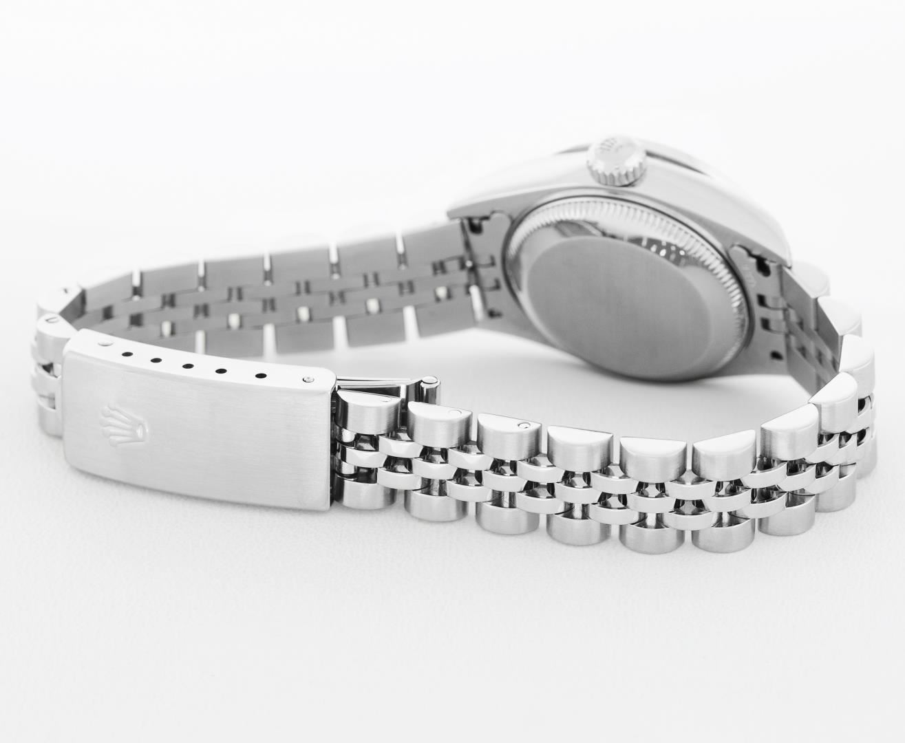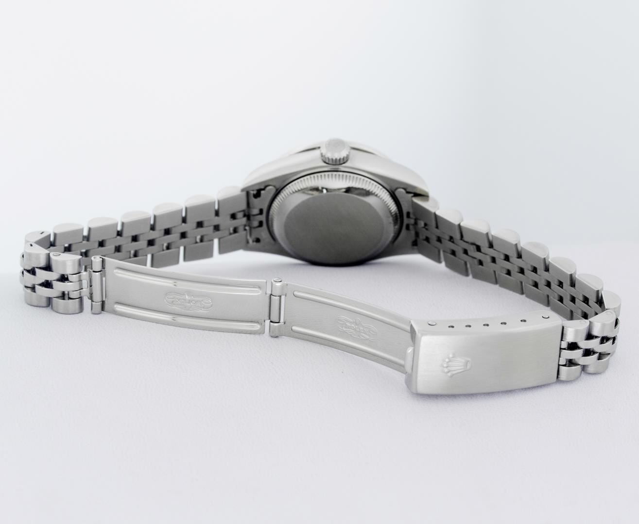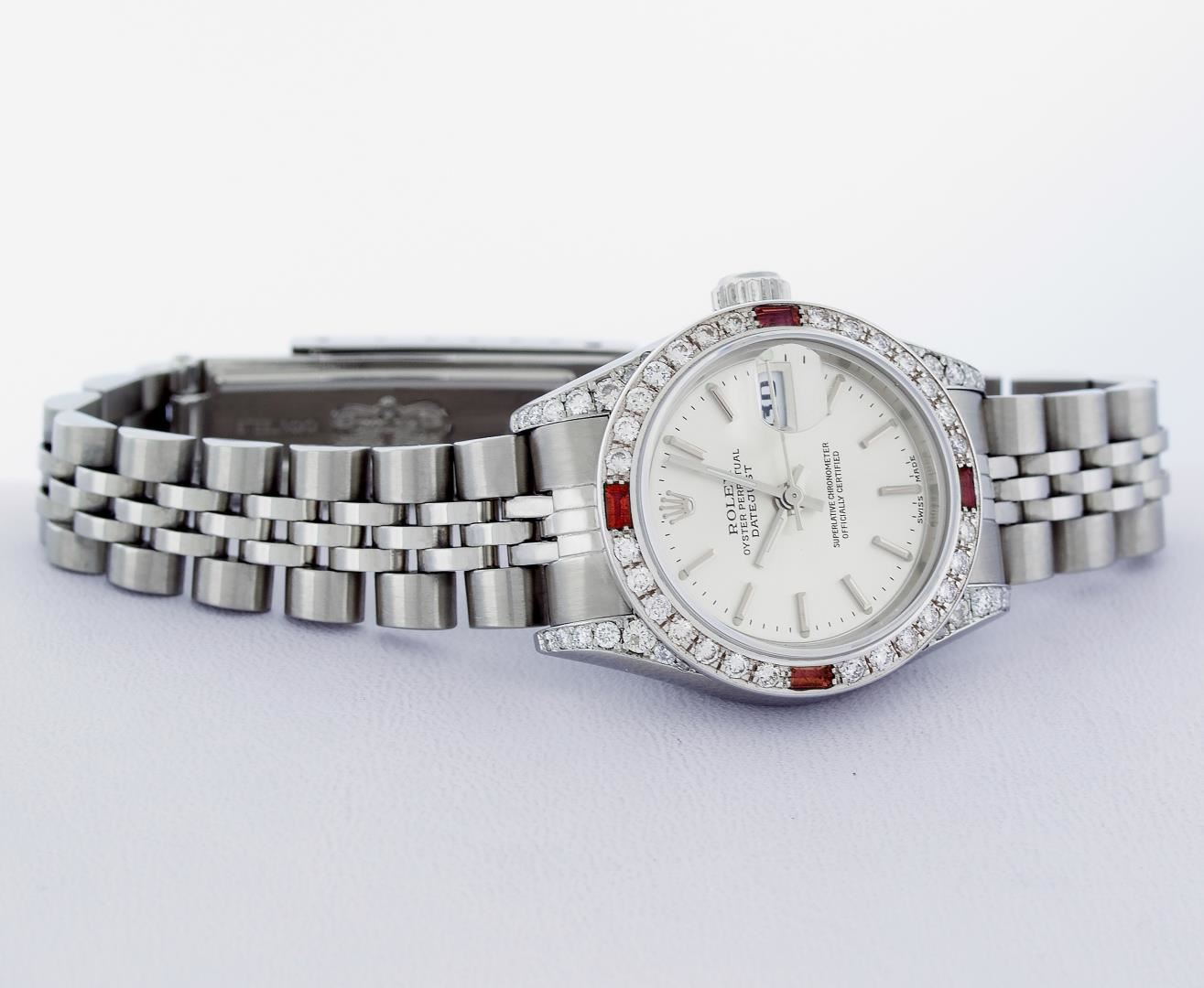 One Ladies Pre Owned Quickset Stainless Steel Rolex Datejust Polished Bright with Satin Finish, Serviced & Electronically Tested, Rolex Stainless Steel Case: 26mm, Custom Diamond Lugs: Added Diamonds On Lugs, Diamond Count: 24 Diamonds On Bezel, Color: G To H, Clarity: SI-VS. Rolex Stainless Steel Crown, Custom Bezel: New 18K White Gold Beadset And Ruby Bezel, Stone Count: 28 Diamonds + 4 Rubies, Diamond Color: G To H, Clarity: SI-VS. Custom Crystal: New Sapphire With Magnified Date Window. Custom Hands: New Lumi Hands. Rolex Movement: Quickset Automatic Winding Movement 2230. Rolex Dial: Silver Index With Dash Track And Lumi Dots. Date Window: 3 O'Clock Position Date Display, Model: Sapphire Quickset Datejust. Condition: G-6 Extra Fine. Rolex Bracelet: Stainless Steel Jubilee Band. Bright Polish & Satin Finish. 6.0 Inch Length, Adjustable. Standard Clasp, With Rolex Logo. This Watch Has Been Serviced Time Tested And Is In Excellent Condition It Is Free Of All Scratches And Dents.