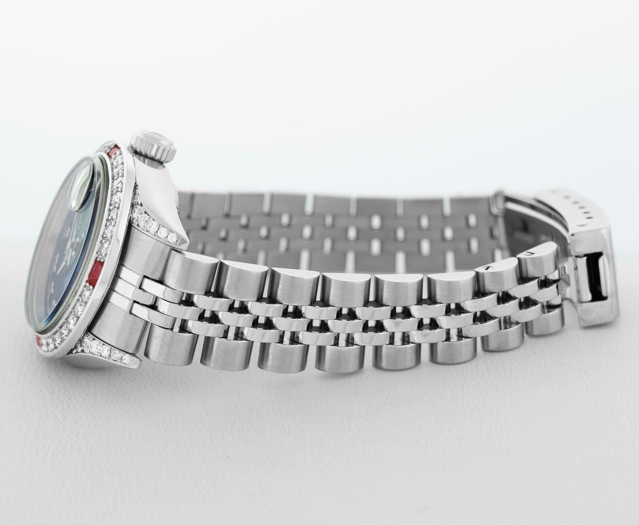 One Ladies Pre Owned Quickset Stainless Steel Rolex Datejust Polished Bright with Satin Finish, Serviced & Electronically Tested, Rolex Stainless Steel Case: 26mm, Custom Diamond Lugs: Added Diamonds On Lugs, Diamond Count: 24 Diamonds On Bezel, Color: G To H, Clarity: SI-VS. Rolex Stainless Steel Crown, Custom Bezel: New 18K White Gold Beadset And Ruby Bezel, Stone Count: 28 Diamonds + 4 Rubies, Diamond Color: G To H, Clarity: SI-VS. Custom Crystal: New Sapphire With Magnified Date Window. Custom Hands: New Hands. Rolex Movement: Quickset Automatic Winding Movement 2230. Rolex Dial: Blue Roman Dial With Square Track. Date Window: 3 O'Clock Position Date Display, Model: Sapphire Quickset Datejust. Condition: G-6 Extra Fine. Rolex Bracelet: Stainless Steel Jubilee Band. Bright Polish & Satin Finish. 6.0 Inch Length, Adjustable. Standard Clasp, With Rolex Logo. This Watch Has Been Serviced Time Tested And Is In Excellent Condition It Is Free Of All Scratches And Dents.