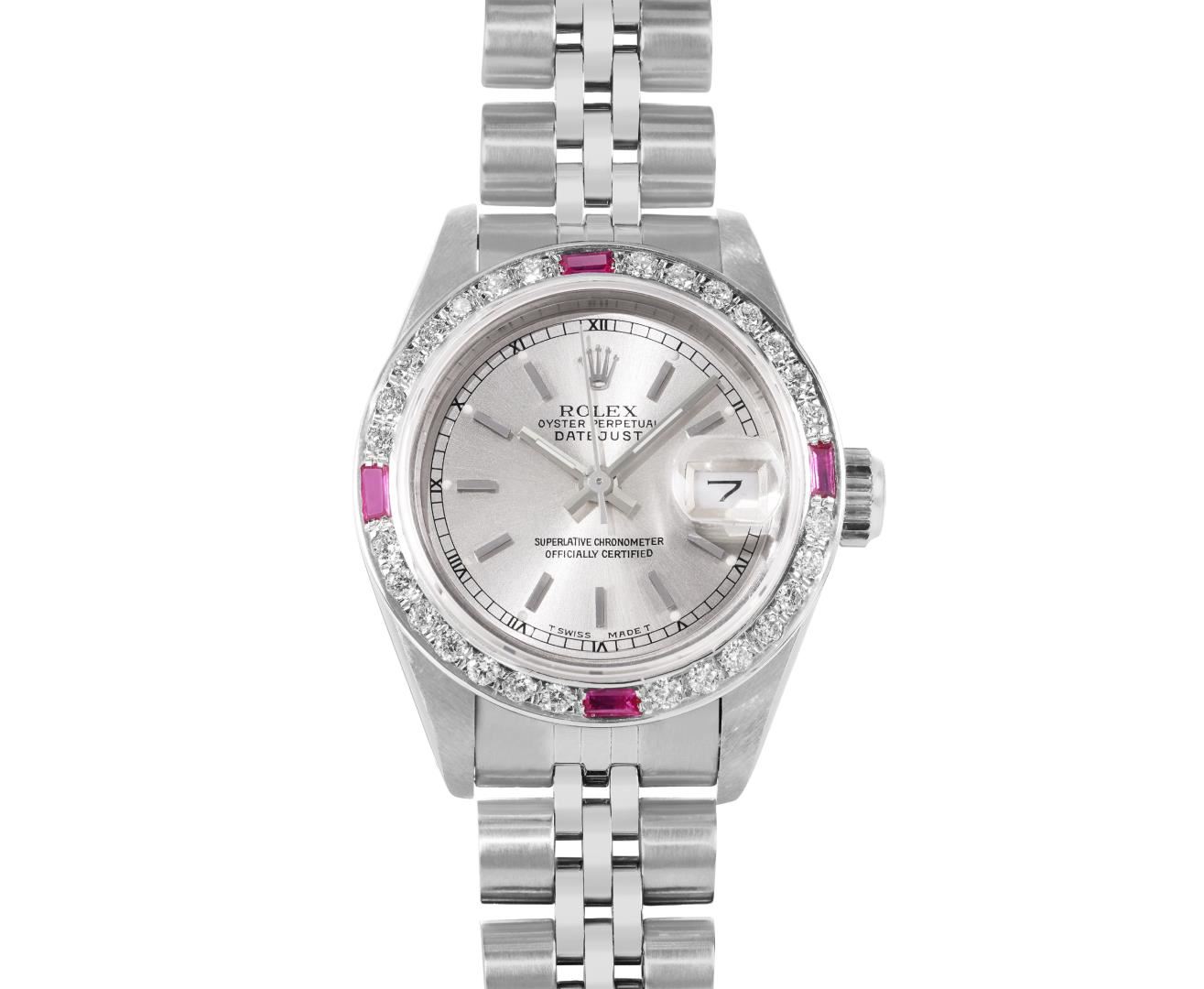 One Rolex Ladies Pre Owned Stainless Steel Datejust Wristwatch Polished Bright with Satin Finish, Serviced & Electronically Tested, Stainless Steel Case: 26mm, Stainless Steel Crown, Custom Bezel: New 18K White Gold Ruby Beadset Diamond Bezel, Diamond + Gem Count: 36 Diamonds + 4 Rubies, Clarity: SI-VS, Color: G to H. Custom Crystal: New Sapphire With Magnified Date Window. Custom Hands: New Luminescent Hands. Rolex Movement: 2135 Automatic Winding Movement. Rolex Dial: Factory Silver Dial With Index Hour Markers, Square Roman Track, and Lumi Dots. Date Window: 3 O'Clock Position Date Display, Model: Quickset Datejust. Condition: G-6 Extra Fine. Rolex Bracelet: Stainless Steel Jubilee Band. Bright Polish & Satin Finish. 6.0 Inch Length, Adjustable. Standard Clasp, With Rolex Logo. This Watch Has Been Serviced Time Tested And Is In Excellent Condition. It Is Free Of All Scratches And Dents.