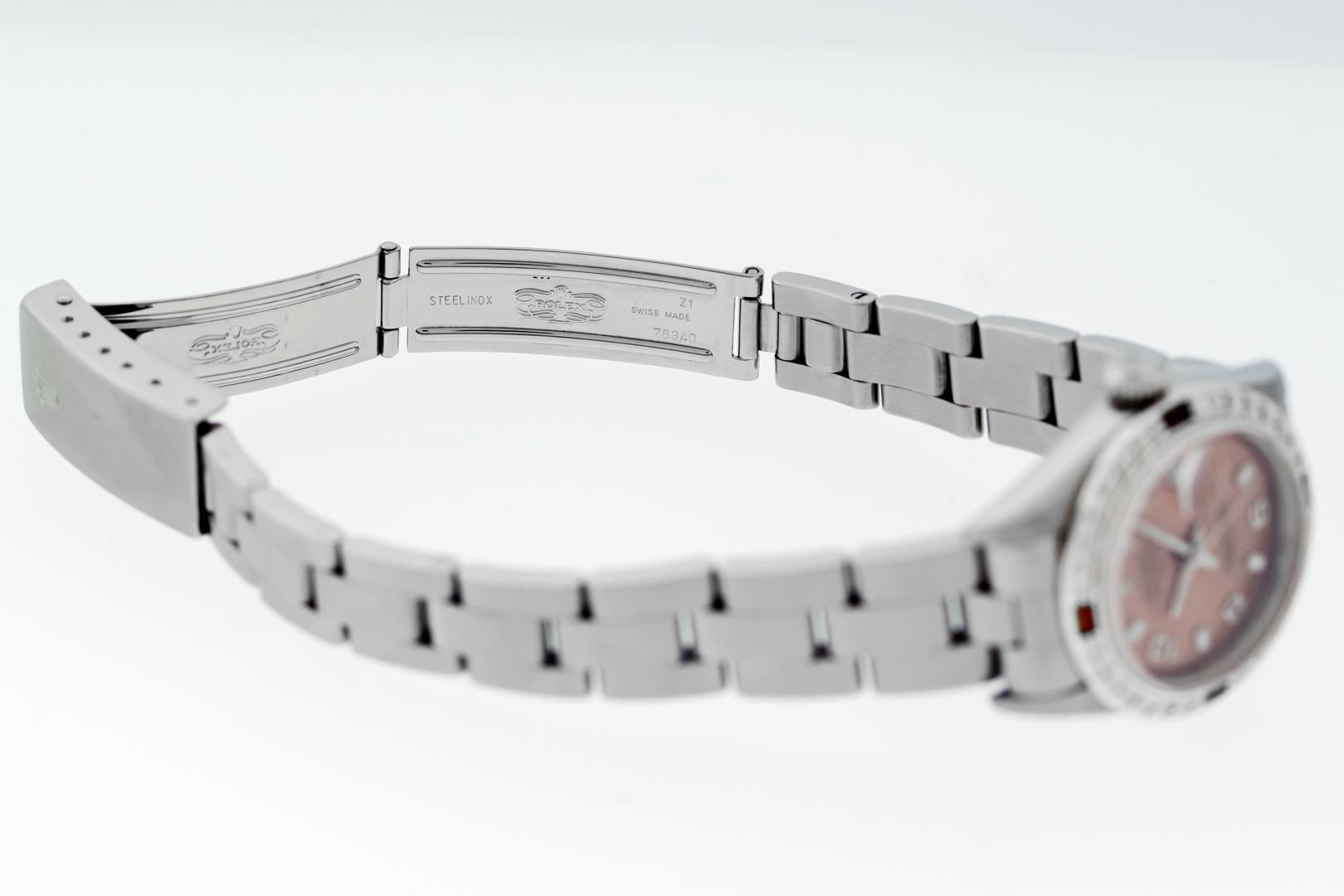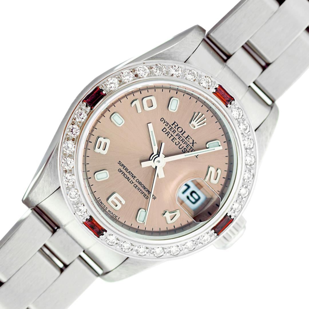 One Ladies Pre Owned Stainless Steel Rolex Datejust Polished Bright with Satin Finish, Serviced & Electronically Tested, Stainless Steel Case: 26mm, Rolex Stainless Steel Crown, Custom Bezel: New 18K White Gold Ruby Bead Set Diamond Bezel, Diamond + Gem Count: 28 Diamonds + 4 Rubies, Clarity: SI-VS, Color: G to H. Custom Crystal: New Sapphire With Magnified Date Window. Custom Hands: New Luminescent Hands. Rolex Movement: Automatic Winding Movement 2235. Rolex Dial: Salmon With Arabic Hour Markers & Dash Track. Date Window: 3 O'Clock Position Date Display, Model: Quickset Datejust. Condition: G-6 Extra Fine. Rolex Bracelet: Stainless Steel Oyster Band. Bright Polish & Satin Finish. 6.0 Inch Length, Adjustable. Standard Clasp, With Rolex Logo. This Watch Has Been Serviced Time Tested And Is In Excellent Condition It Is Free Of All Scratches And Dents.