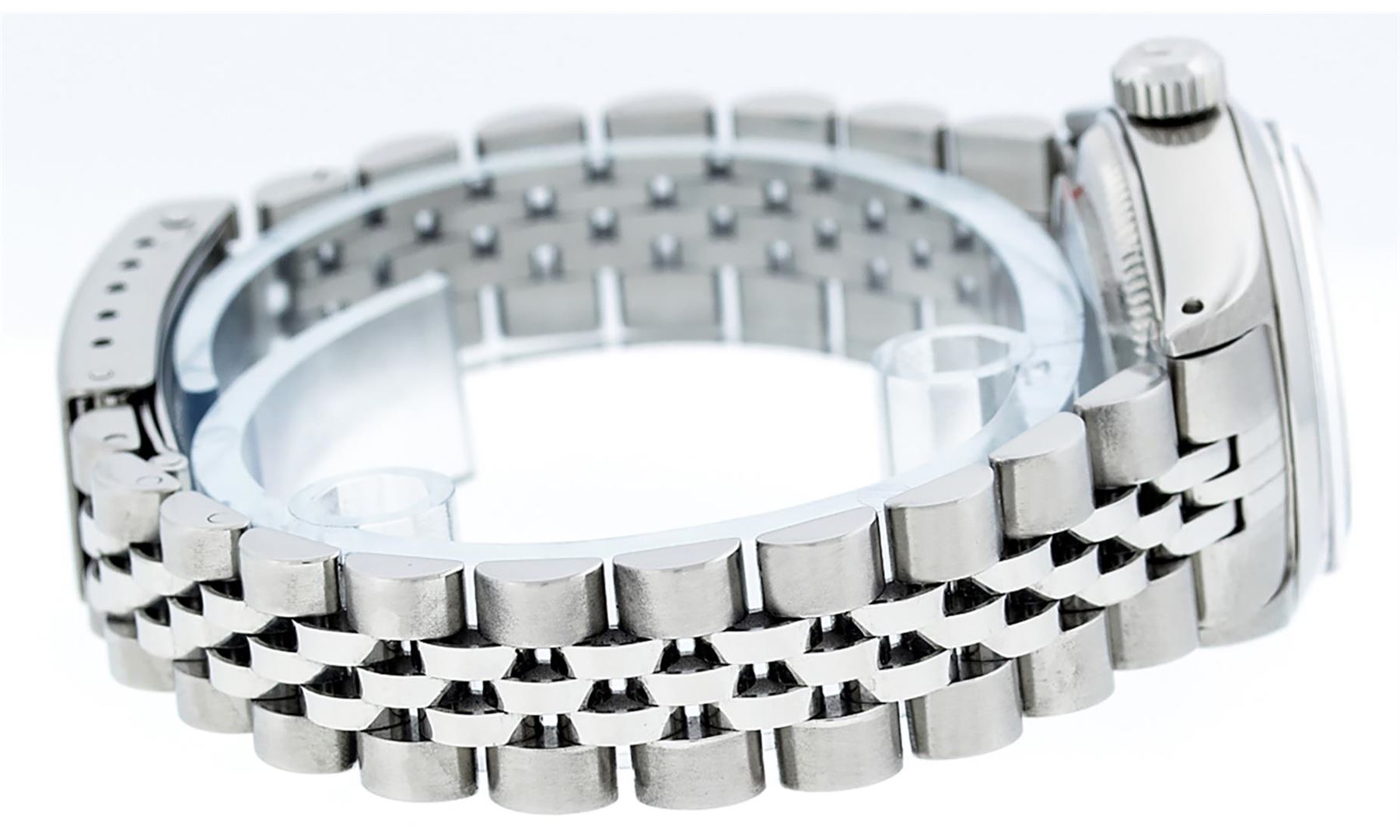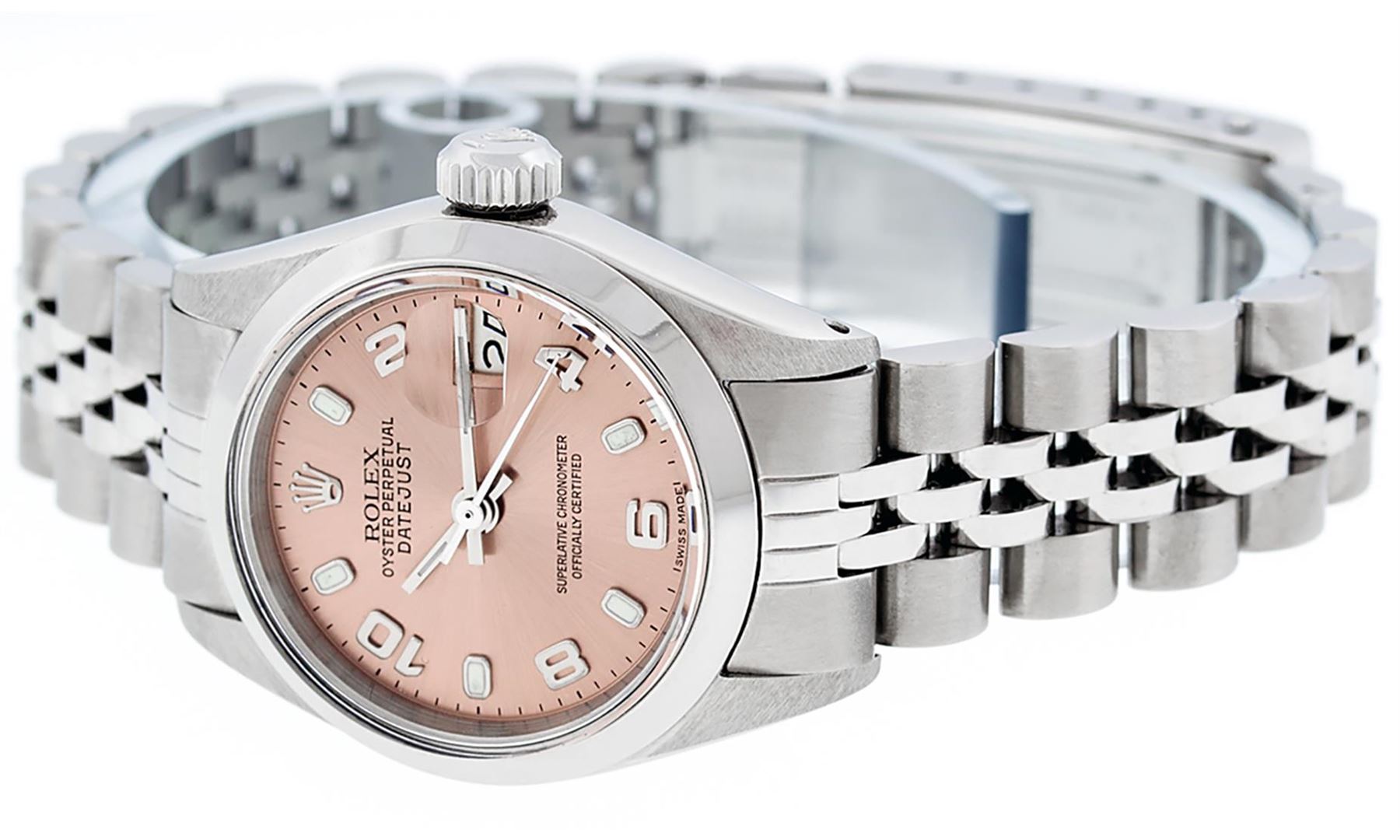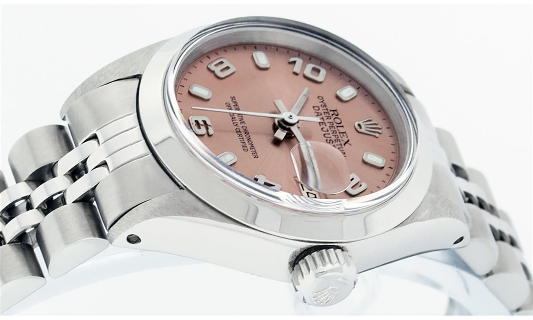 One Ladies Stainless Steel Rolex Datejust Polished Bright with Satin Finish, Serviced & Electronically Tested, Stainless Steel Case: 26mm, Stainless Steel Crown, Bezel: Stainless Steel Smooth Bezel. Custom Crystal: New Acrylic Cyclops Lens. Custom Hands: New Luminescent Hands. Movement: Automatic Winding Movement Caliber 2030. Dial: Salmon Arabic Dial With Dash Track, Date Window: 3 O'Clock Position Date Display, Model: Datejust. Condition: G-6 Extra Fine. Bracelet: Stainless Steel Jubilee Band. Bright Polish & Satin Finish. 6.0 Inch Length, Adjustable. Standard Clasp, With Rolex Logo. This Watch Has Been Serviced Time Tested And Is In Excellent Condition It Is Free Of All Scratches And Dents.