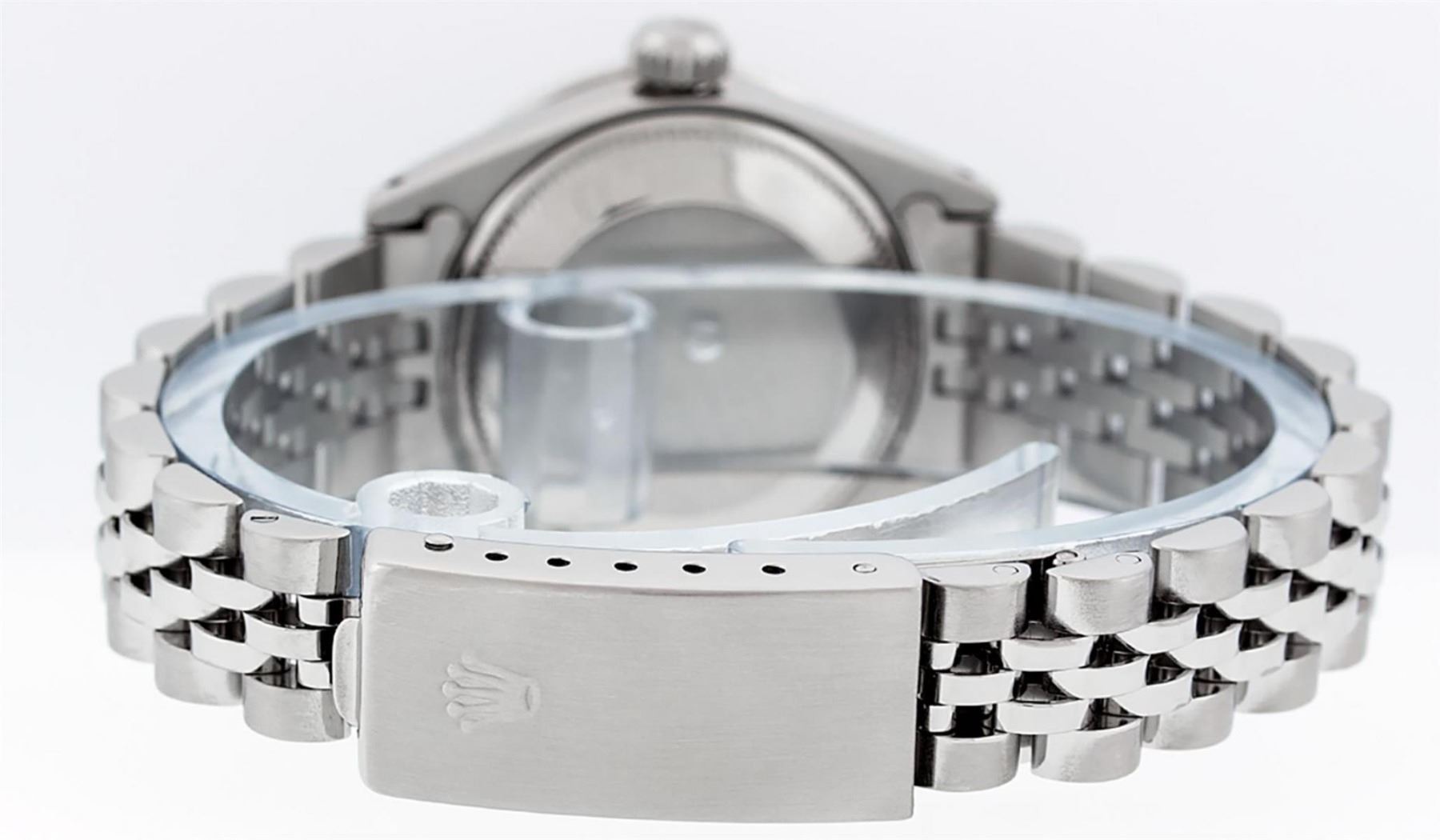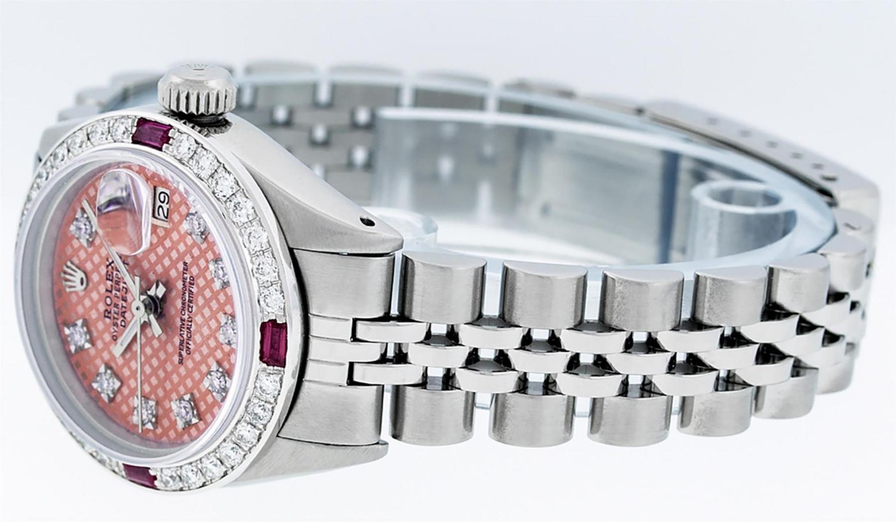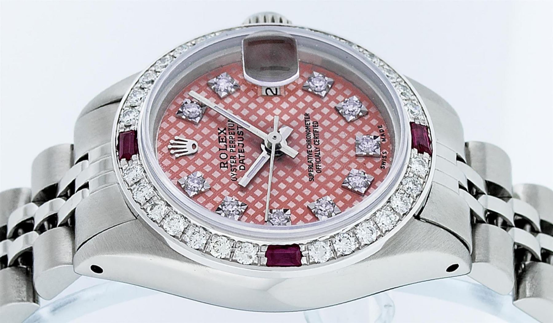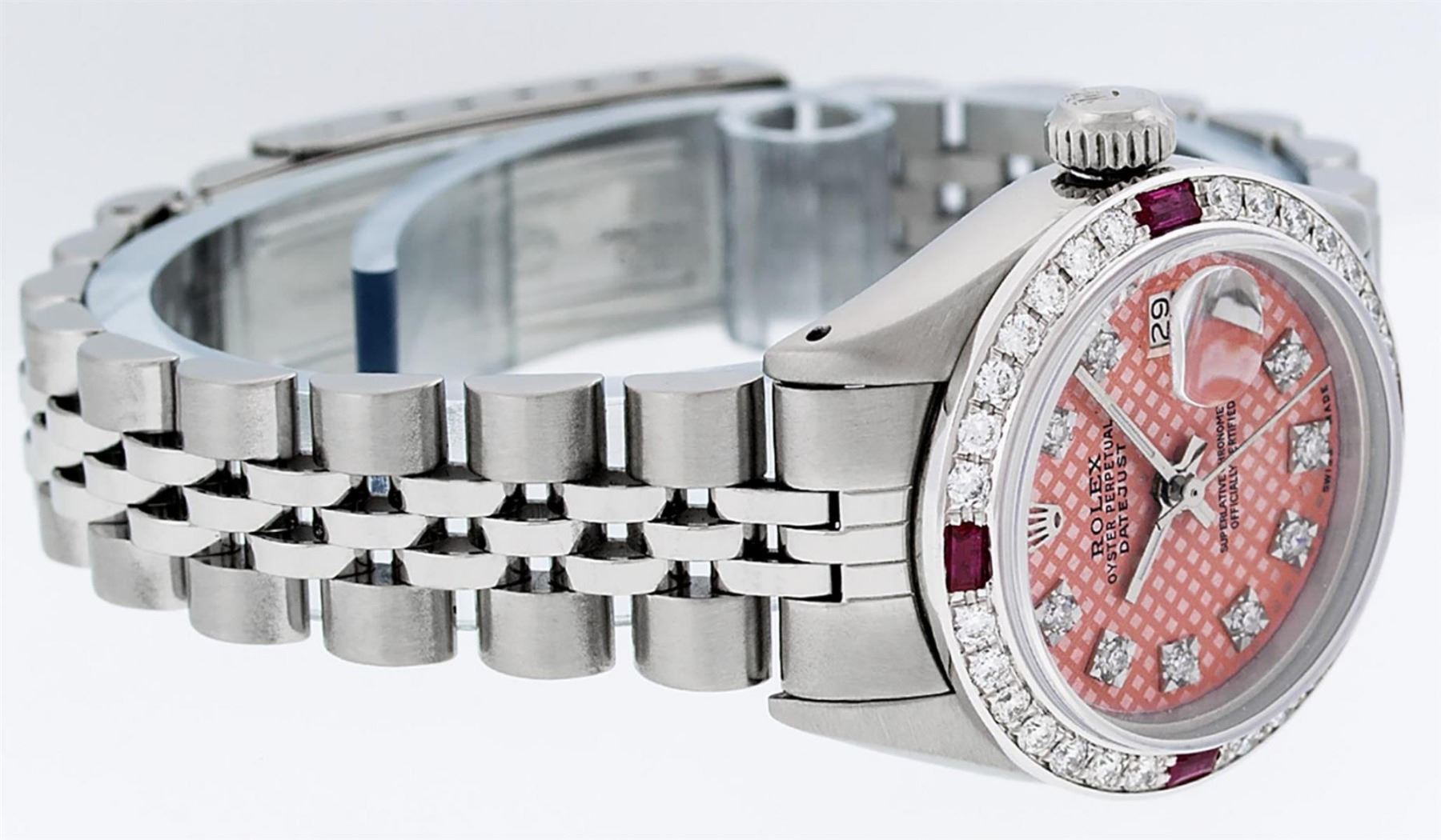 One Ladies Stainless Steel Rolex Datejust Polished Bright with Satin Finish, Serviced & Electronically Tested, Stainless Steel Case: 26mm, Stainless Steel Crown, Custom Bezel: New 18K White Ruby Beadset Diamond Bezel, Diamond + Gem Count: 28 Diamonds + 4 Rubies. Total Weight .70 Carat, Clarity: SI-VS, Color: G to H. Custom Crystal: New Scratch Resistant Synthetic Sapphire Cyclops Lens. Custom Hands: New Luminescent Hands. Movement: Automatic Winding Movement. Custom Dial: Salmon Stamp With Single Cut Diamond Hour Markers, 10 Diamonds in Dial, G To H In Color, Clarity: SI-VS. Date Window: 3 O'Clock Position Date Display, Model: Datejust. Condition: G-6 Extra Fine. Bracelet: Stainless Steel Jubilee Band. Bright Polish & Satin Finish. 6.0 Inch Length, Adjustable. Standard Clasp, With Rolex Logo. This Watch Has Been Serviced Time Tested And Is In Excellent Condition It Is Free Of All Scratches And Dents.