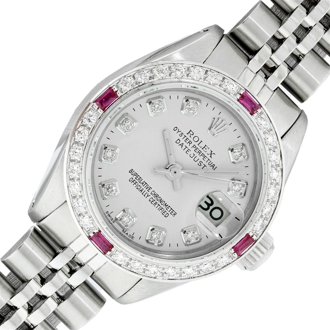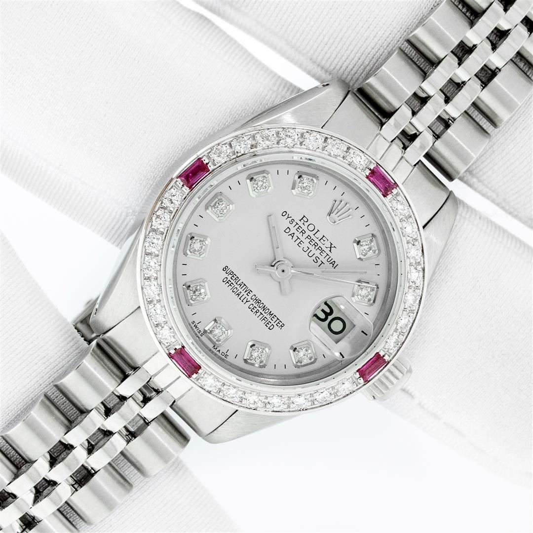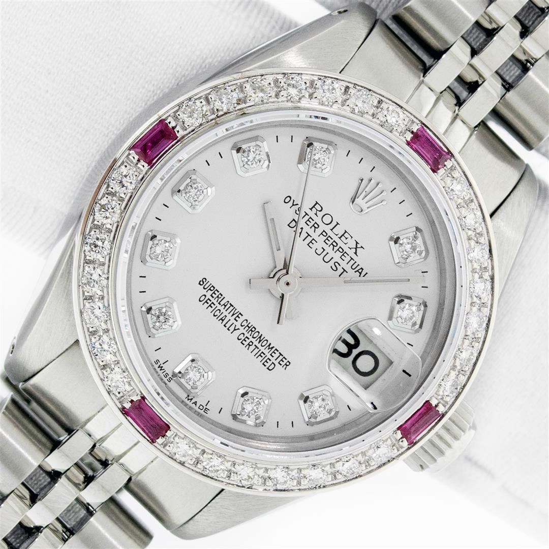 One Ladies Stainless Steel Rolex Datejust Polished Bright with Satin Finish, Serviced & Electronically Tested, Rolex Stainless Steel Case: 26mm, Rolex Stainless Steel Crown, Custom Bezel: New 18K White Gold Ruby Beadset Diamond Bezel, Diamond + Gem Count: 28 Diamonds + 4 Rubies. Clarity: SI-VS, Color: G to H. Custom Crystal: New Sapphire With Magnified Date Window. Custom Hands: New Luminescent Hands. Rolex Movement: Automatic Winding Movement. Custom Dial: Refinished To Silver With Custom Added Diamonds, 10 Diamonds in Dial, G To H In Color, Clarity: SI-VS. Date Window: 3 O'Clock Position Date Display, Model: Datejust. Condition: G-6 Extra Fine. Rolex Bracelet: Stainless Steel Jubilee Band. Bright Polish & Satin Finish. 6.0 Inch Length, Adjustable. Standard Clasp, With Rolex Logo. This Pre Owned Watch Has Been Serviced Time Tested And Is In Excellent Condition It Is Free Of All Scratches And Dents. This Watch Comes With A Rolex Box.