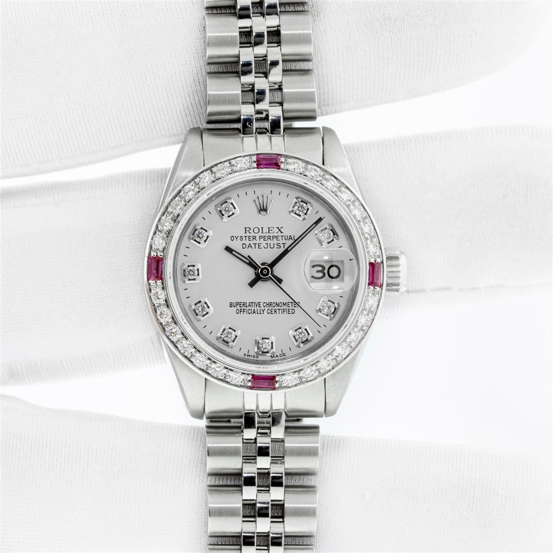 One Ladies Stainless Steel Rolex Datejust Polished Bright with Satin Finish, Serviced & Electronically Tested, Rolex Stainless Steel Case: 26mm, Rolex Stainless Steel Crown, Custom Bezel: New 18K White Gold Ruby Beadset Diamond Bezel, Diamond + Gem Count: 28 Diamonds + 4 Rubies. Clarity: SI-VS, Color: G to H. Custom Crystal: New Sapphire With Magnified Date Window. Custom Hands: New Luminescent Hands. Rolex Movement: Automatic Winding Movement. Custom Dial: Refinished To Silver With Custom Added Diamonds, 10 Diamonds in Dial, G To H In Color, Clarity: SI-VS. Date Window: 3 O'Clock Position Date Display, Model: Datejust. Condition: G-6 Extra Fine. Rolex Bracelet: Stainless Steel Jubilee Band. Bright Polish & Satin Finish. 6.0 Inch Length, Adjustable. Standard Clasp, With Rolex Logo. This Pre Owned Watch Has Been Serviced Time Tested And Is In Excellent Condition It Is Free Of All Scratches And Dents. This Watch Comes With A Rolex Box.