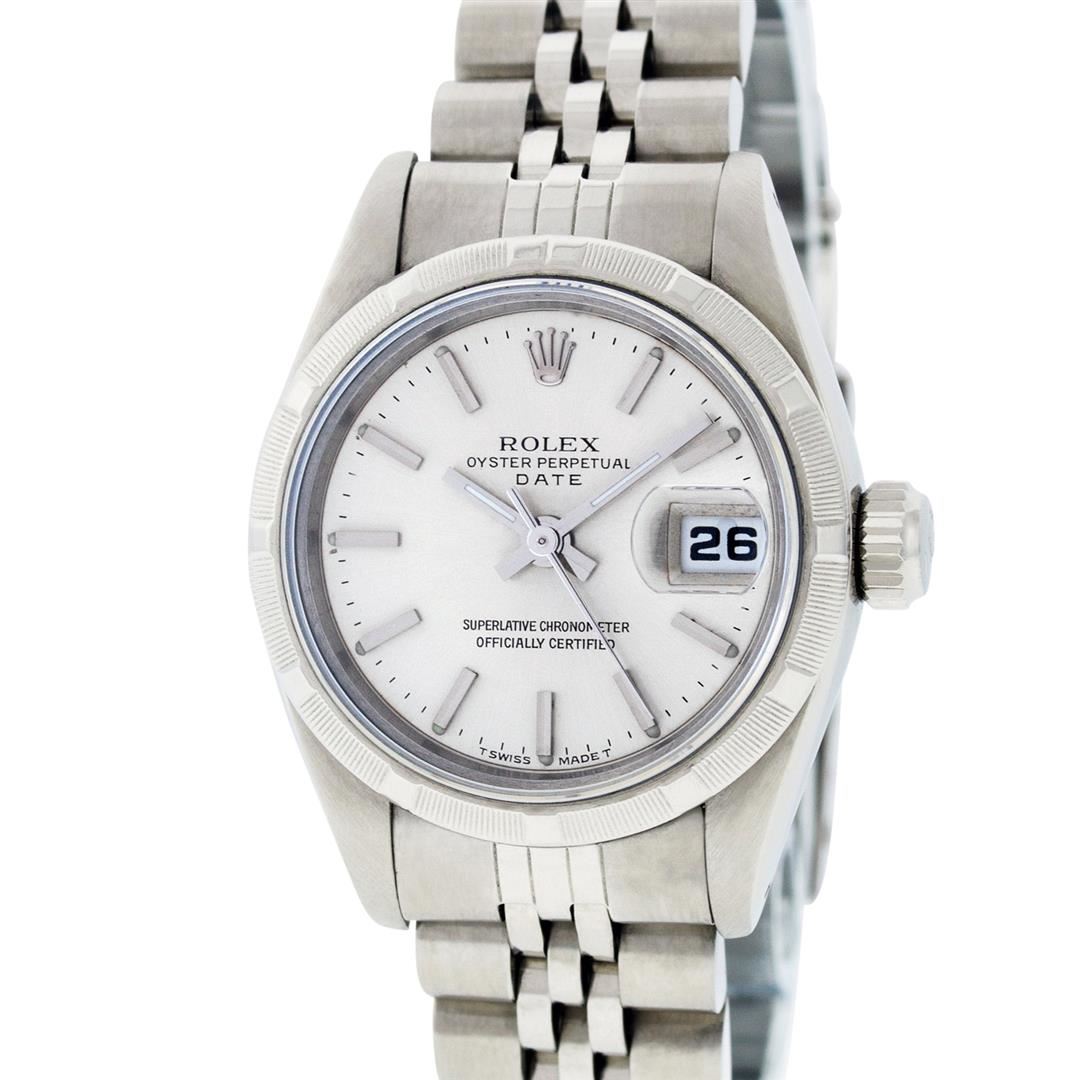 One Ladies Stainless Steel Rolex Datejust Polished Bright with Satin Finish, Serviced & Electronically Tested, Stainless Steel Case: 26mm, Stainless Steel Crown, Bezel: Stainless Steel Bezel. Custom Crystal: New Acrylic Cyclops Lens. Custom Hands: New Luminescent Hands. Movement: Automatic Winding Movement Caliber 2030. Dial: Silver Index Dial. Date Window: 3 O'Clock Position Date Display, Model: Datejust. Condition: G-6 Extra Fine. Bracelet: Stainless Steel Jubilee Band. Bright Polish & Satin Finish. 6.0 Inch Length, Adjustable. Standard Clasp, With Rolex Logo. This Watch Has Been Serviced Time Tested And Is In Excellent Condition It Is Free Of All Scratches And Dents.