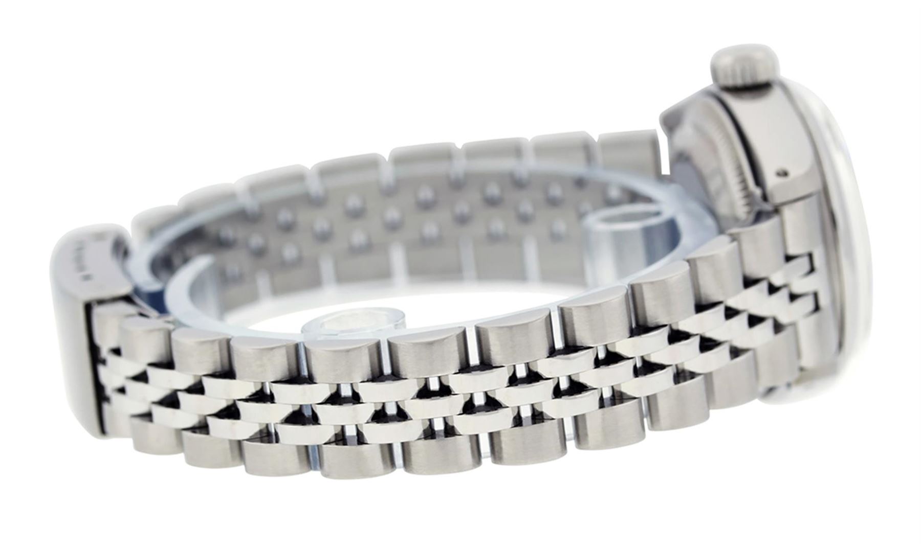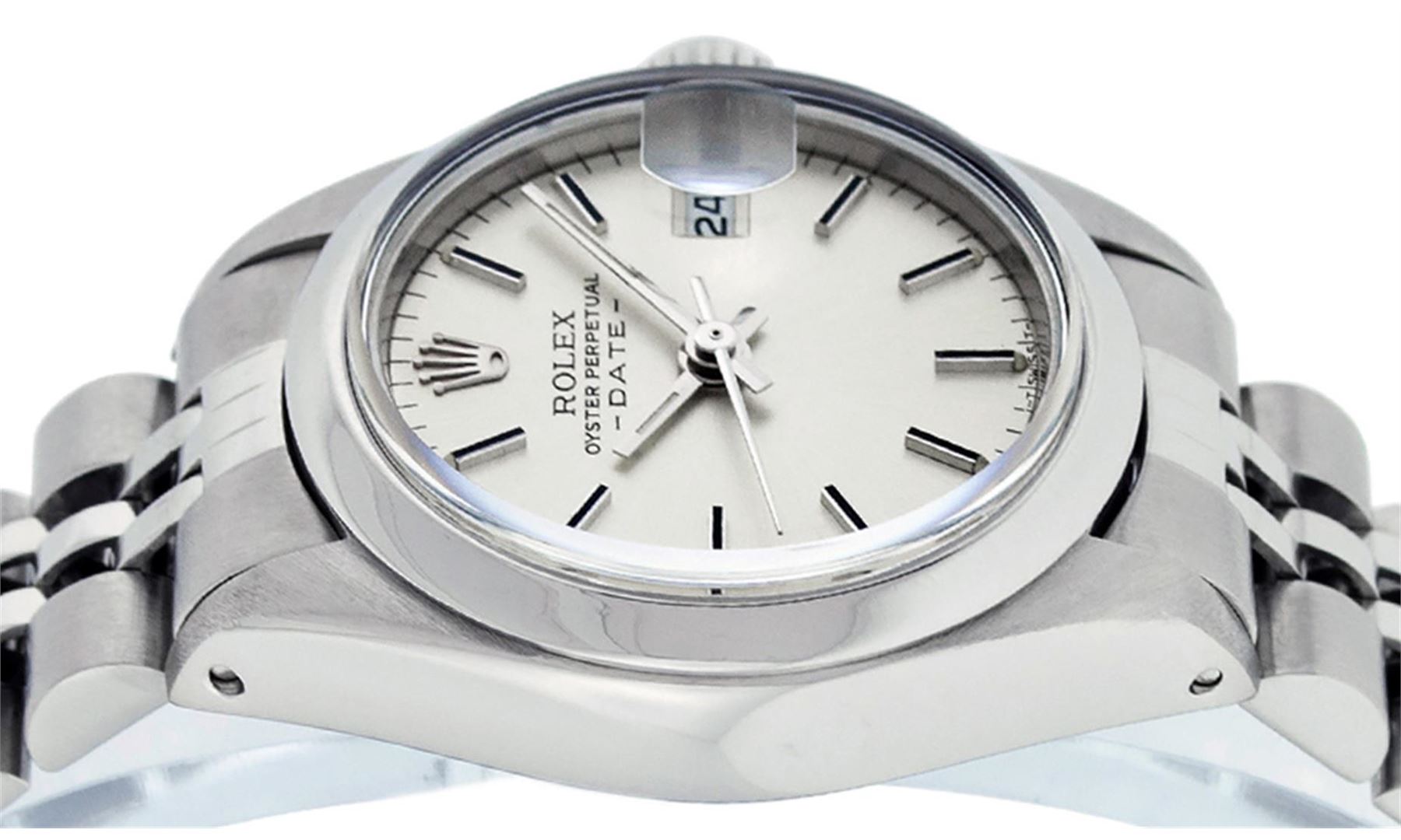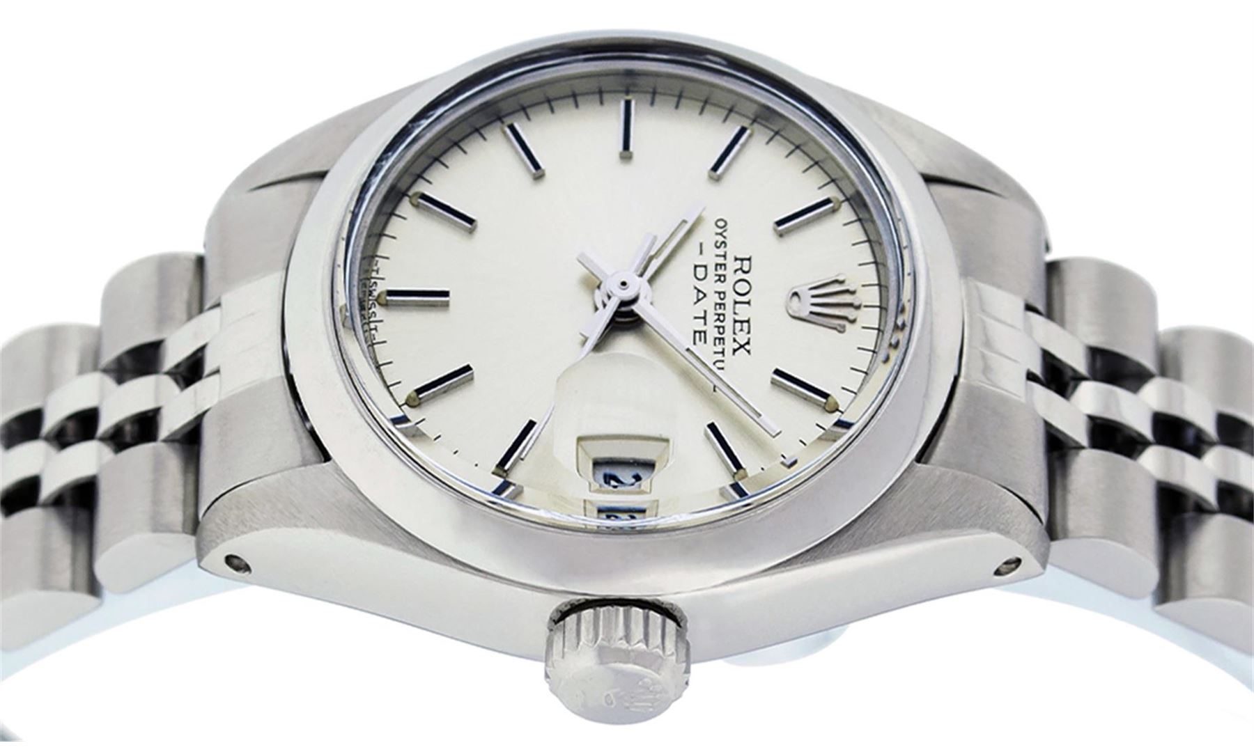 One Ladies Stainless Steel Rolex Datejust Polished Bright with Satin Finish, Serviced & Electronically Tested, Stainless Steel Case: 26mm, Stainless Steel Crown, Bezel: Stainless Steel Smooth Bezel. Custom Crystal: New Acrylic Cyclops Lens. Custom Hands: New Luminescent Hands. Movement: Automatic Winding Movement Caliber 2030. Dial: Silver Index Dial With Luminescent Dots. Date Window: 3 O'Clock Position Date Display, Model: Datejust. Condition: G-6 Extra Fine. Bracelet: Stainless Steel Jubilee Band. Bright Polish & Satin Finish. 6.0 Inch Length, Adjustable. Standard Clasp, With Rolex Logo. This Watch Has Been Serviced Time Tested And Is In Excellent Condition It Is Free Of All Scratches And Dents.