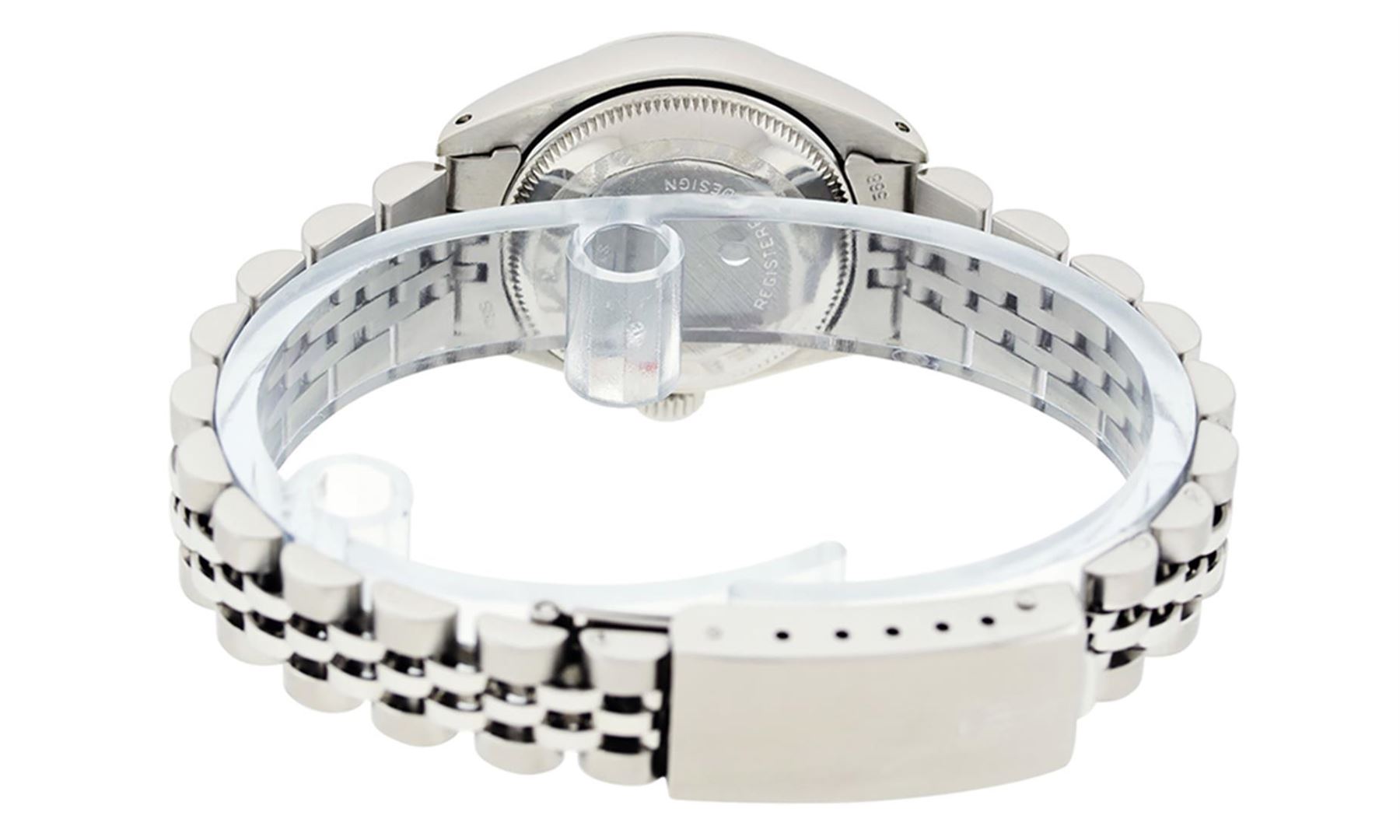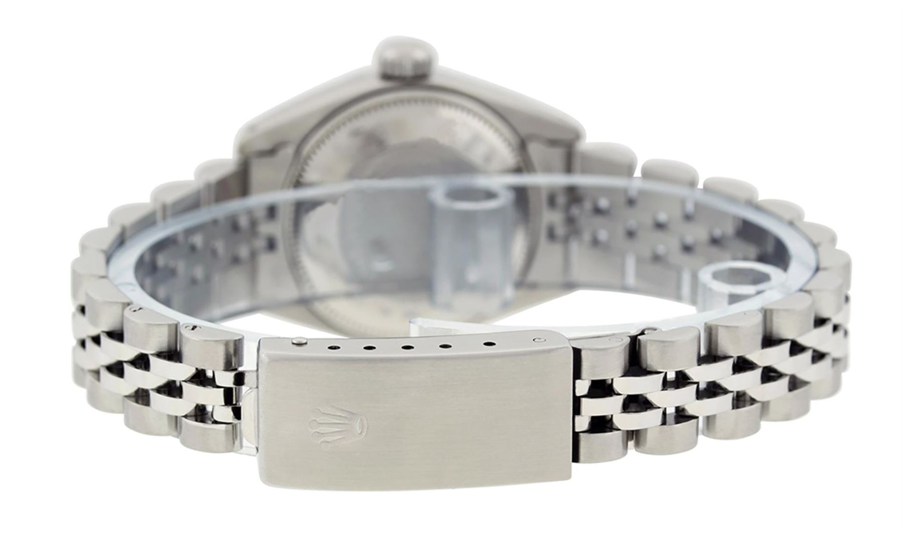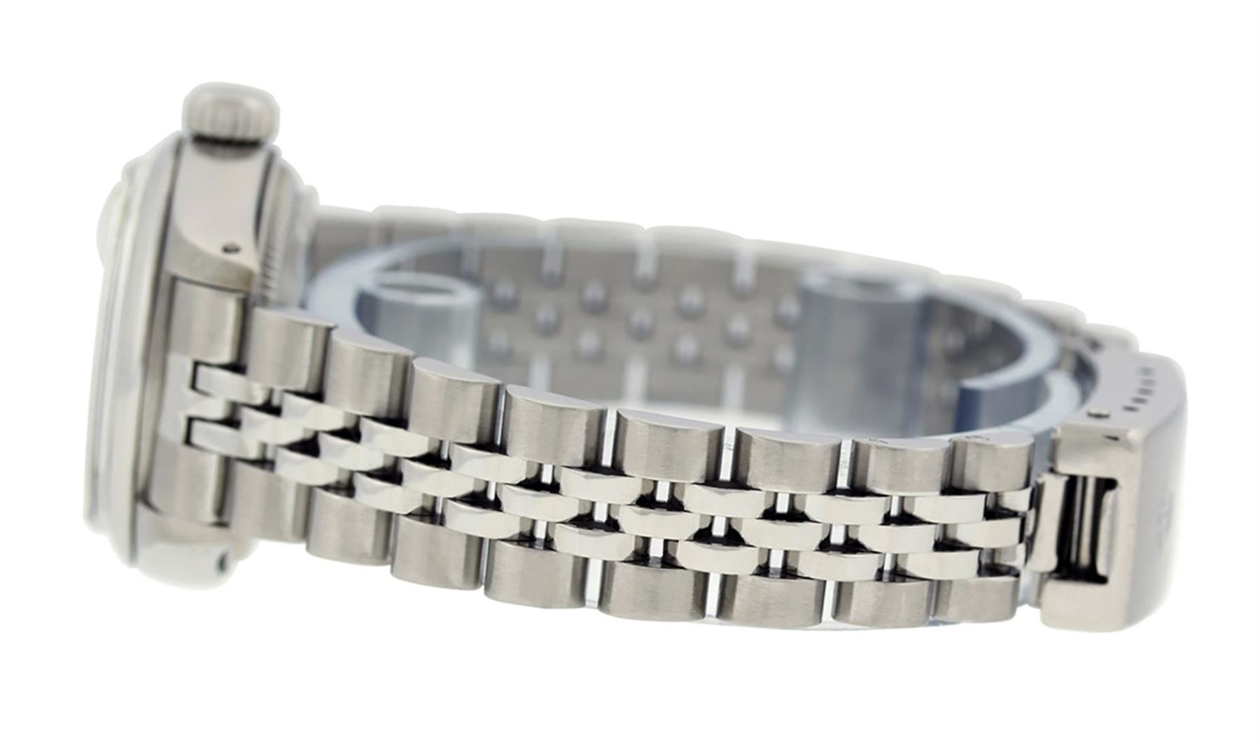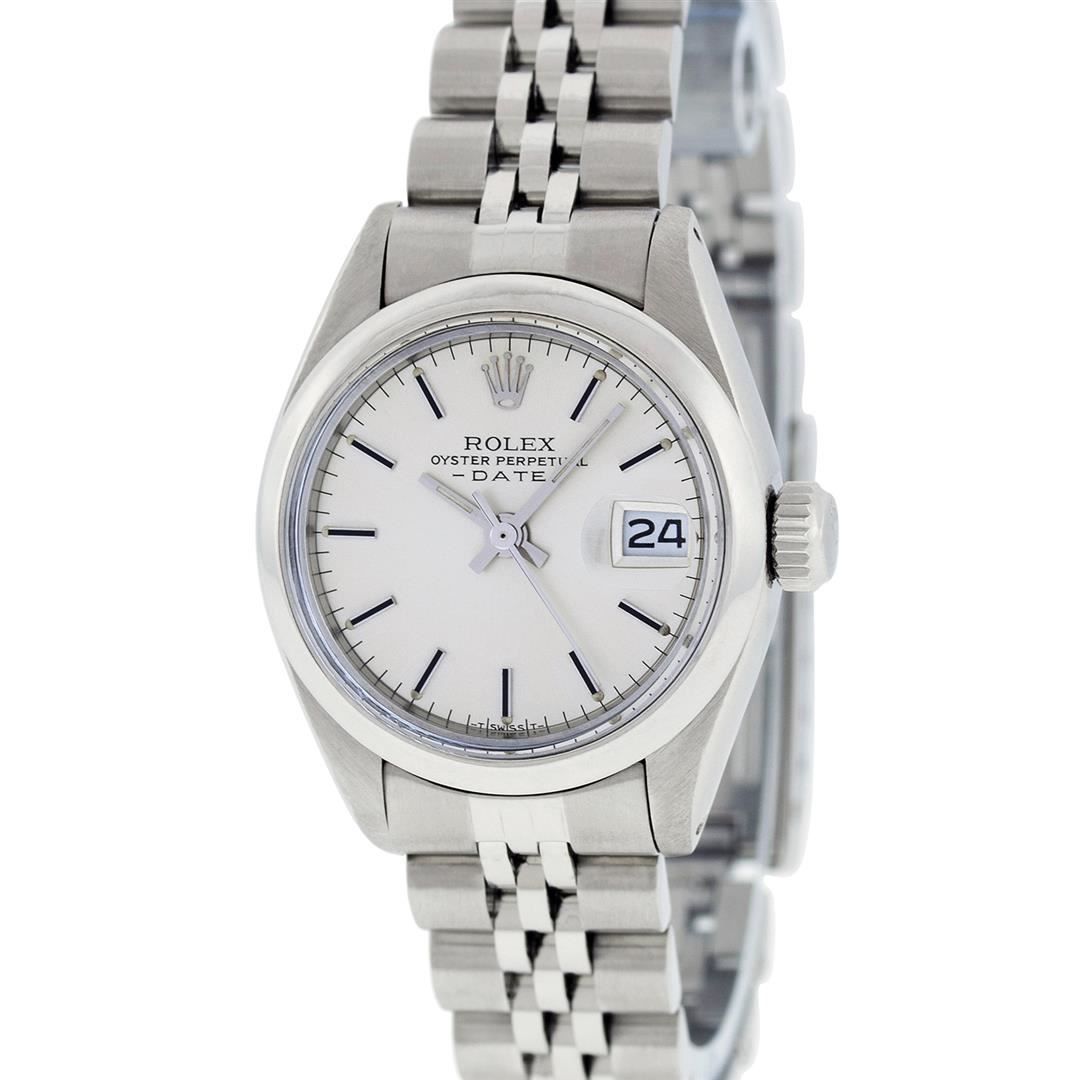 One Ladies Stainless Steel Rolex Datejust Polished Bright with Satin Finish, Serviced & Electronically Tested, Stainless Steel Case: 26mm, Stainless Steel Crown, Bezel: Stainless Steel Smooth Bezel. Custom Crystal: New Acrylic Cyclops Lens. Custom Hands: New Luminescent Hands. Movement: Automatic Winding Movement Caliber 2030. Dial: Silver Index Dial With Luminescent Dots. Date Window: 3 O'Clock Position Date Display, Model: Datejust. Condition: G-6 Extra Fine. Bracelet: Stainless Steel Jubilee Band. Bright Polish & Satin Finish. 6.0 Inch Length, Adjustable. Standard Clasp, With Rolex Logo. This Watch Has Been Serviced Time Tested And Is In Excellent Condition It Is Free Of All Scratches And Dents.