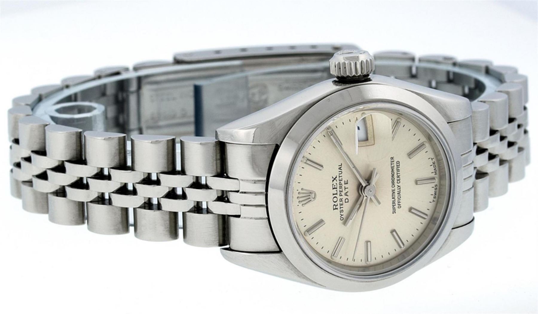 One Ladies Quickset Stainless Steel Rolex Datejust Polished Bright with Satin Finish, Serviced & Electronically Tested, Stainless Steel Case: 26mm, Stainless Steel Crown, Bezel: Stainless Steel Smooth Bezel. Custom Crystal: New Scratch Resistant Sapphire Cyclops Lens. Custom Hands: New Luminescent Hands. Movement: Automatic Winding Movement Caliber 2235. Dial: Silver Index Dial With Luminescent Dots & Dash Track. Date Window: 3 O'Clock Position Date Display, Model: Quickset Datejust. Condition: G-6 Extra Fine. Bracelet: Stainless Steel Jubilee Band. Bright Polish & Satin Finish. 6.0 Inch Length, Adjustable. Standard Clasp, With Rolex Logo. This Watch Has Been Serviced Time Tested And Is In Excellent Condition It Is Free Of All Scratches And Dents.