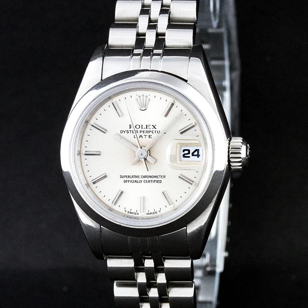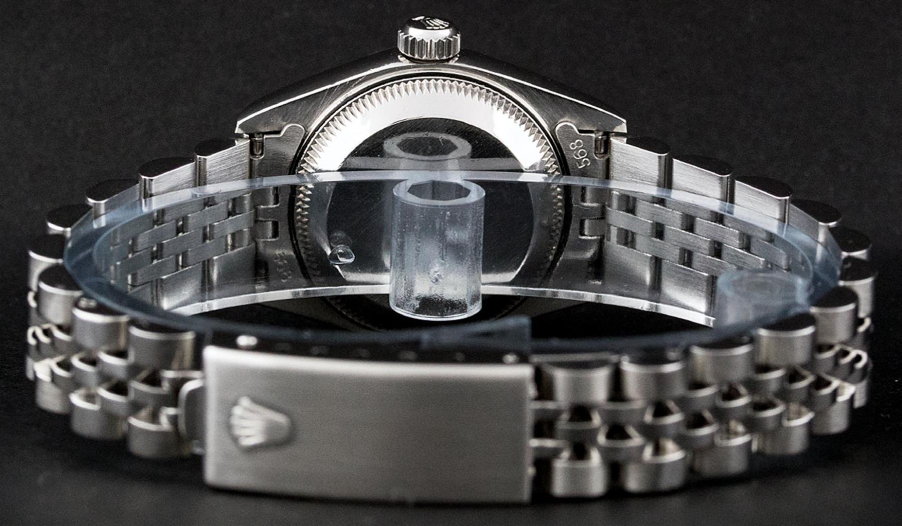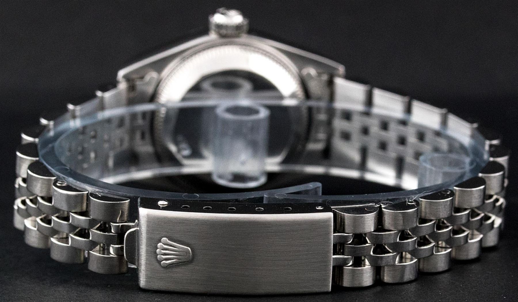 One Ladies Pre Owned Quickset Stainless Steel Rolex Datejust Polished Bright with Satin Finish, Serviced & Electronically Tested, Rolex Stainless Steel Case: 26mm, Rolex Stainless Steel Crown, Rolex Bezel: Stainless Steel Smooth Bezel. Rolex Crystal: Scratch Resistant Sapphire Cyclops Lens. Rolex Hands: Luminescent Hands. Rolex Movement: Automatic Winding Movement. Rolex Dial: Silver Index Dial With Luminescent Dots & Dash Track. Date Window: 3 O'Clock Position Date Display, Model: Quickset Datejust. Condition: G-6 Extra Fine. Rolex Bracelet: Stainless Steel Jubilee Band. Bright Polish & Satin Finish. 6.0 Inch Length, Adjustable. Standard Clasp, With Rolex Logo. This Watch Has Been Serviced Time Tested And Is In Excellent Condition It Is Free Of All Scratches And Dents.