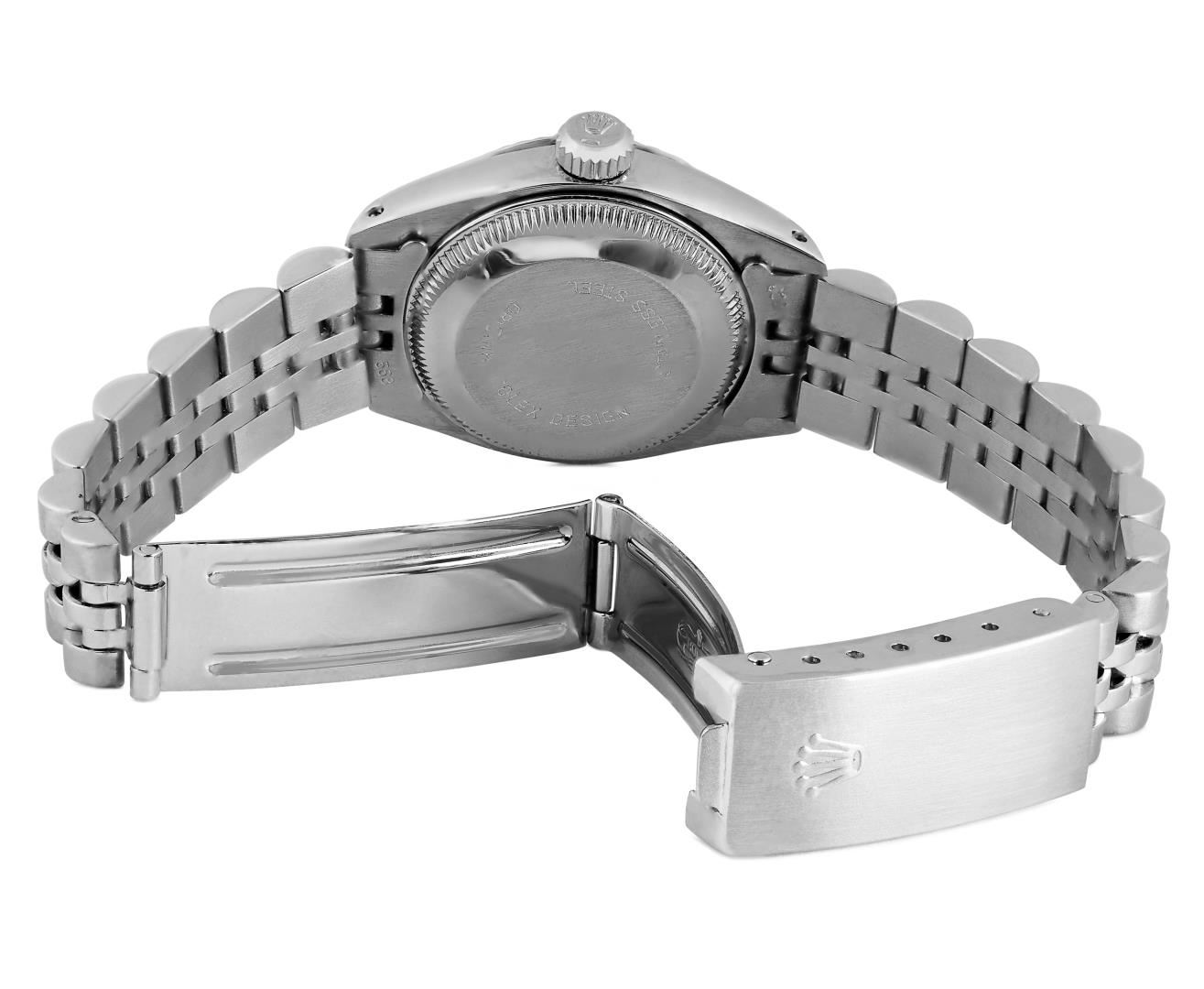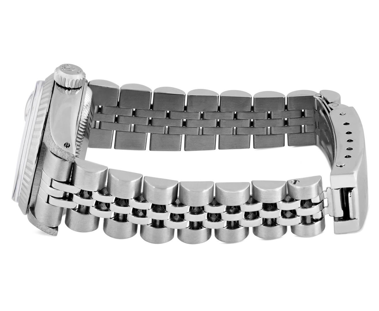 One Rolex Ladies Pre Owned Stainless Steel Date Wristwatch Polished Bright with Satin Finish, Serviced & Electronically Tested, Stainless Steel Case: 26mm, Stainless Steel Crown, 14K White Gold Fluted Bezel, Custom Crystal: New Acrylic With Magnifying Date Window. Custom Hands: New Luminescent Hands. Rolex Movement: Automatic Winding Movement 2035. Rolex Dial: Factory Silver With Index Hour Markers And Lumi Dots. Date Window: 3 O'Clock Position Date Display, Model: Date. Condition: G-6 Extra Fine. Rolex Bracelet: Stainless Steel Jubilee Band. Bright Polish & Satin Finish. 6.0 Inch Length, Adjustable. Standard Clasp, With Rolex Logo. This Watch Has Been Serviced Time Tested And Is In Excellent Condition. It Is Free Of All Scratches And Dents. This Watch Comes With A Rolex Box.