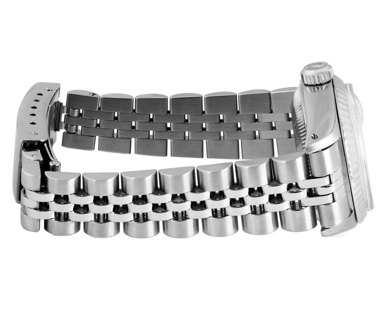 One Rolex Ladies Pre Owned Stainless Steel Date Wristwatch Polished Bright with Satin Finish, Serviced & Electronically Tested, Stainless Steel Case: 26mm, Stainless Steel Crown, 14K White Gold Fluted Bezel, Custom Crystal: New Acrylic With Magnifying Date Window. Custom Hands: New Luminescent Hands. Rolex Movement: Automatic Winding Movement 2035. Rolex Dial: Factory Silver With Index Hour Markers And Lumi Dots. Date Window: 3 O'Clock Position Date Display, Model: Date. Condition: G-6 Extra Fine. Rolex Bracelet: Stainless Steel Jubilee Band. Bright Polish & Satin Finish. 6.0 Inch Length, Adjustable. Standard Clasp, With Rolex Logo. This Watch Has Been Serviced Time Tested And Is In Excellent Condition. It Is Free Of All Scratches And Dents. This Watch Comes With A Rolex Box.