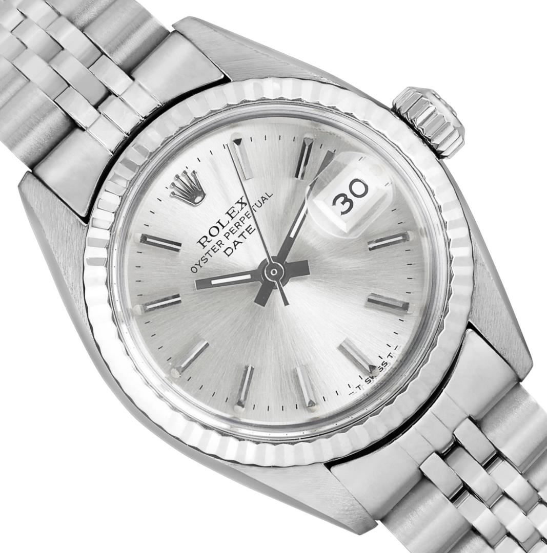 One Rolex Ladies Pre Owned Stainless Steel Date Wristwatch Polished Bright with Satin Finish, Serviced & Electronically Tested, Stainless Steel Case: 26mm, Stainless Steel Crown, 14K White Gold Fluted Bezel, Custom Crystal: New Acrylic With Magnifying Date Window. Custom Hands: New Luminescent Hands. Rolex Movement: Automatic Winding Movement 2035. Rolex Dial: Factory Silver With Index Hour Markers And Lumi Dots. Date Window: 3 O'Clock Position Date Display, Model: Date. Condition: G-6 Extra Fine. Rolex Bracelet: Stainless Steel Jubilee Band. Bright Polish & Satin Finish. 6.0 Inch Length, Adjustable. Standard Clasp, With Rolex Logo. This Watch Has Been Serviced Time Tested And Is In Excellent Condition. It Is Free Of All Scratches And Dents. This Watch Comes With A Rolex Box.