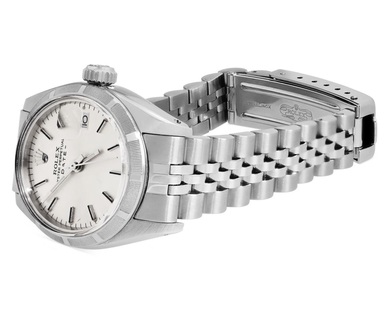 One Rolex Ladies Pre Owned Stainless Steel Date Wristwatch Polished Bright with Satin Finish, Serviced & Electronically Tested, Stainless Steel Case: 26mm, Stainless Steel Crown, Stainless Steel Engine Turn Bezel, Custom Crystal: New Acrylic With Magnifying Date Window. Custom Hands: New Luminescent Hands. Rolex Movement: Automatic Winding Movement 2035. Rolex Dial: Factory Silver With Index Hour Markers And Lumi Dots. Date Window: 3 O'clock Position Date Display, Model: Date. Condition: G-6 Extra Fine. Rolex Bracelet: Stainless Steel Jubilee Band. Bright Polish & Satin Finish. 6.0 Inch Length, Adjustable. Standard Clasp, With Rolex Logo. This Watch Has Been Serviced Time Tested And Is In Excellent Condition. It Is Free Of All Scratches And Dents.
