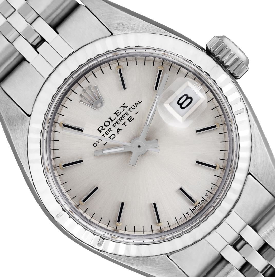 One Rolex Ladies Pre Owned Stainless Steel Date Wristwatch Polished Bright with Satin Finish, Serviced & Electronically Tested, Stainless Steel Case: 26mm, Stainless Steel Crown, 14K White Gold Fluted Bezel, Custom Crystal: New Acrylic With Magnifying Date Window. Custom Hands: New Luminescent Hands. Rolex Movement: Automatic Winding Movement 2035. Rolex Dial: Factory Silver With Index Hour Markers And Lumi Dots. Date Window: 3 O'Clock Position Date Display, Model: Date. Condition: G-6 Extra Fine. Rolex Bracelet: Stainless Steel Jubilee Band. Bright Polish And Satin Finish. 6.0 Inch Length, Adjustable. Standard Clasp, With Rolex Logo. This Watch Has Been Serviced Time Tested And Is In Excellent Condition. It Is Free Of All Scratches And Dents. This Watch Comes With A Rolex Box.