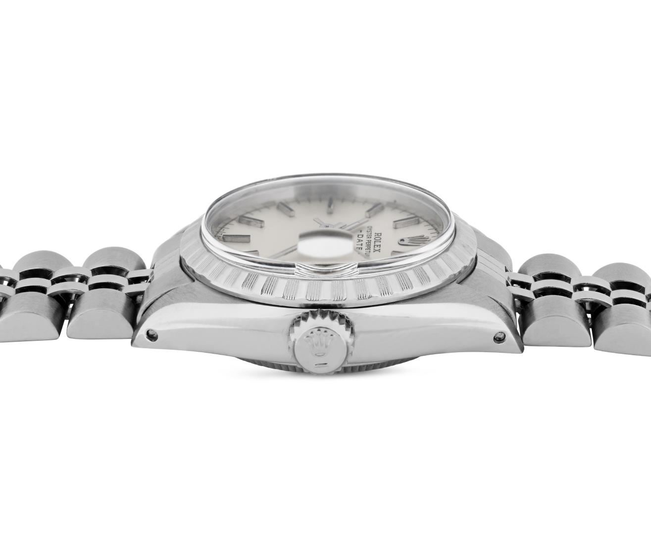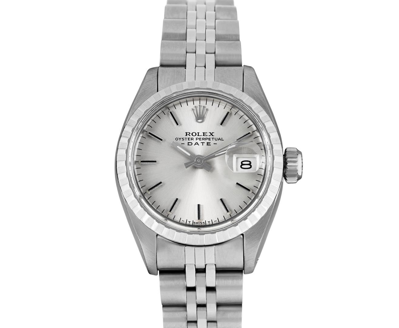One Rolex Ladies Pre Owned Stainless Steel Date Wristwatch Polished Bright with Satin Finish, Serviced & Electronically Tested, Stainless Steel Case: 26mm, Stainless Steel Crown, Stainless Steel Engine Turn Bezel, Custom Crystal: New Acrylic With Magnifying Date Window. Custom Hands: New Luminescent Hands. Rolex Movement: Automatic Winding Movement 2035. Rolex Dial: Factory Silver With Index Hour Markers And Lumi Dots. Date Window: 3 O'clock Position Date Display, Model: Date. Condition: G-6 Extra Fine. Rolex Bracelet: Stainless Steel Jubilee Band. Bright Polish & Satin Finish. 6.0 Inch Length, Adjustable. Standard Clasp, With Rolex Logo. This Watch Has Been Serviced Time Tested And Is In Excellent Condition. It Is Free Of All Scratches And Dents. This Watch Comes With A Rolex Box.