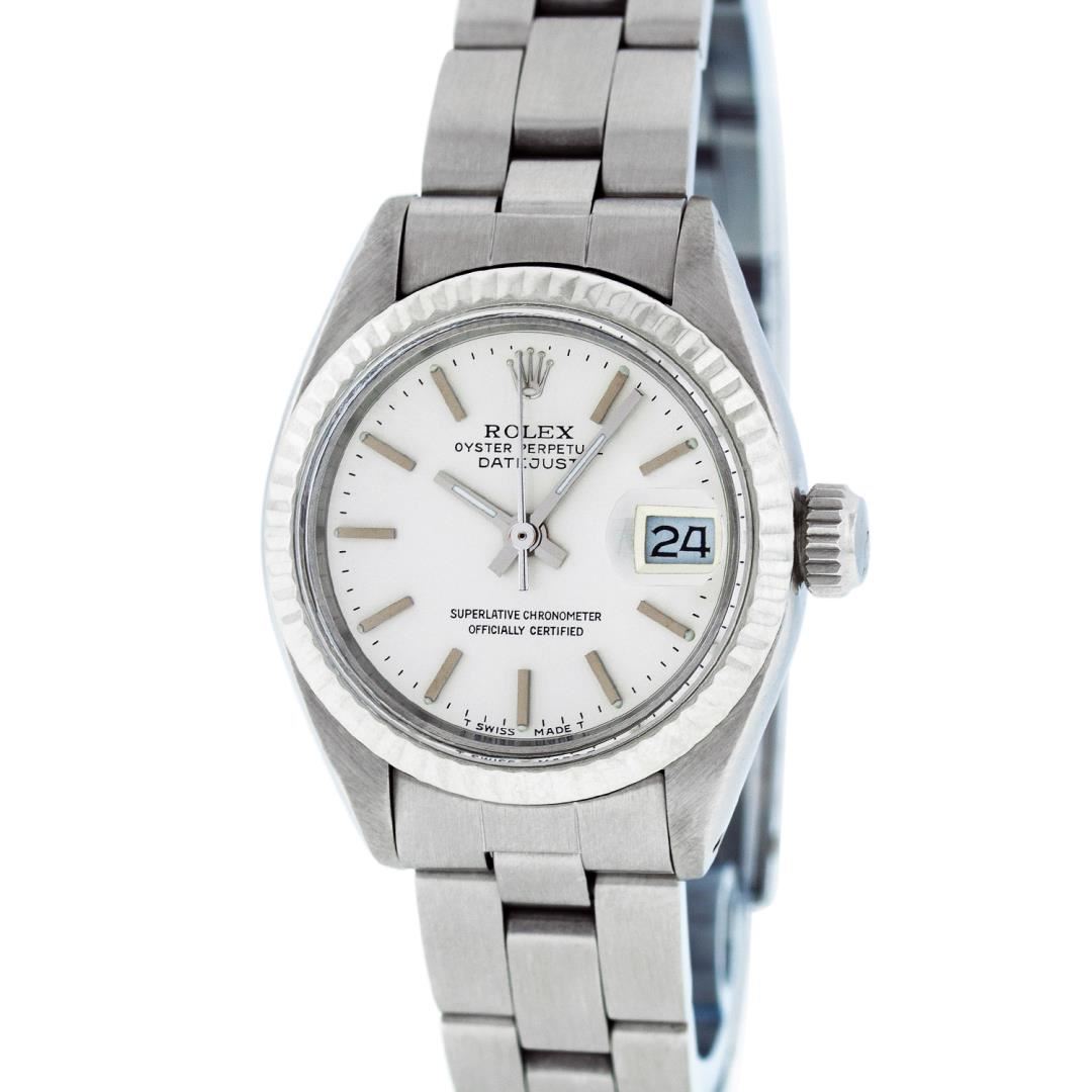 One Ladies Pre Owned Stainless Steel Rolex Polished Bright with Satin Finish, Serviced & Electronically Tested, Stainless Steel Case: 26mm, Stainless Steel Crown, Bezel: 14K White Gold Fluted Bezel. Custom Crystal: New Acrylic With Date Window. Custom Hands: New Luminescent Hands. Rolex Movement: Automatic Winding Movement. Rolex Dial: Silver Index With Dash Track. Date Window: 3 O'Clock Position Date Display, Model: Date. Condition: G-6 Extra Fine. Rolex Bracelet: Stainless Steel Oyster Band. Bright Polish & Satin Finish. 6.0 Inch Length, Adjustable. Standard Clasp, With Rolex Logo. This Watch Has Been Serviced Time Tested And Is In Excellent Condition It Is Free Of All Scratches And Dents.