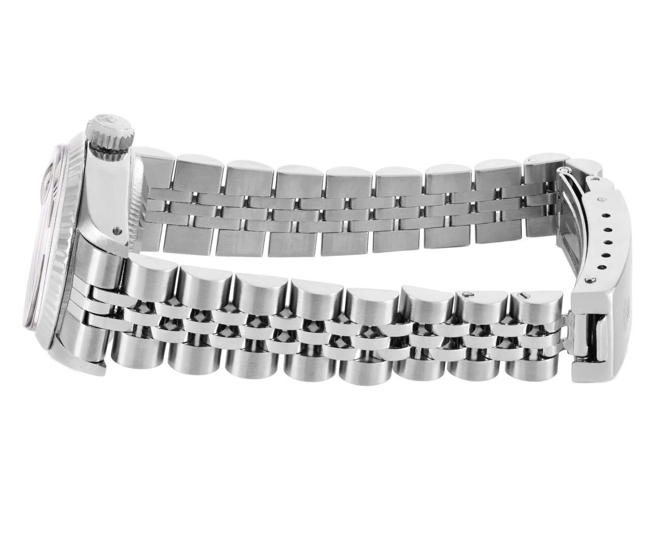One Rolex Ladies Pre Owned Stainless Steel Date Wristwatch Polished Bright with Satin Finish, Serviced & Electronically Tested, Stainless Steel Case: 26mm, Stainless Steel Crown, 14K White Gold Fluted Bezel, Custom Crystal: New Acrylic With Magnifying Date Window. Custom Hands: New Luminescent Hands. Rolex Movement: Automatic Winding Movement 2035. Rolex Dial: Factory Silver With Index Hour Markers, Dash Tracks, And Lumi Dots. Date Window: 3 O'clock Position Date Display, Model: Date. Condition: G-6 Extra Fine. Rolex Bracelet: Stainless Steel Jubilee Band. Bright Polish & Satin Finish. 6.0 Inch Length, Adjustable. Standard Clasp, With Rolex Logo. This Watch Has Been Serviced Time Tested And Is In Excellent Condition. It Is Free Of All Scratches And Dents.