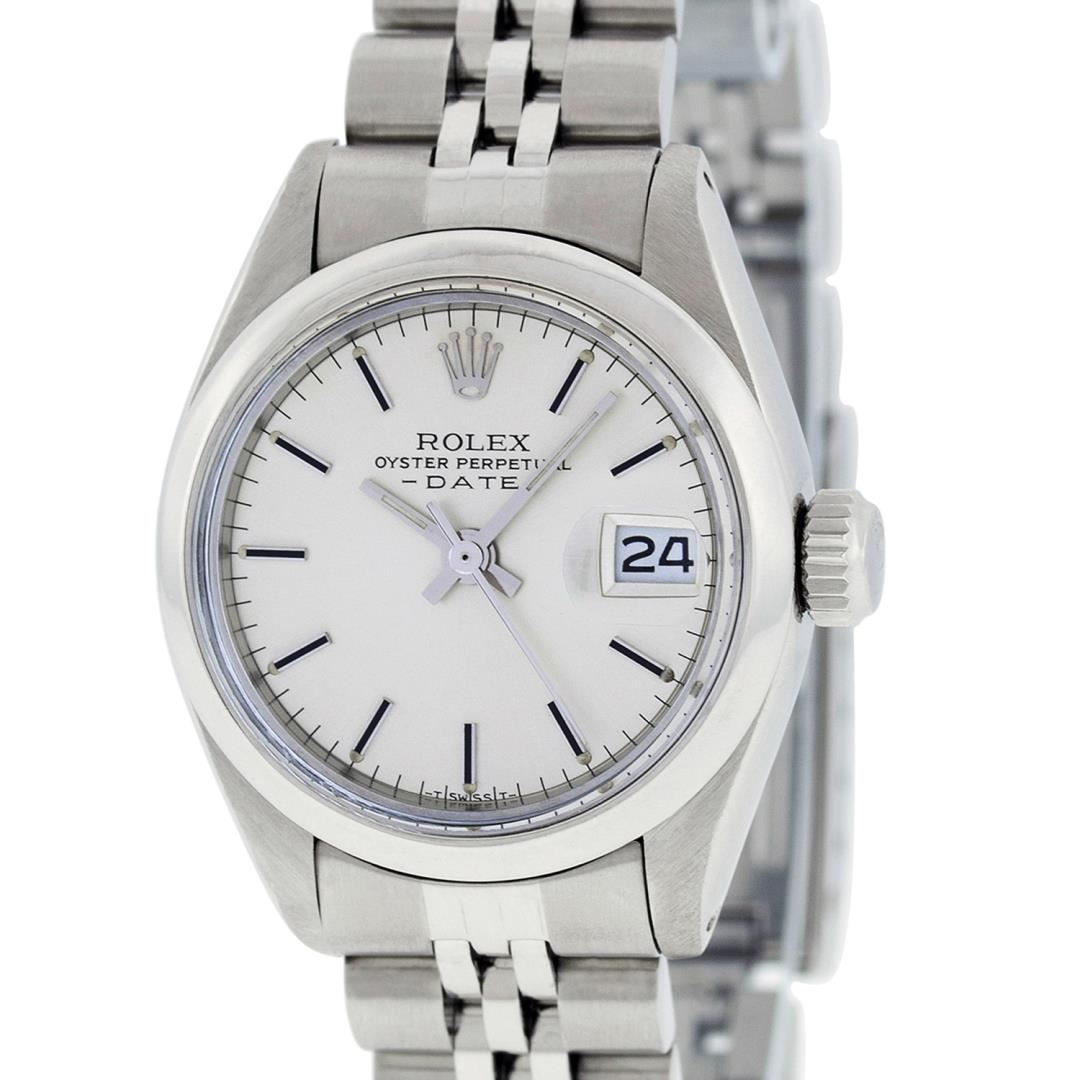 One Ladies Pre Owned Stainless Steel Rolex Date Polished Bright with Satin Finish, Serviced & Electronically Tested, Rolex Stainless Steel Case: 26mm, Rolex Stainless Steel Crown, Rolex Bezel: Stainless Steel Smooth Bezel. Custom Crystal: New Acrylic With Magnified Date Window. Custom Hands: New Luminescent Hands. Rolex Movement: Automatic Winding Movement. Rolex Dial: Silver Index Dial With Luminescent Dots And Dash Track. Date Window: 3 O'Clock Position Date Display, Model: Date. Condition: G-6 Extra Fine. Rolex Bracelet: Stainless Steel Jubilee Band. Bright Polish & Satin Finish. 6.0 Inch Length, Adjustable. Standard Clasp, With Rolex Logo. This Watch Has Been Serviced Time Tested And Is In Excellent Condition It Is Free Of All Scratches And Dents.