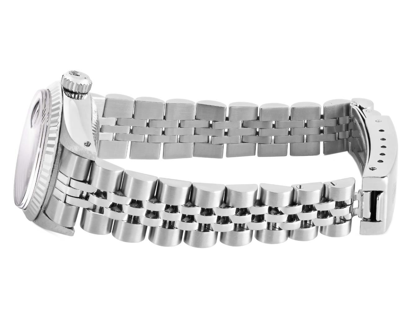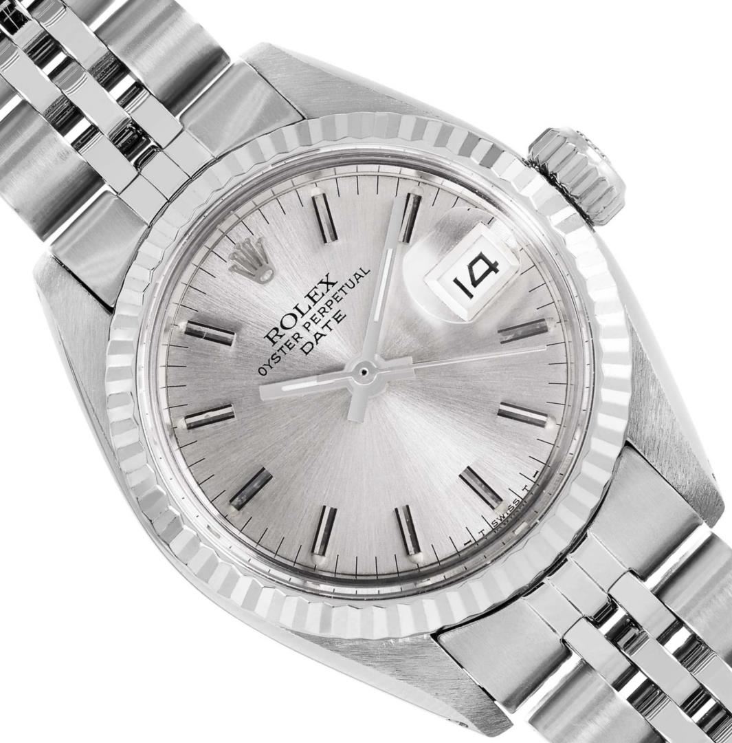 One Rolex Ladies Pre Owned Stainless Steel Date Wristwatch Polished Bright with Satin Finish, Serviced & Electronically Tested, Stainless Steel Case: 26mm, Stainless Steel Crown, 14K White Gold Fluted Bezel, Custom Crystal: New Acrylic With Magnifying Date Window. Custom Hands: New Luminescent Hands. Rolex Movement: Automatic Winding Movement 2030. Rolex Dial: Factory Silver With Index Hour Markers And Lumi Dots. Date Window: 3 O'Clock Position Date Display, Model: Date. Condition: G-6 Extra Fine. Rolex Bracelet: Stainless Steel Jubilee Band. Bright Polish & Satin Finish. 6.0 Inch Length, Adjustable. Standard Clasp, With Rolex Logo. This Watch Has Been Serviced Time Tested And Is In Excellent Condition. It Is Free Of All Scratches And Dents.