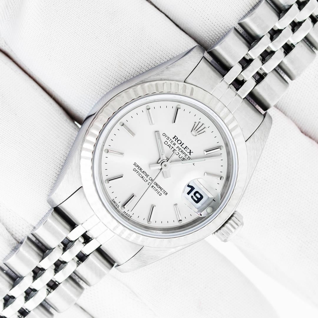 One Ladies Pre Owned Quickset Stainless Steel Rolex Datejust Polished Bright with Satin Finish, Serviced & Electronically Tested, Stainless Steel Case: 26mm, Rolex Stainless Steel Crown, Rolex Bezel: 18K White Gold Fluted Bezel. Crystal: Sapphire With Magnified Date Window. Custom Hands: Luminescent Hands. Rolex Movement: Automatic Winding Movement 2235. Rolex Dial: Silver Index With Dash Track & Lumi Dots. Date Window: 3 O'Clock Position Date Display, Model: Quickset Datejust. Condition: G-6 Extra Fine. Rolex Bracelet: Stainless Steel Jubilee Band. Bright Polish & Satin Finish. 6.0 Inch Length, Adjustable. Standard Clasp, With Rolex Logo. This Watch Has Been Serviced Time Tested And Is In Excellent Condition It Is Free Of All Scratches And Dents.