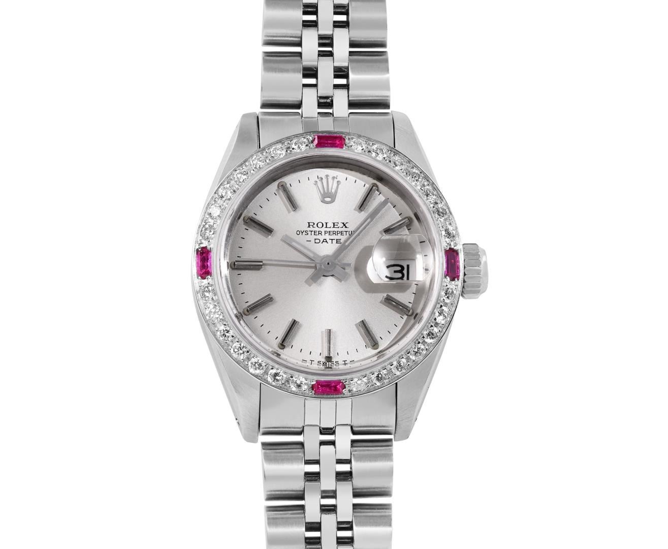 One Rolex Ladies Pre Owned Stainless Steel Date Wristwatch Polished Bright with Satin Finish, Serviced & Electronically Tested, Stainless Steel Case: 26mm, Stainless Steel Crown, Custom Bezel: New 18K White Gold Ruby Beadset Diamond Bezel, Diamond + Gem Count: 36 Diamonds + 4 Rubies, Clarity: SI-VS, Color: G to H. Custom Crystal: New Sapphire With Magnified Date Window. Custom Hands: New Luminescent Hands. Rolex Movement: Automatic Winding Movement 2030. Rolex Dial: Factory Silver Dial With Index Hour Markers and Lumi Markers, Dash Track, and Lumi Dots. Date Window: 3 O'Clock Position Date Display, Model: Date. Condition: G-6 Extra Fine. Rolex Bracelet: Stainless Steel Jubilee Band. Bright Polish & Satin Finish. 6.0 Inch Length, Adjustable. Standard Clasp, With Rolex Logo. This Watch Has Been Serviced Time Tested And Is In Excellent Condition. It Is Free Of All Scratches And Dents.