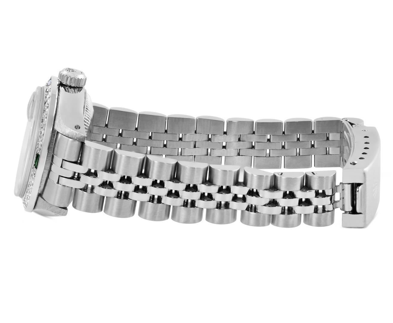 One Rolex Ladies Pre Owned Stainless Steel Date Wristwatch Polished Bright with Satin Finish, Serviced And Electronically Tested, Stainless Steel Case: 26mm, Stainless Steel Crown, Custom Bezel: New 18K White Gold Emerald Beadset Diamond Bezel, Diamond + Gem Count: 36 Diamonds + 4 Emeralds. Custom Crystal: New Sapphire With Magnified Date Window. Custom Hands: New Luminescent Hands. Rolex Movement: Automatic Winding Movement 2035. Rolex Dial: Factory Silver With Index Hour Markers, Lumi Dots, and Dash Tracks. Date Window: 3 O'Clock Position Date Display, Model: Date. Condition: G-6 Extra Fine. Rolex Bracelet: Stainless Steel Jubilee Band. Bright Polish & Satin Finish. 6.0 Inch Length, Adjustable. Standard Clasp, With Rolex Logo. This Watch Has Been Serviced Time Tested And Is In Excellent Condition. It Is Free Of All Scratches And Dents.